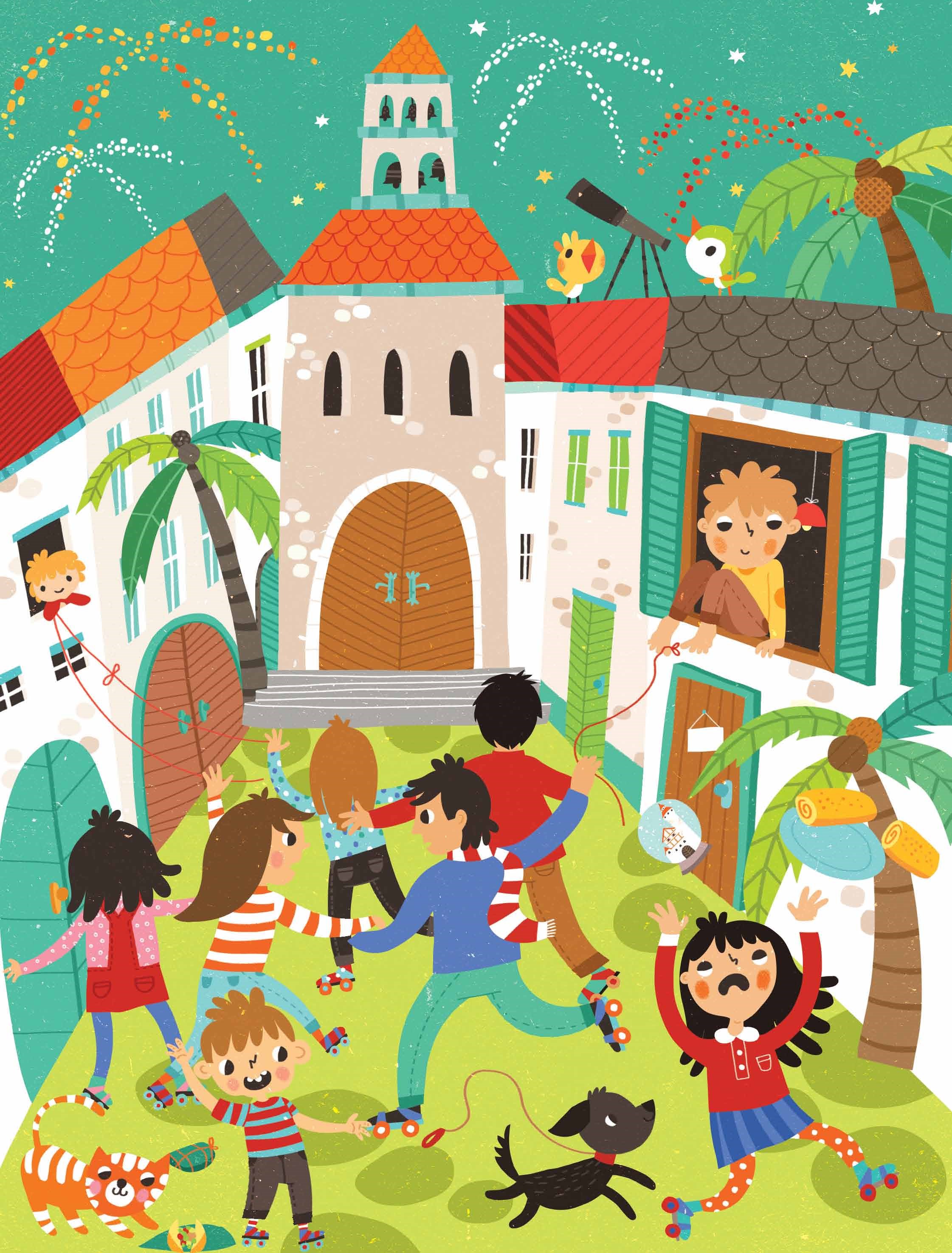 Slovensko v nej síce nenájdete, no môžete použiť dvojstranu venovanú našim susedom nakoľko je na nej rodina pod stromčekom ako rozbaľuje darčeky, starý otec spiaci v kresle a stará mama krájajúca vianočku. Úlohy sú v knihe dvojaké. Jedny sú zamerané na precvičovanie a zdokonaľovanie všeobecných schopností: hľadanie dvojíc, vyfarbovanie, priraďovanie tieňov, hľadanie správnej cestičky. Druhou je hľadanie Šimona, Daniela, Ludvíka a snehovej gule na každej strane (a veru niekedy sa vedia loptoši malí poriadne ukryť!).