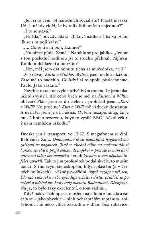 Martin Amis s příznačnou stylistickou bravurou rozehrává trojí part v podání toho, kdo dal soukolí Osvětimi do pohybu, toho, kdo v něm přišel i o možnost podívat se komukoliv do očí, a toho, kdo se ho pozdě, ale přece pokusí malinko rozklížit.