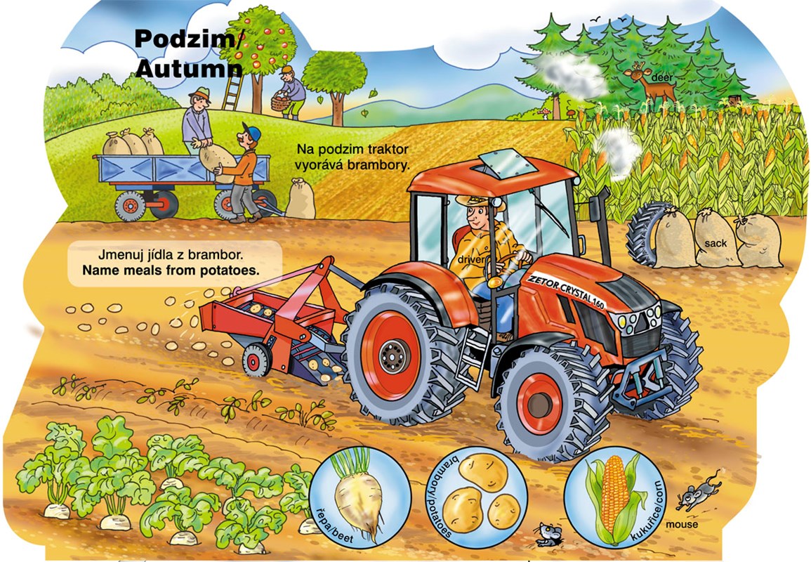 Veselé obrázkové leporelo seznámí zvídavé kluky a holčičky s tím, co dělá traktor v průběhu celého roku. Ke všem obrázkům jsou připraveny jednoduché úkoly a jsou v nich vyznačena základní anglická slovíčka. Na každé stránce si navíc děti mohou procvičit postřeh a zahrát si na detektiva. Podaří se jim vypátrat, kam se zakutálela pneumatika?