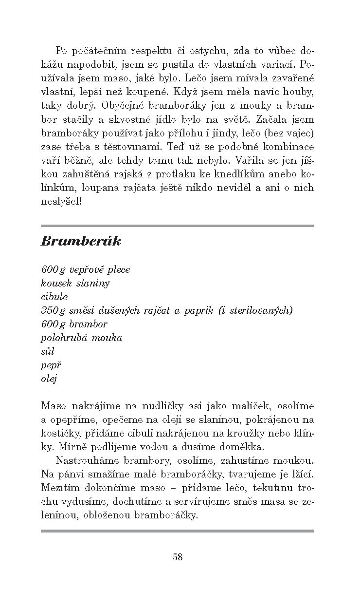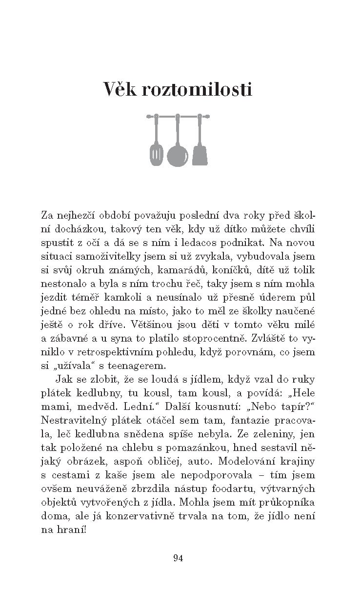 Ve své druhé knize autorka vzpomíná, jak se žilo v okresním městě pod horami a jak si po svatbě zařizovala vlastní domácnost a zvykala si na nové prostředí, tak odlišné od velkoměsta. Nakonec všechno zvládla – výchovu potomka i místní kyselo. Vaření se stalo jejím koníčkem a časem i pracovní náplní. A pak vtrhly do života i do kuchyně polistopadové změny: nové suroviny, kontakty se světem a první zážitky z cestování. Vyprávění doprovázejí dobové recepty.