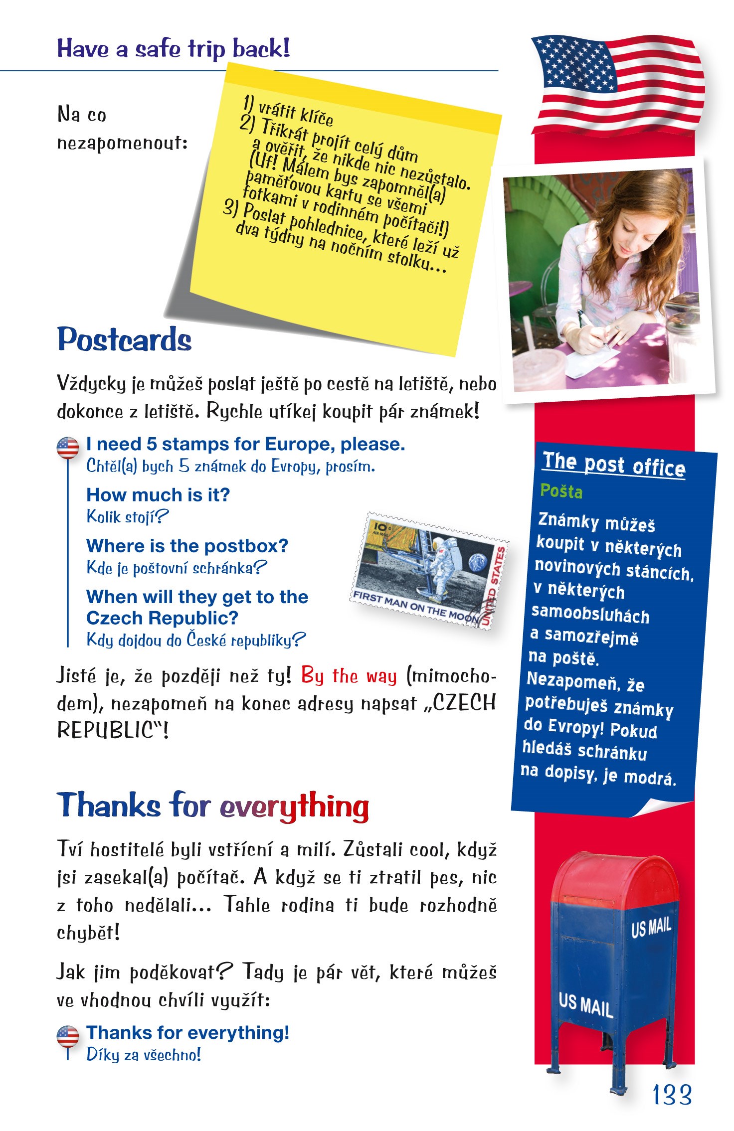 • 18 kapitol k různým etapám pobytu (příjezd, jídla a večery s rodinou, studium, noví přátele, volnočasové aktivity, nákupy, výlety ...)