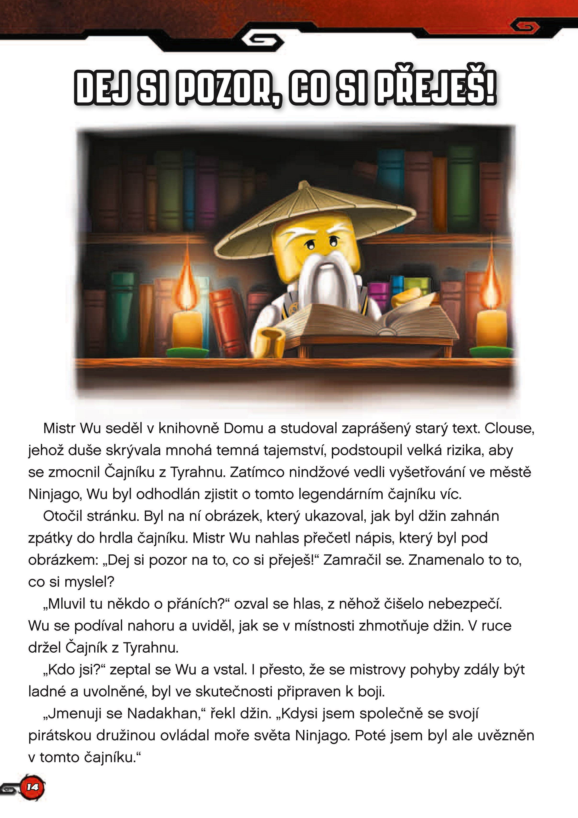 Nindžové zažívají další dobrodružství! Tentokrát se musejí utkat s tajuplným džinem Nadakhanem a jeho družinou pirátů. V nebezpečí není jen město Ninjago a nindžové, ale také mistr Chen. Vydej se udatným nindžům na pomoc, bojuj po jejich boku a vyřeš různé úkoly, hádanky a hlavolamy. Kromě nich najdeš v knize také příběh, ve kterém zjistíš, jak proběhl boj mezi Nadakhanem a mistrem Chenem, a minifigurku Jaye zdarma.