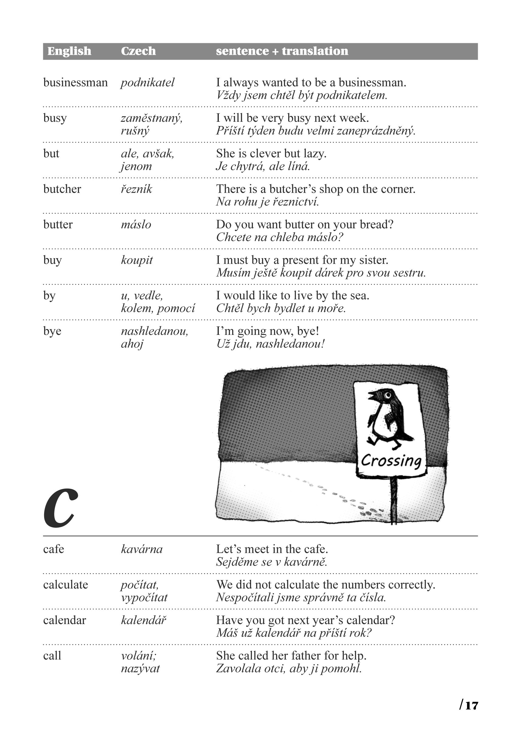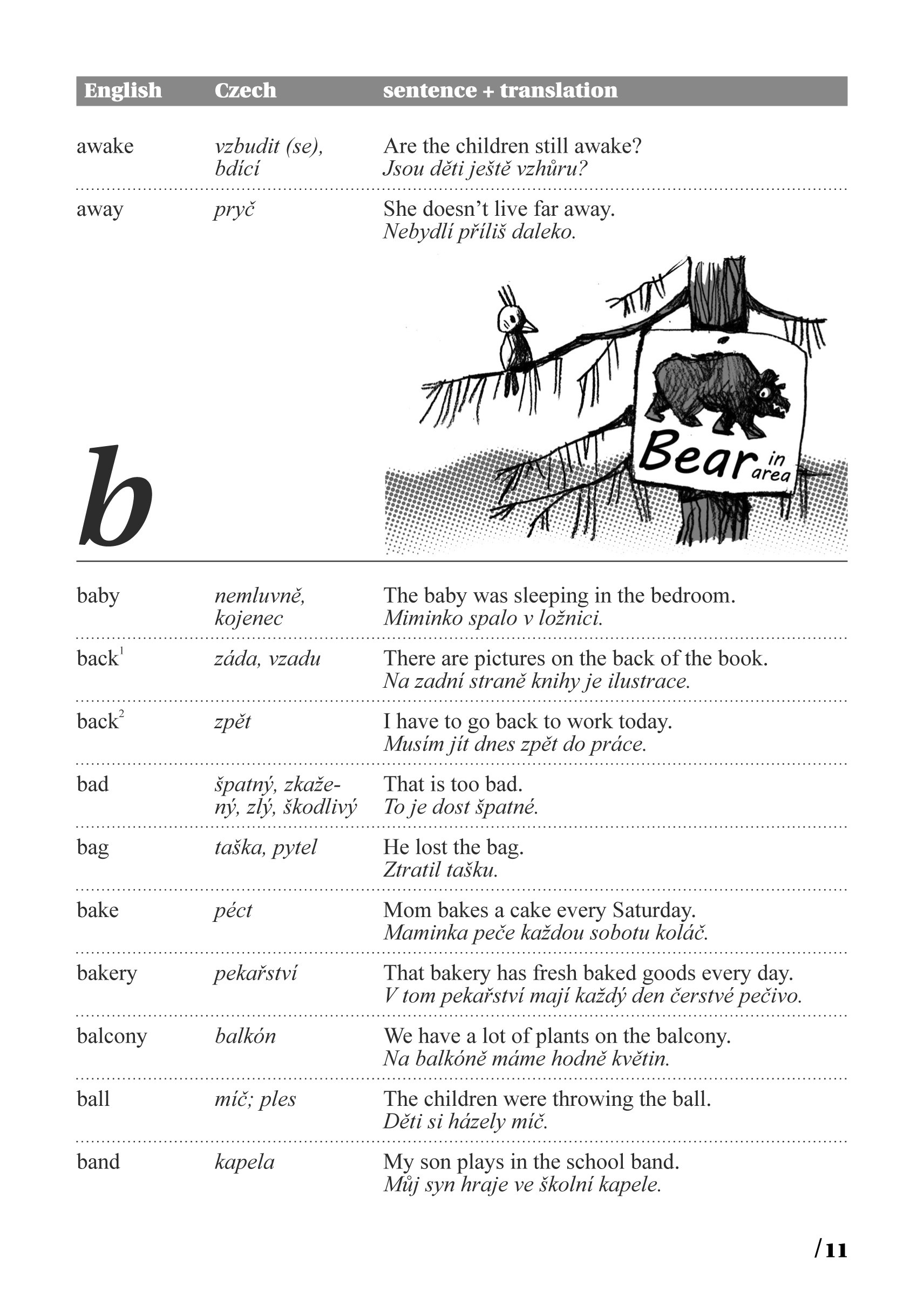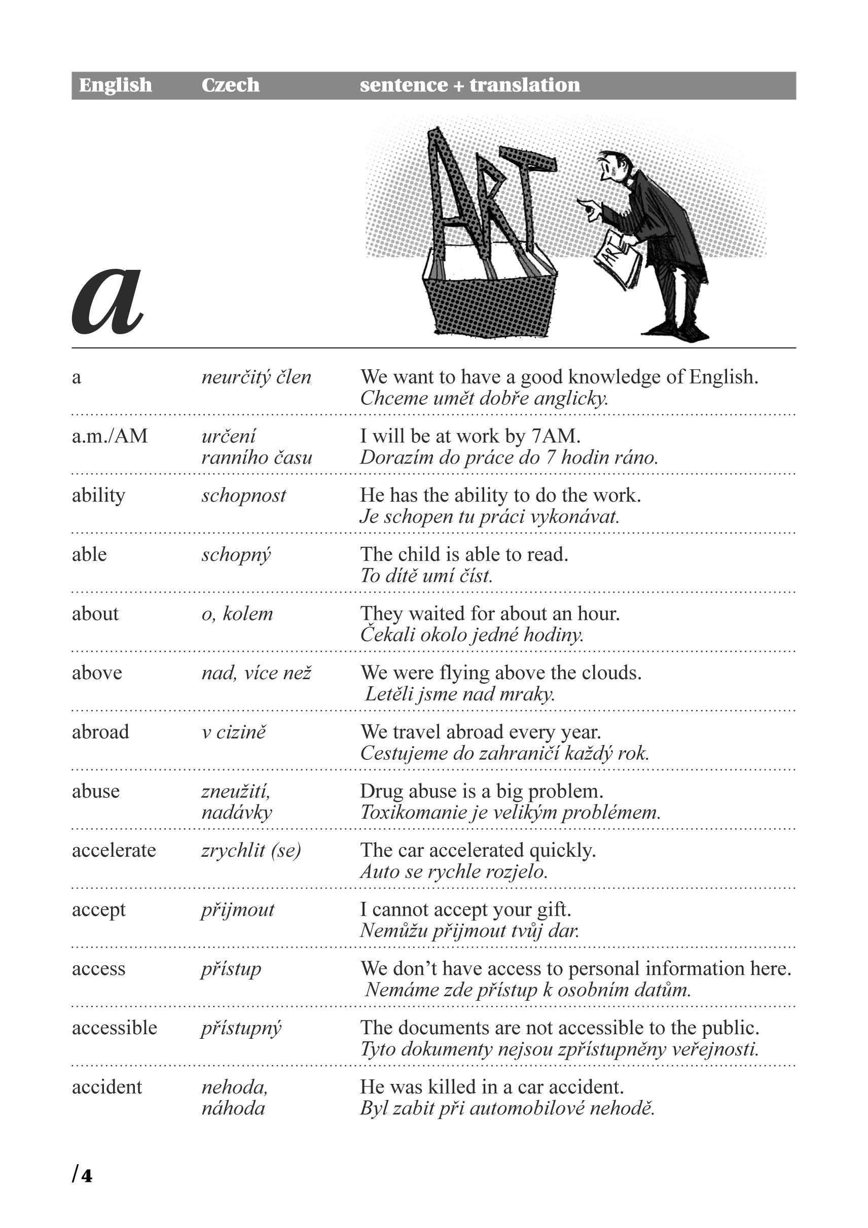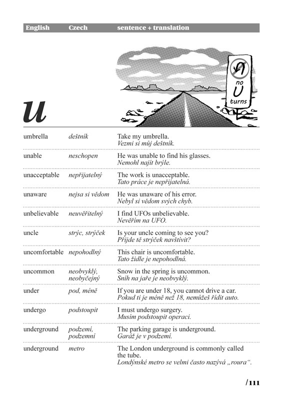 Anglická slovíčka jsou řazena abecedně. Za každým z nich je uveden český překlad. Následuje anglická věta a za ní opět český překlad. Uvědomíte si tak vazby a kontext, jak bývá dané slovo nejčastěji užíváno.