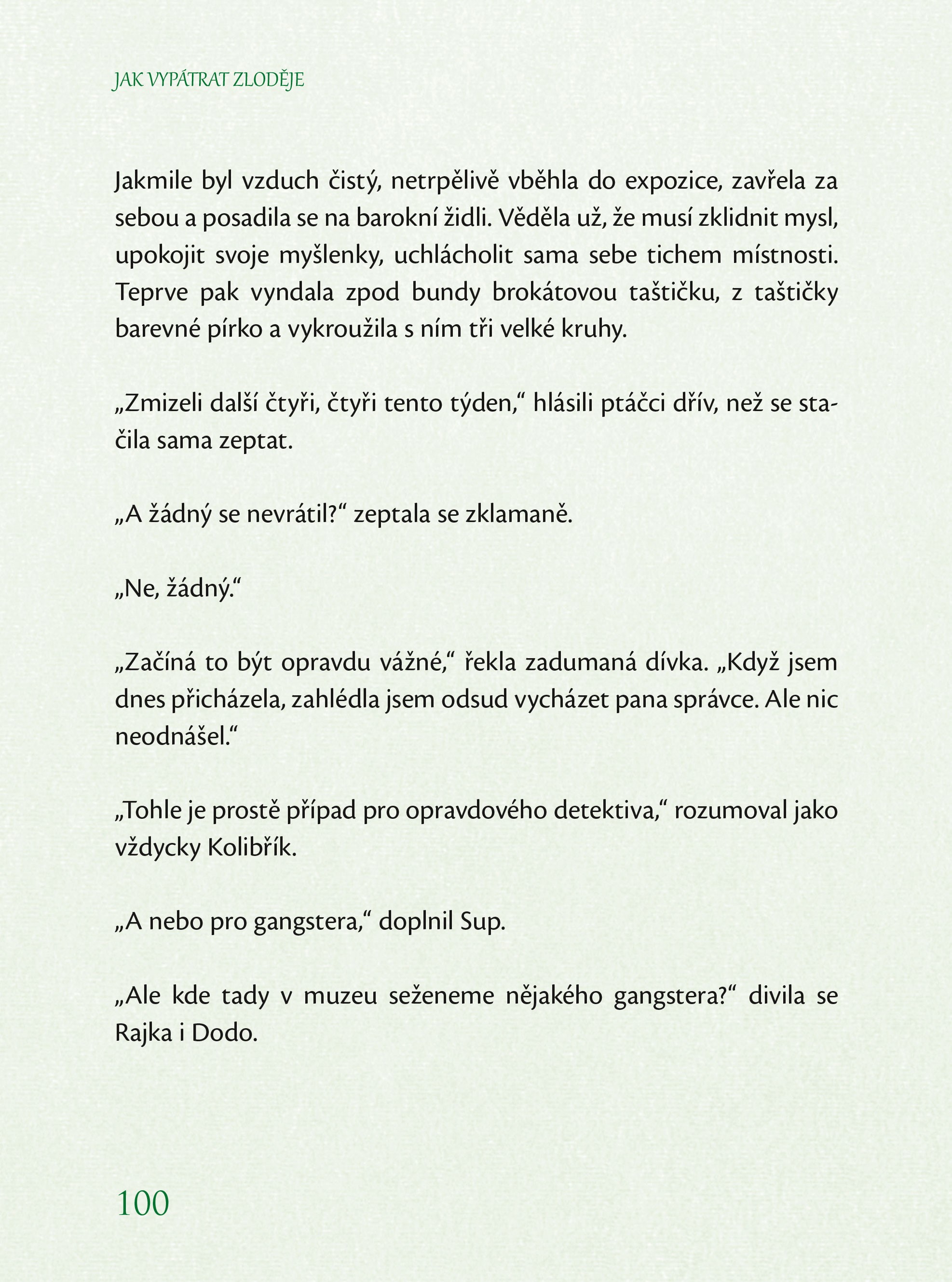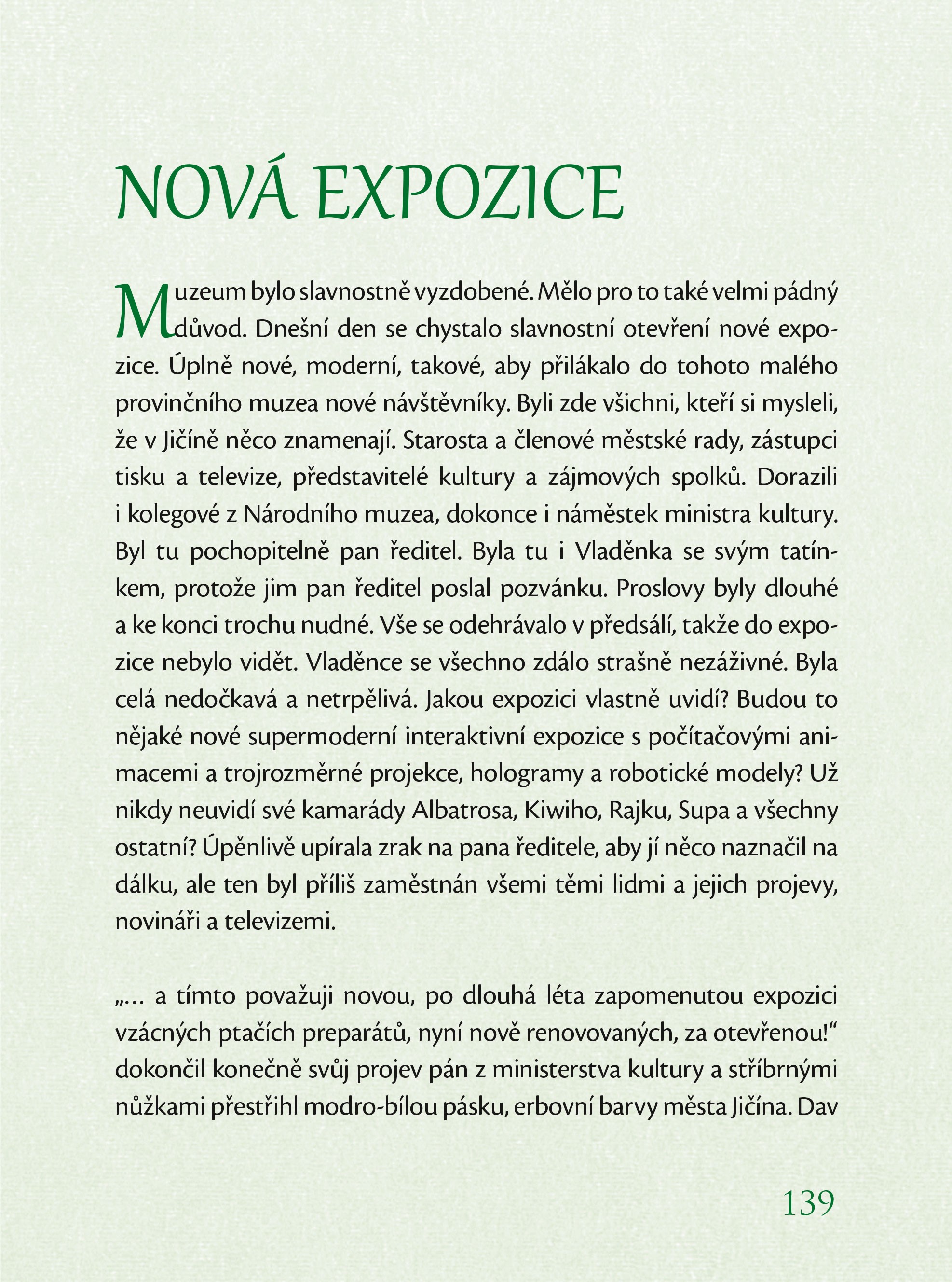 Vlaďka nejprve nevěří vlastním očím. Tohle všechno že způsobilo jen jedno barevné ptačí peříčko? Ale když si vyposlechne všechny ty neuvěřitelné příběhy a navíc zjistí, že ředitel má za úkol otevřít novou sbírku, odhodlává se k činu. Není totiž muzeum jako muzeum. A v tom Vlaďčině se dějí opravdu prapodivné věci!