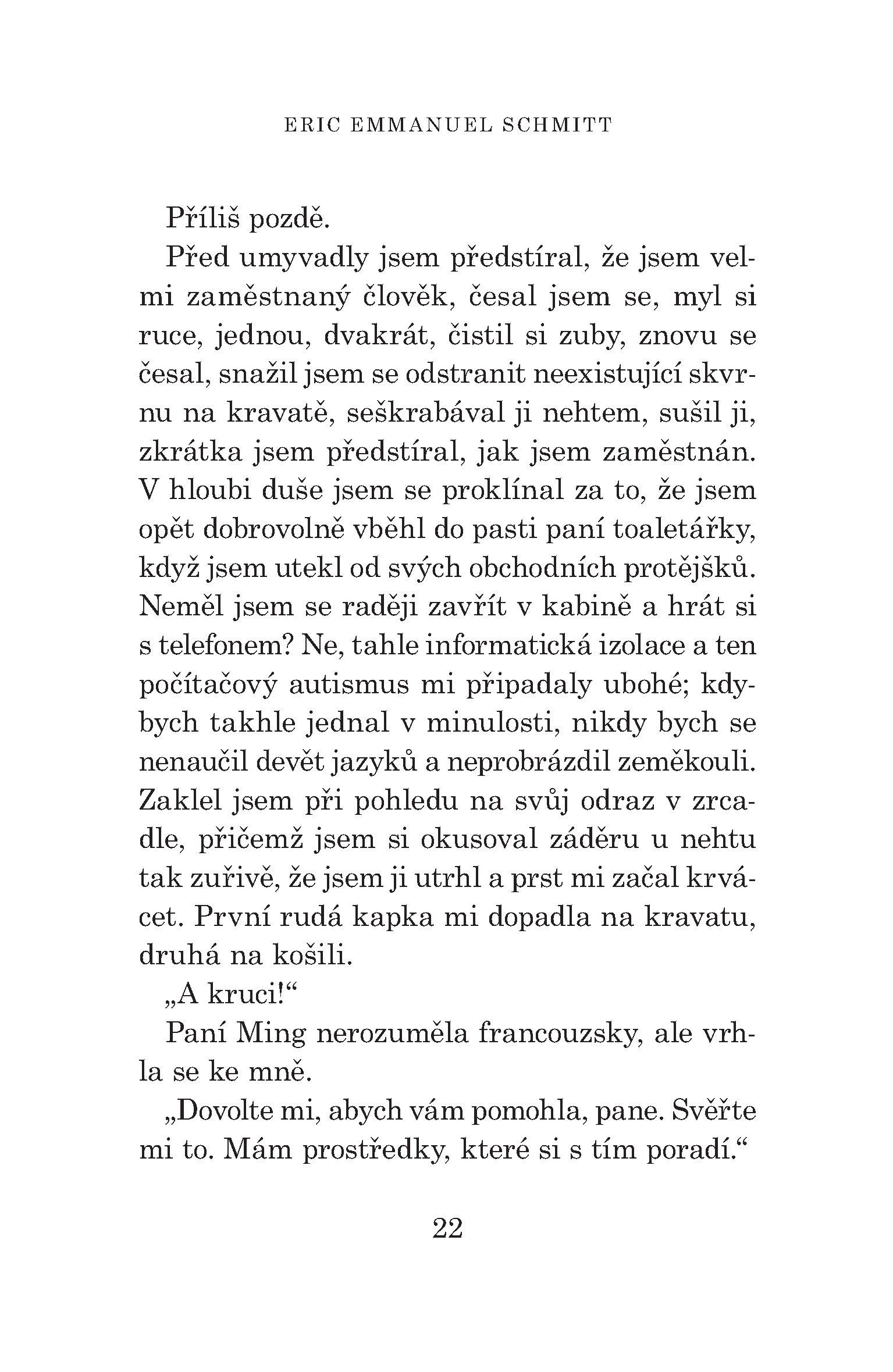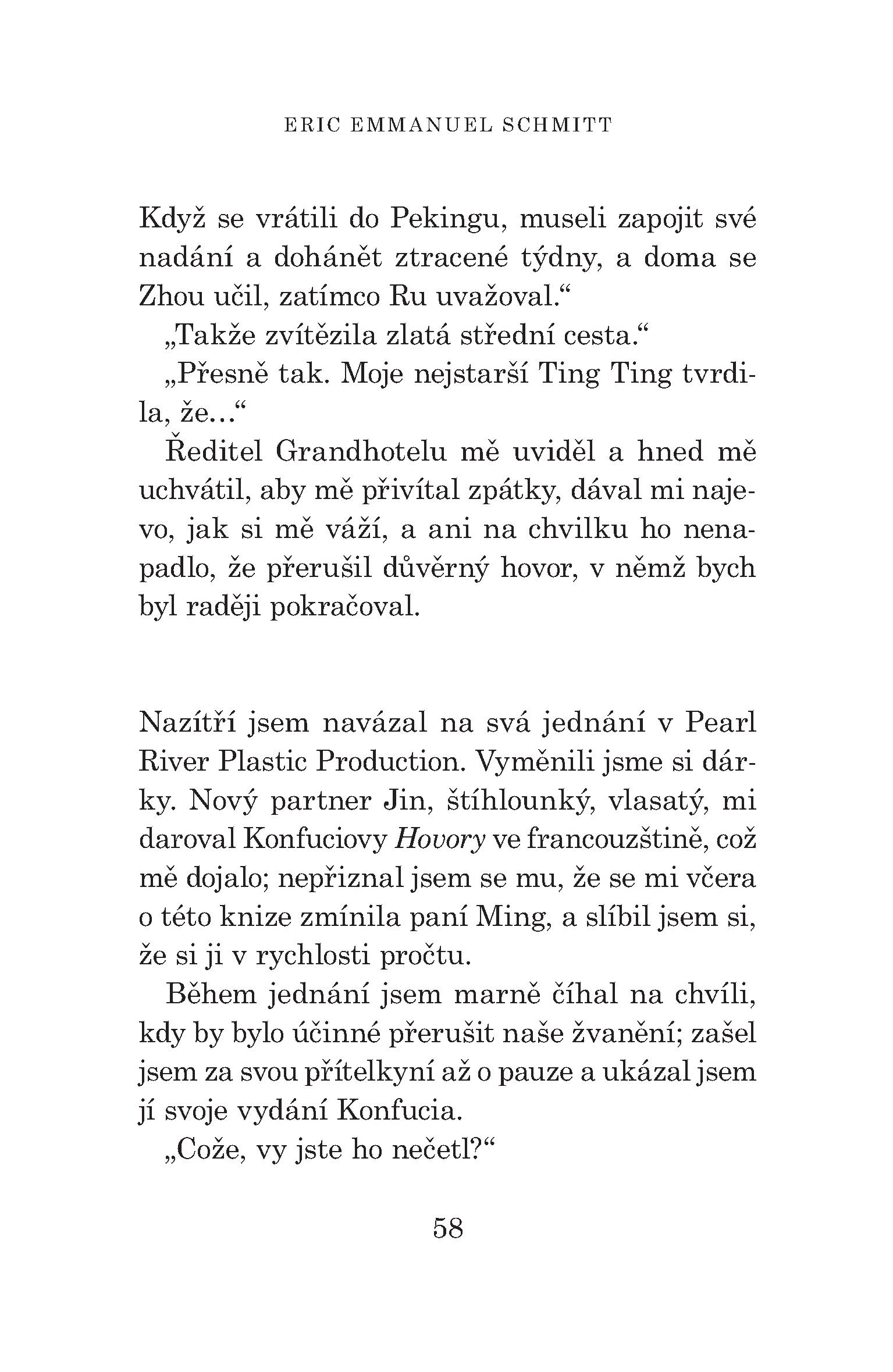 Byl jsem ohromený. Jaká výstřední a přehnaná lež! Představovala si snad, že jí to uvěřím? Považuje mě za takového hlupáka? Každý přece ví – dokonce i omezený turista –, že čínský stát za účelem regulování demografického vývoje už celá desetiletí zakazuje párům, aby přivedly na svět víc než jedno dítě.
