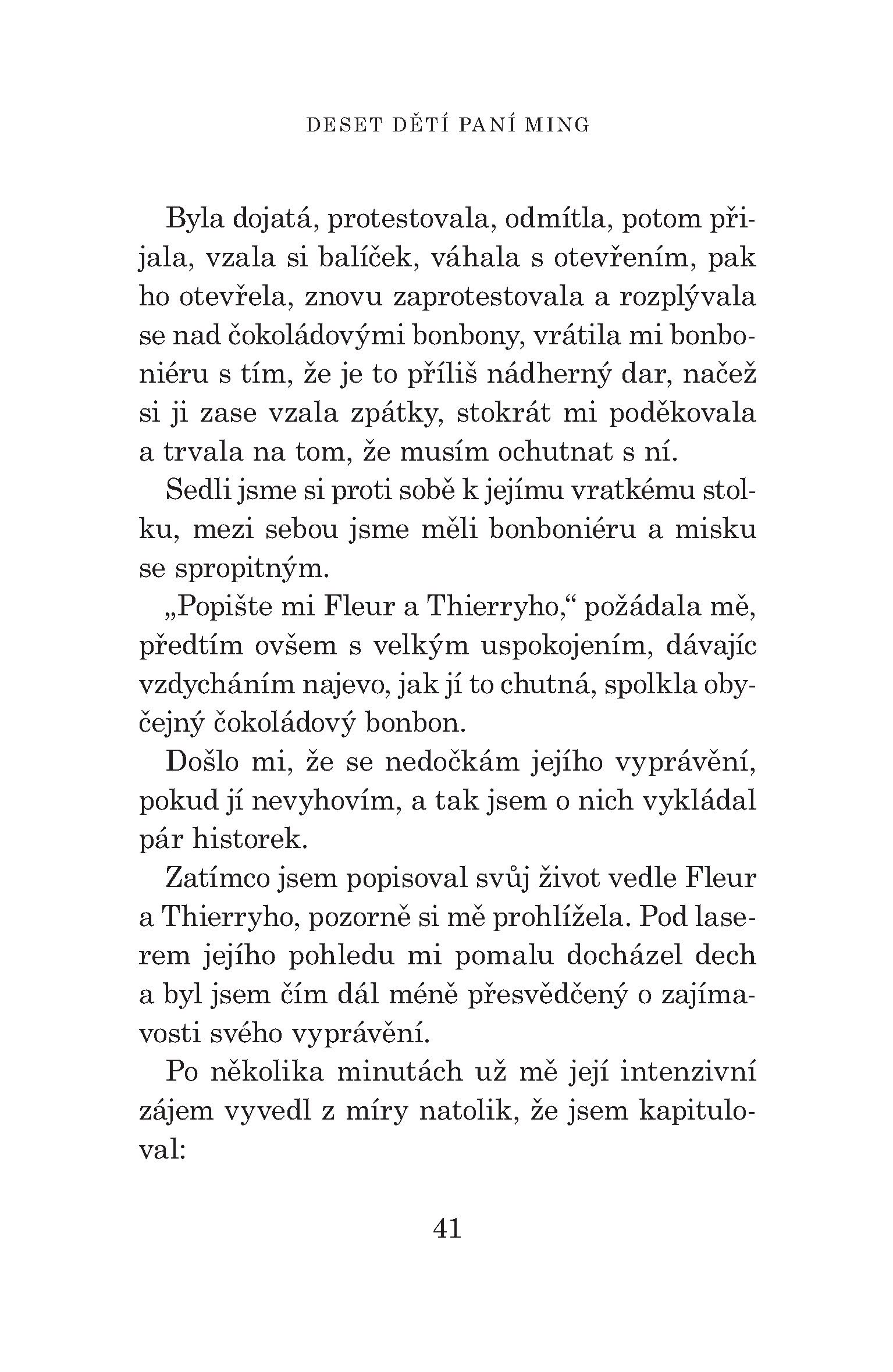 Paní Ming neustále mluví o svých deseti dětech, které žijí na různých místech rozsáhlého území Číny. Je to možné v zemi, kde je povoleno mít pouze jedno dítě? Obešla nějak zákon? Vymýšlí si nebo je snad šílená? A co když se nejedná o imaginární potomky? Co když doopravdy existují? Jaké tajemství skrývá nenápadná a tichá paní Ming?