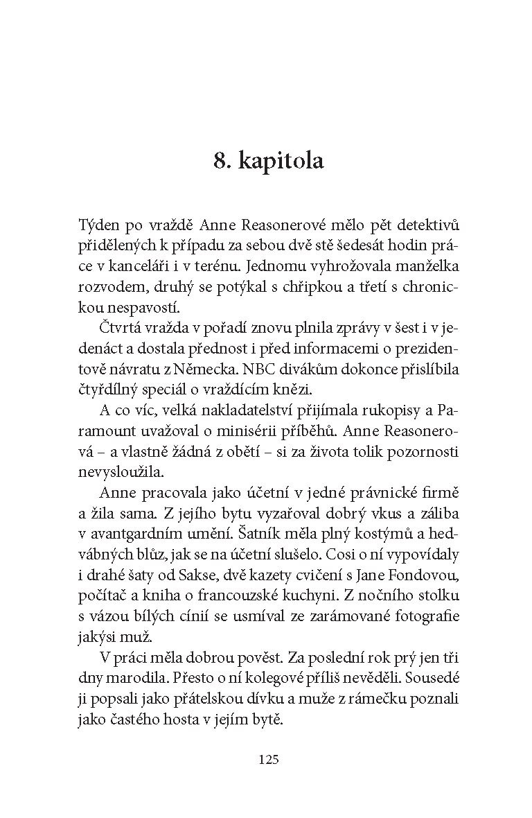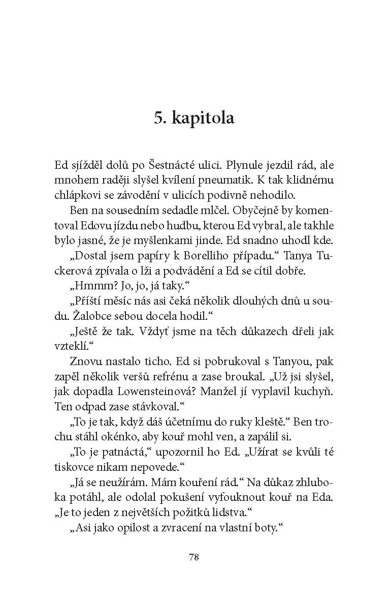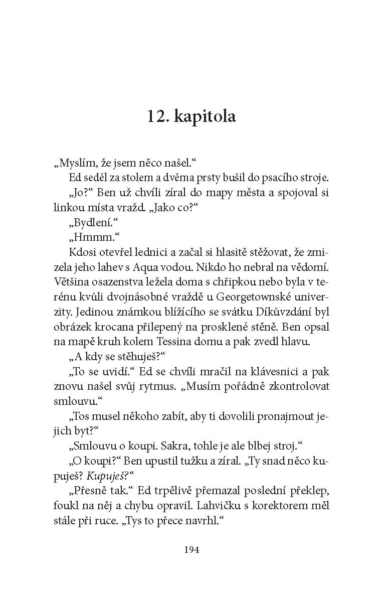 Procházel se dlouhé hodiny. Když konečně došel do bytu, byl tak unavený, že sotva stál na nohou. Za posledních pár měsíců dokázal usnout, jen když se předtím docela vyčerpal. Nemusel ani rozsvěcet, cestu znal. Minul dveře do ložnice a zamířil do zadního pokoje. Ještě si nemohl odpočinout, nesplnil poslední povinnost. Ta místnost zůstávala zamčená. Odemkl a nasál slabou vůni květin, které sem každý den nosil. Na dveřích šatníku visel kněžský šat s bílým šálem.