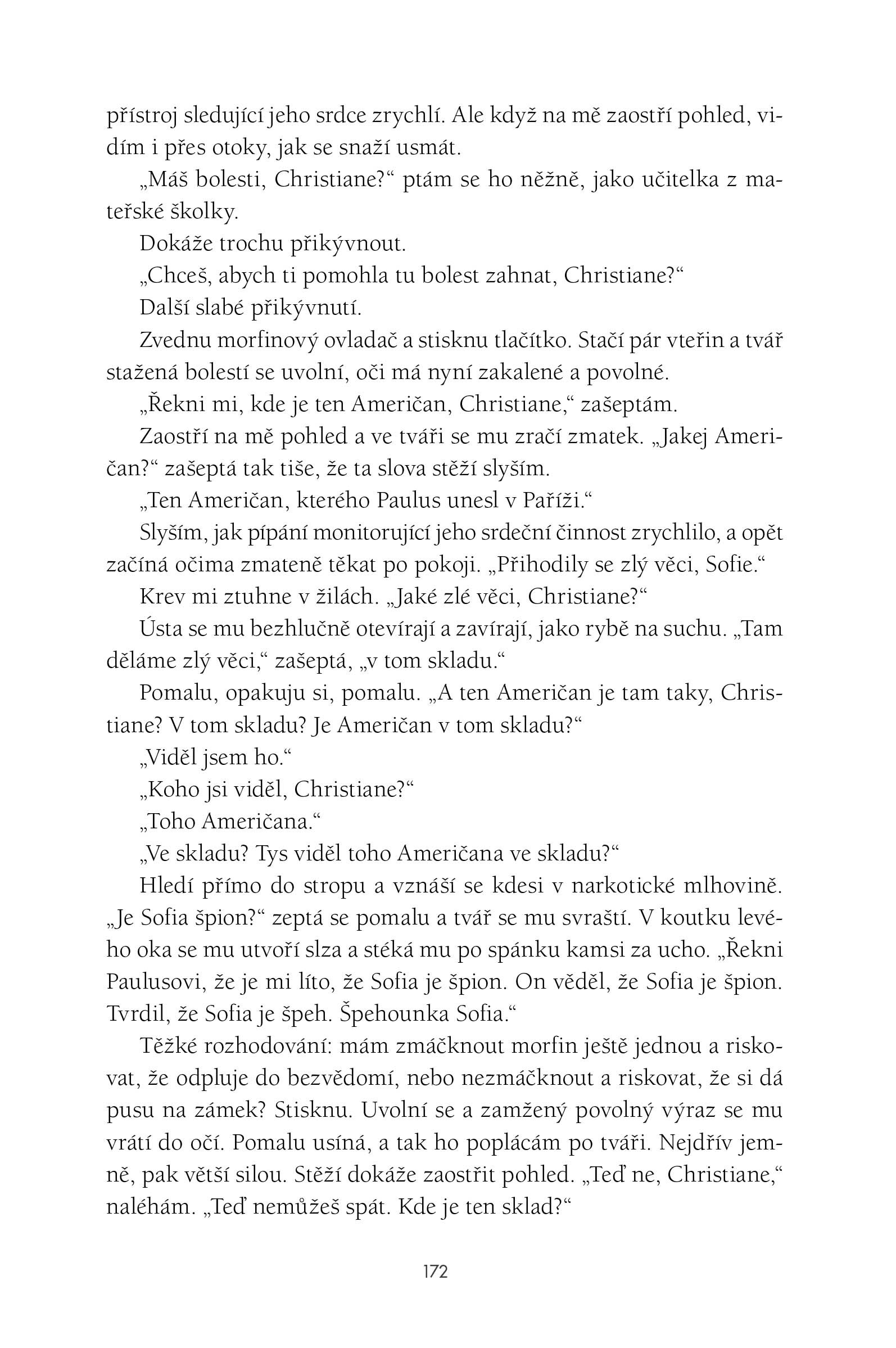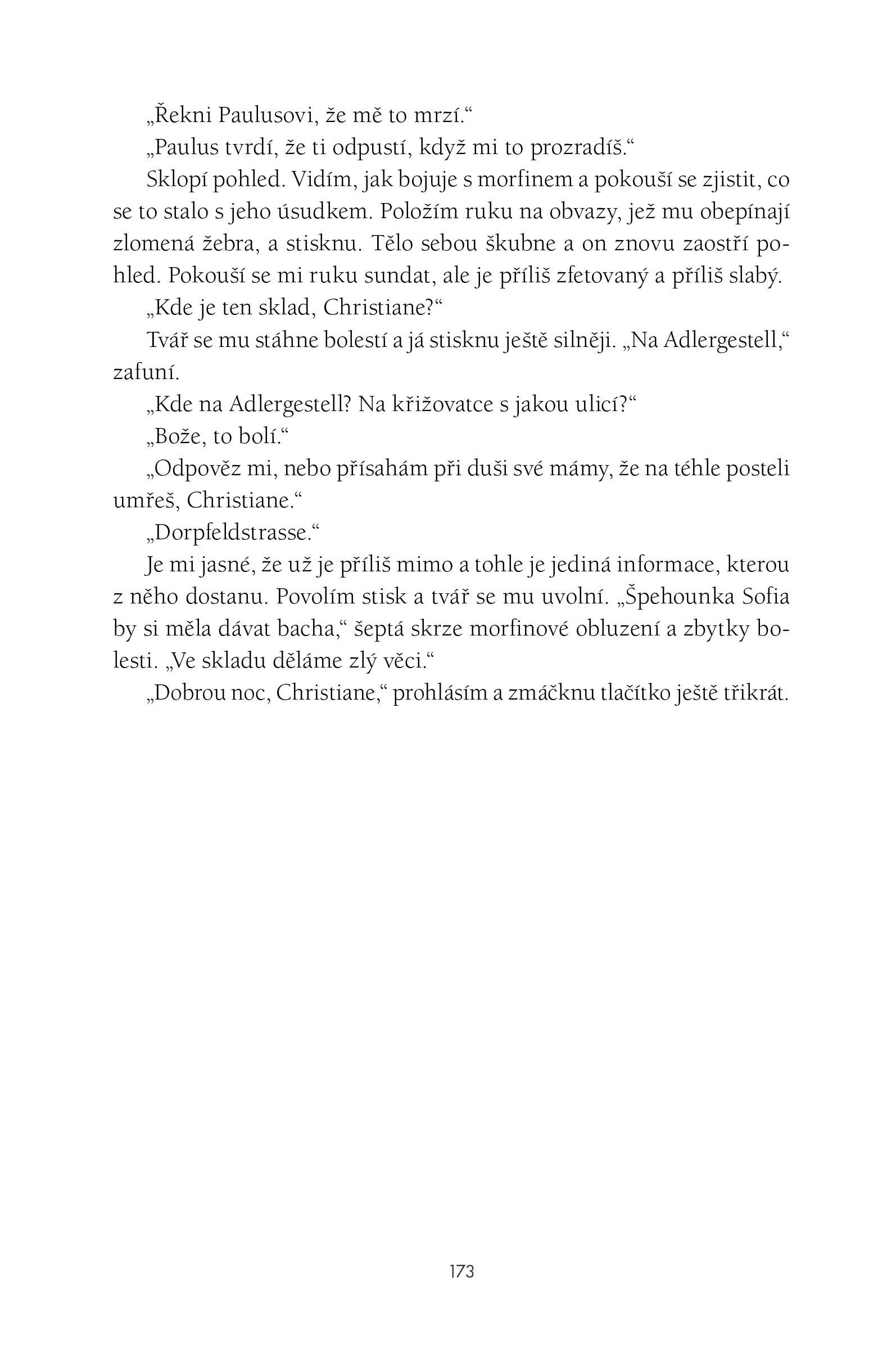 Život Gwendolyn Bloomové jel odjakživa po jiné koleji než životy jejích vrstevníků. Matku viděla umírat při pouliční šarvátce, když jí bylo sedm. Teď je jí sedmnáct a jejího otce, amerického diplomata, někdo unesl. Oficiální pátrání nikam nevede a tak Gwen začne pátrat na vlastní pěst. Čeká ji cesta z pařížských slumů přes berlínské noční kluby až do srdce obchodu s bílým masem a zbraněmi ve zkorumpované Praze. Vydává se do míst, kde strach hraje hlavní roli a slabost znamená jistou smrt. Proto musí být nelítostná, stejně jako ti, kteří jí stojí v cestě...