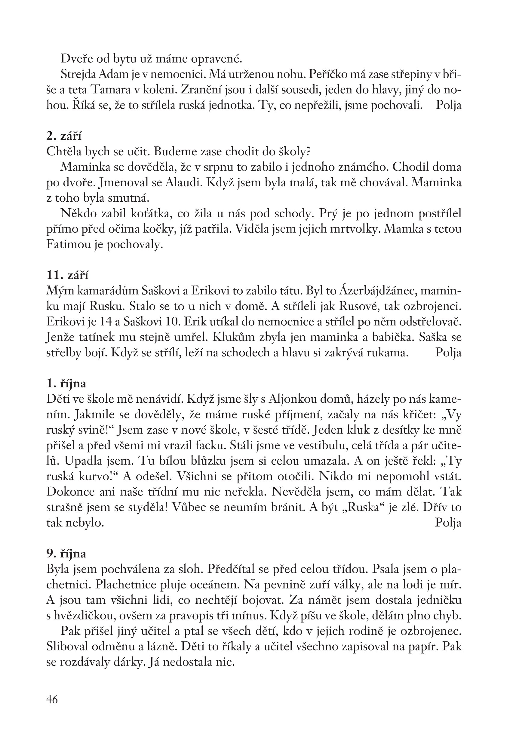 Polina prožila své dospívání uprostřed čečenského pekla. Zažila zblízka válečnou realitu, opovržení i šikanu od spolužáků a učitelů. Ve svém příběhu odhaluje strhující svědectví o těžkém dětství, pubertě i mládí, během nichž proběhly tři čečenské války. Škola, první láska i hádky s rodiči – to zná každý mladý člověk. U Poliny však bezprostředně sousedily s bombardováním, hladem, zkázou a bídou.