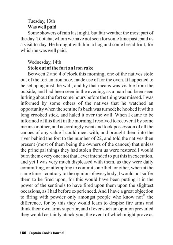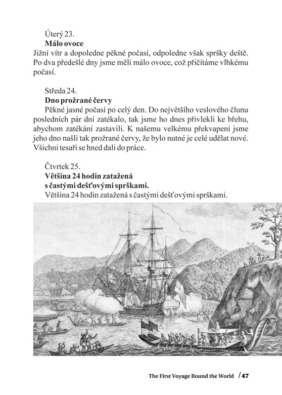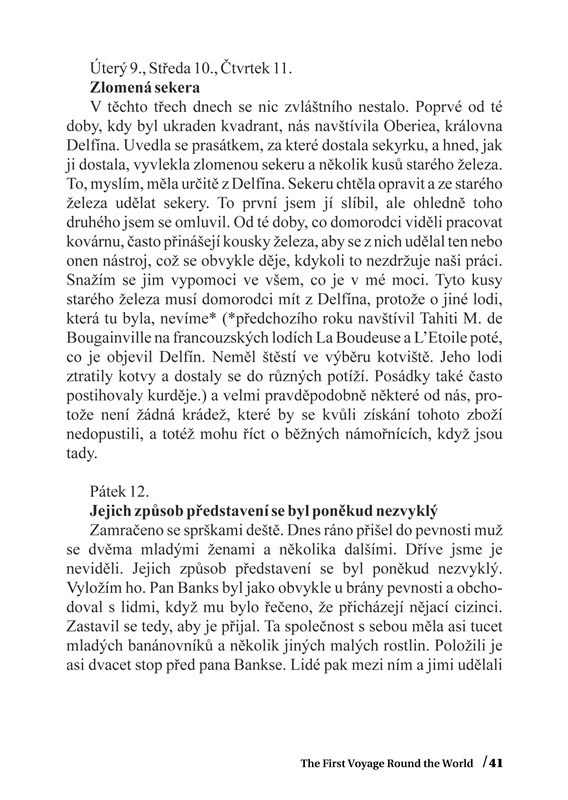 Tahiti je krásný, slunný ostrov bezstarostných lidí. Dnes přitažlivý pro exotickou dovolenou, před téměř čtvrt tisíciletím objevený kapitánem Wallisem (v roce 1767 na lodi Delfín) a od té doby znovu a znovu navštěvovaný nejen slavnými mořeplavci. Deník kapitána Cooka „klipovým“ způsobem prozrazuje, co viděl a zažil, co ho překvapilo a co dokonce přineslo konflikty. Dozvíte se o přátelskosti domorodců k námořníkům, ale i obsahu jejich kapes, o jídle, které pomocí výměnného obchodu námořníci získávali, kterým rozšířili svůj jídelníček a díky kterému dokonce začali příznivě pohlížet na dříve opovrhovaný pokrm. Poznáte sport a zábavu domorodců, obřadní ceremonie vůči živým i mrtvým, způsoby krášlení, které dnes částečně kopíruje celý svět, ruční výrobu unikátní látky a mnohé jiné. Původní vydavatel pomocí srovnání s jinými deníky na několika místech textu komentuje nebo upřesňuje Cookovy údaje.