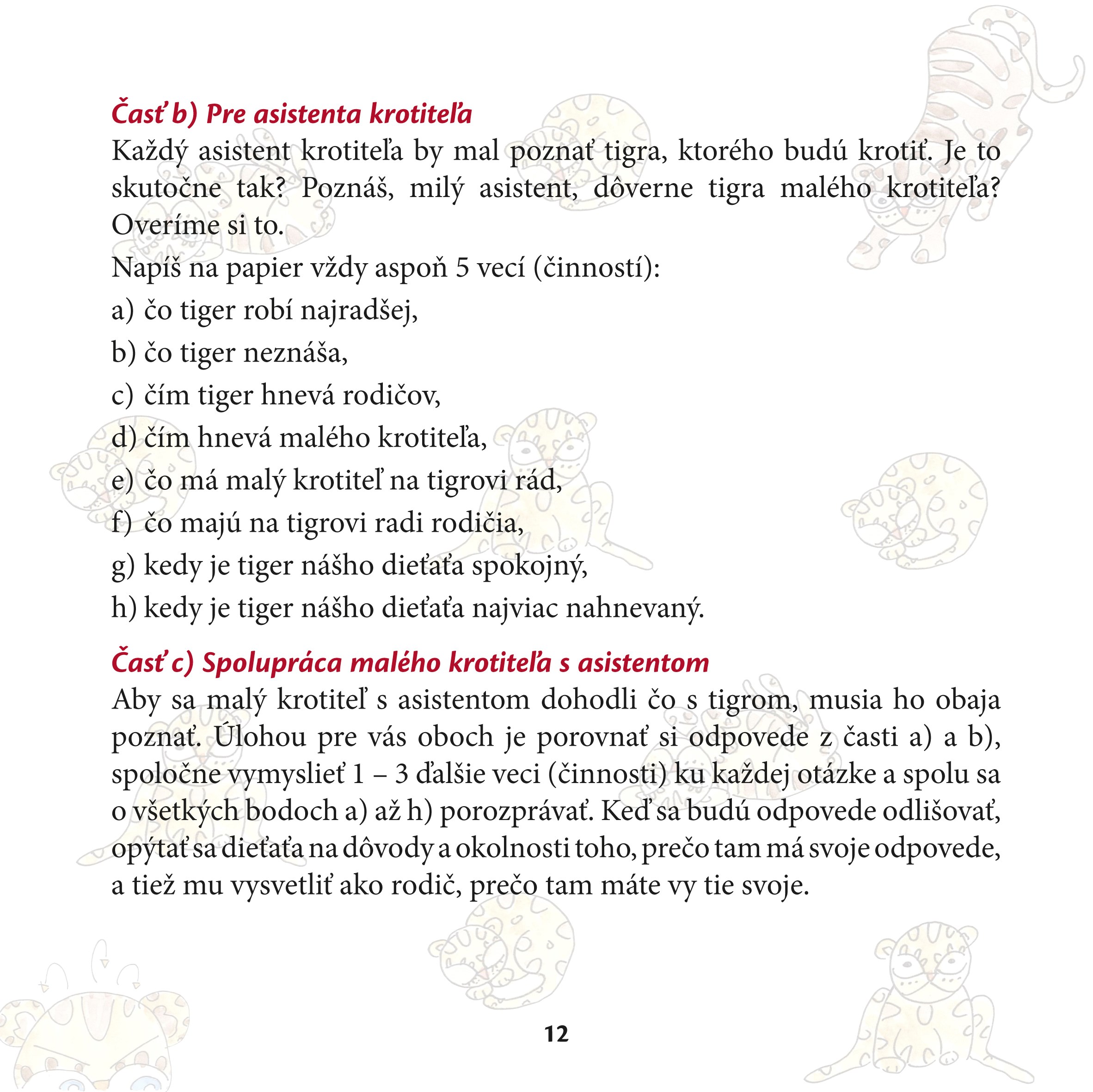Lekcie vychádzajú rýdzo z praktických skúseností kvalifikovaných krotiteľov s praxou, preto nejde o žiadne teoretizovanie. V niekoľkých lekciách sa naučíte zaobchádzať s tigrami, chápať ich, rozumieť im a spolupracovať s nimi. Pokiaľ zvládnete aspoň jednu lekciu, uvidíte, že sa život vo vašej rodine môže veľmi príjemne zmeniť. Pokiaľ sa dostanete až na koniec, tak zaručene svojho tigra skrotíte a uvidíte, že aj tiger môže byť priateľský.