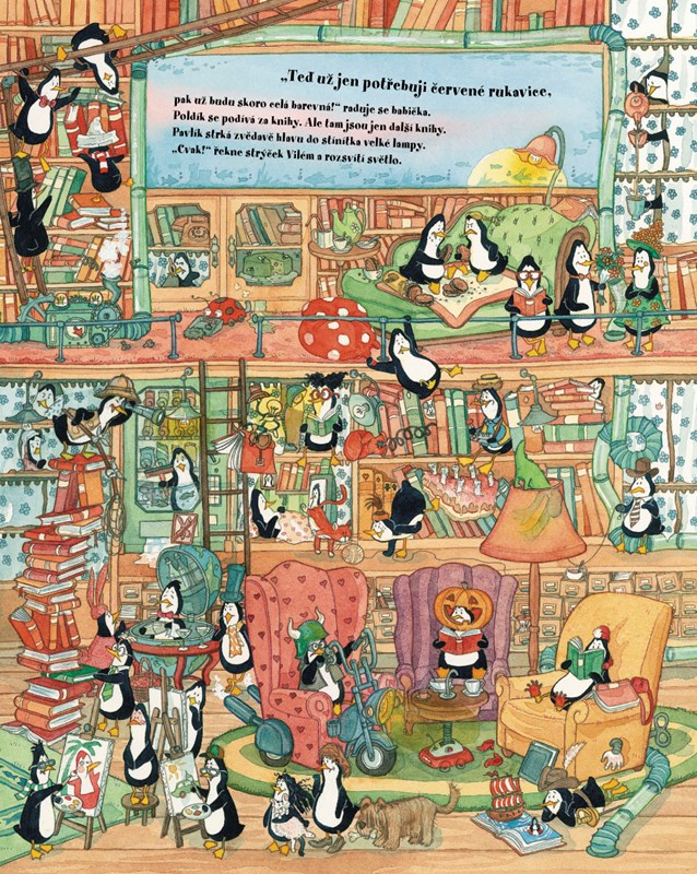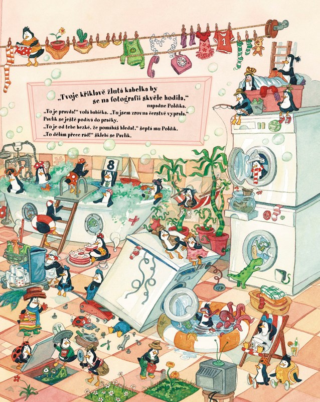 Sjelo se celé příbuzenstvo a dům se hemží tučňáky. Všichni se těší na večerní maškarní bál. Kam se ale ztratily doplňky k babiččinu duhovému kostýmu? Tučňáček Poldík a krokodýlek Pavlík se hned pouští do hledání. Chceš jim také pomoct?