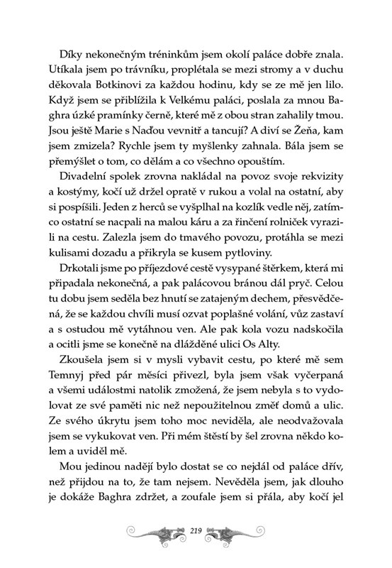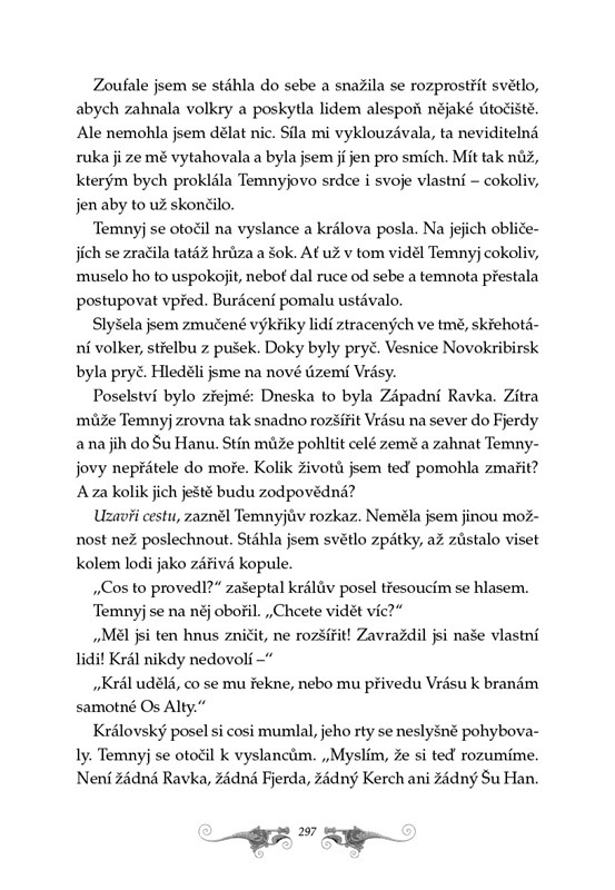 Jenže nic v tomto světě plném přetvářky není tak, jak se jí snaží namluvit. Alina proniká do tajemného společenství grišů a poznává blíž i jejich nejvyššího mága, okouzlujícího Temnyje. Postupně přichází na to, že vše, co se kolem ní děje, má jediný cíl. Zneužít její jedinečnou moc proti celé zemi i proti ní samotné. Pokud se nechce stát loutkou v rukou zla, musí uprchnout. Jediná možná cesta však vede tam, kam se jiní neodvažují. K pásu neprostupné temnoty…