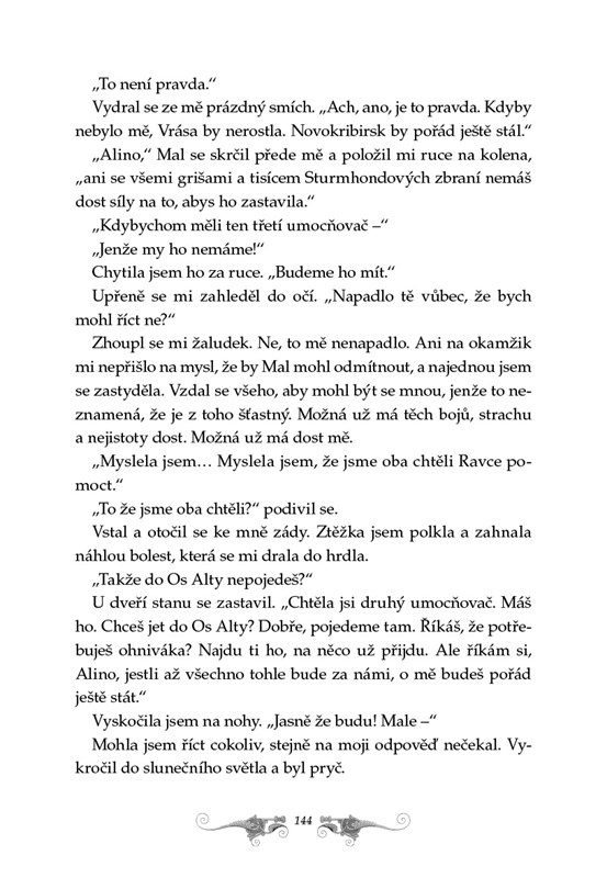 Z obyčejné dívky Aliny Starkové se stala světlonoška. Mnozí k ní upínají své naděje – vždyť jen ona jediná dokáže zničit Vrásu stínu, jež odedávna sužuje zemi. Jenže cena, kterou za to platí, je vysoká. Touží žít někde v ústraní s milovaným Malem po boku, místo toho stále prchá a skrývá se před minulostí.