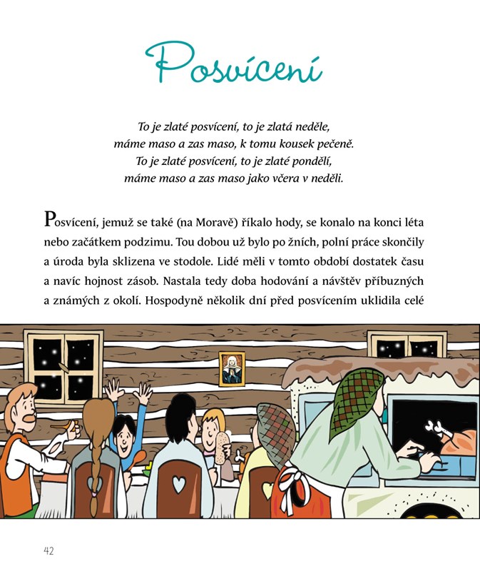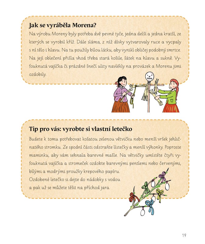 Původ a význam těchto a další známých, i méně známých tradic, je vyprávěn srozumitelně a hravou formou, takže mu snadno porozumí i malé děti. Nechybí jednoduché návody na výrobu tradičních předmětů nebo lidová říkadla.
