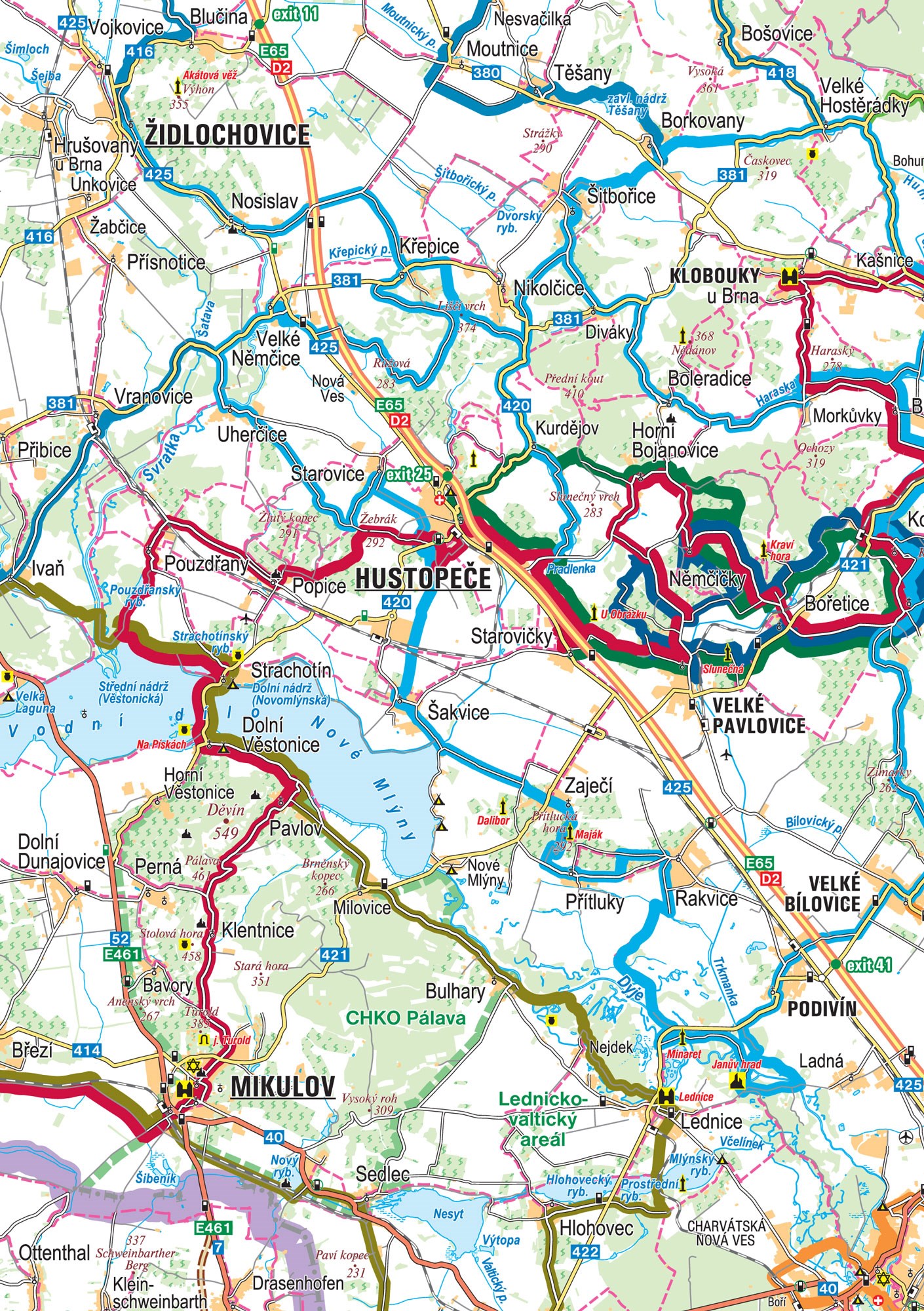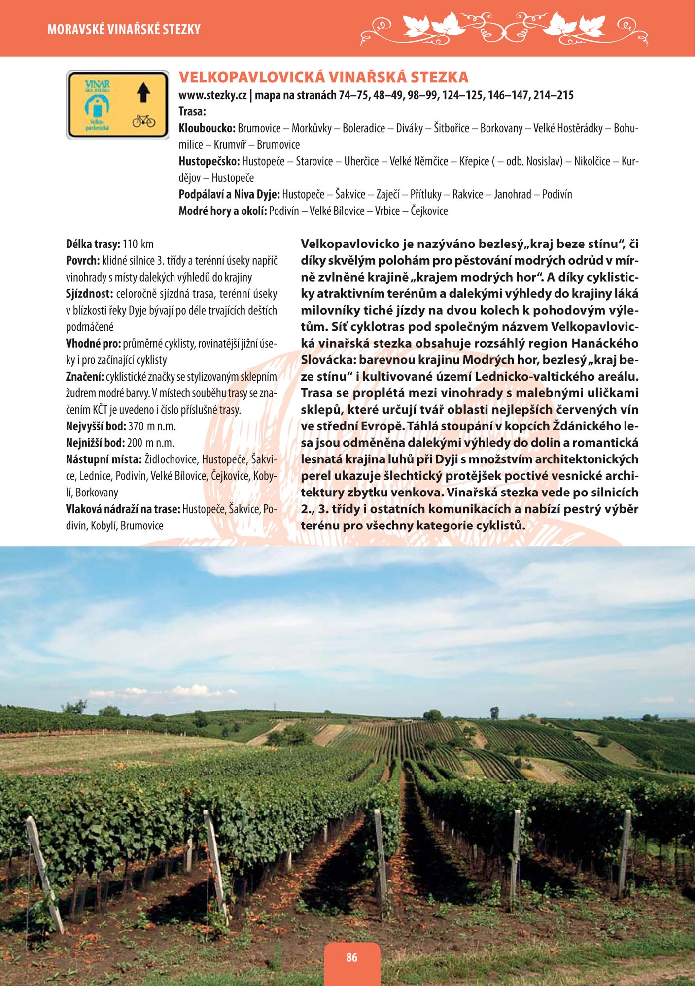Jižní Morava, to je slunce a víno. Jižní Morava na kole, to jsou Moravské vinařské stezky. Pro všechny příznivce jedné stopy (ale nejen pro ně) jsme připravili unikátní publikaci, která vás provede jedenácti hlavními trasami v celkové délce 1200 km a díky níž poznáte přírodní krásy jednotlivých vinařských podoblastí. A nejen to - seznámíte se s vínem jako takovým, dozvíte se o termíny a zajímavosti o vyhlášených vinařských akcích a poznáte kulturu a historii jednotlivých vinařských obcí. Nechybí ani tipy na výlety v rakouském pohraničí.