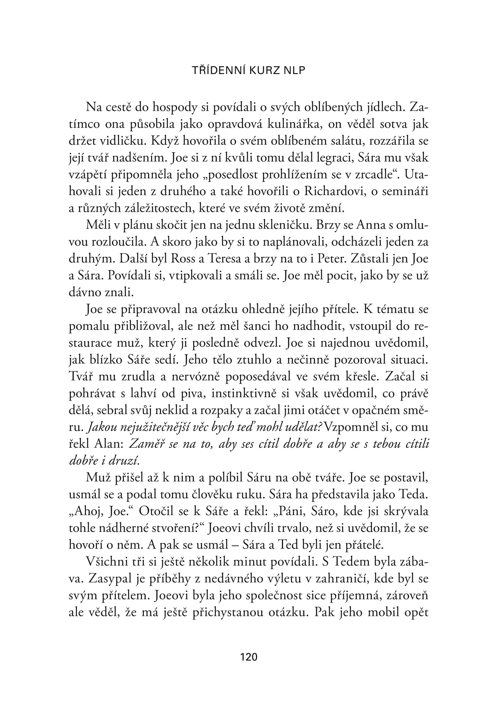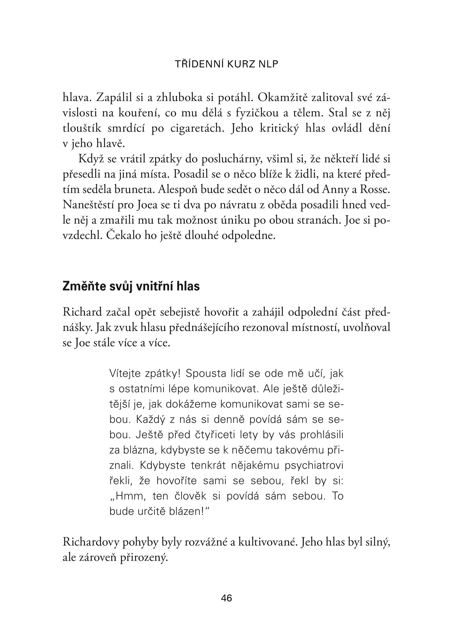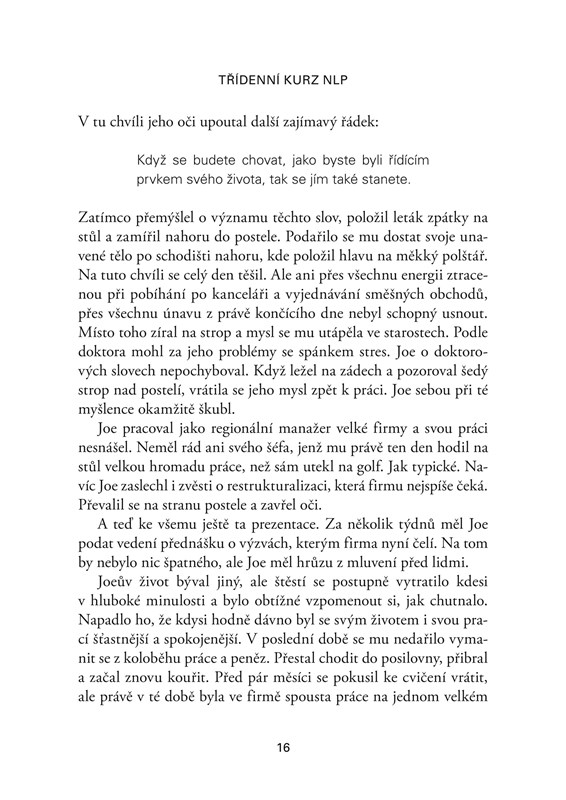 Kniha je příběhem muže, který se účastní Bandlerova workshopu a prochází fázemi od prvotní nedůvěry v NLP až k vnitřní proměně, jež posune jeho život zcela jiným směrem, a to během pouhých tří dnů. Staňte se na chvíli také účastníkem a vyzkoušejte si techniky, s jejichž pomocí miliony lidí po celém světě úspěšně změnily svá životní nastavení. Zažijte působení NLP na vlastní kůži a začněte s efektivními změnami ještě dnes. Naučíte se zvýšit sebedůvěru a ovládat své emoce a negativní myšlení. Pusťte se do čtení a vytvořte si život, jaký opravdu chcete!