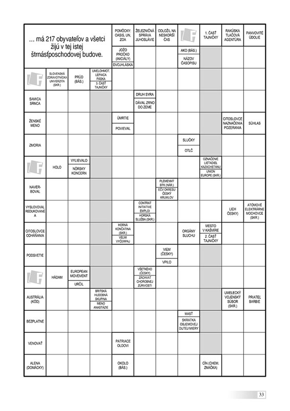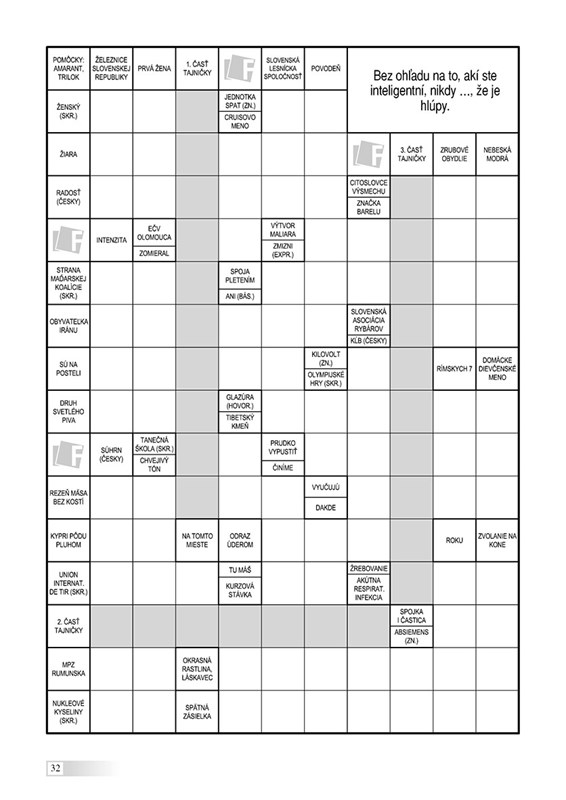 Najvydarenejšie vtipy sú podľa štatistiky tie, ktoré majú presne stotri slov. Starovekí Rimania používali na bielenie zubov vlastný čerstvý moč. Istý švédsky kráľ sa po strate trónu dal na dráhu piráta. Banka je miesto, kde vám požičajú peniaze, ak dokážete, že ich vlastne nepotrebujete. Zábavné i poučné - také sú tajničky krížoviek a osemsmeroviek, ktoré čakajú nielen na vylúštenie, ale vás aj rozosmejú či prekvapia.