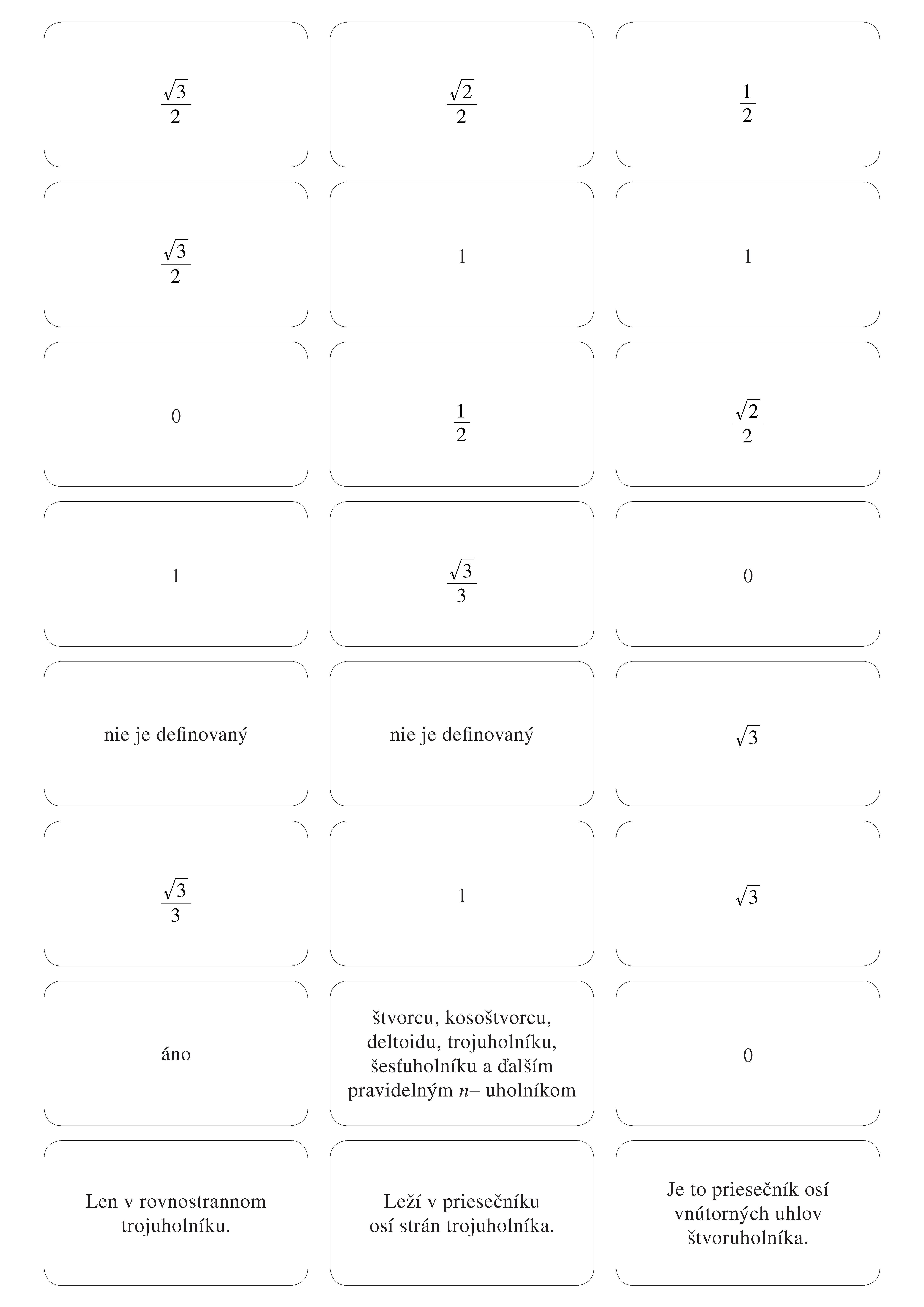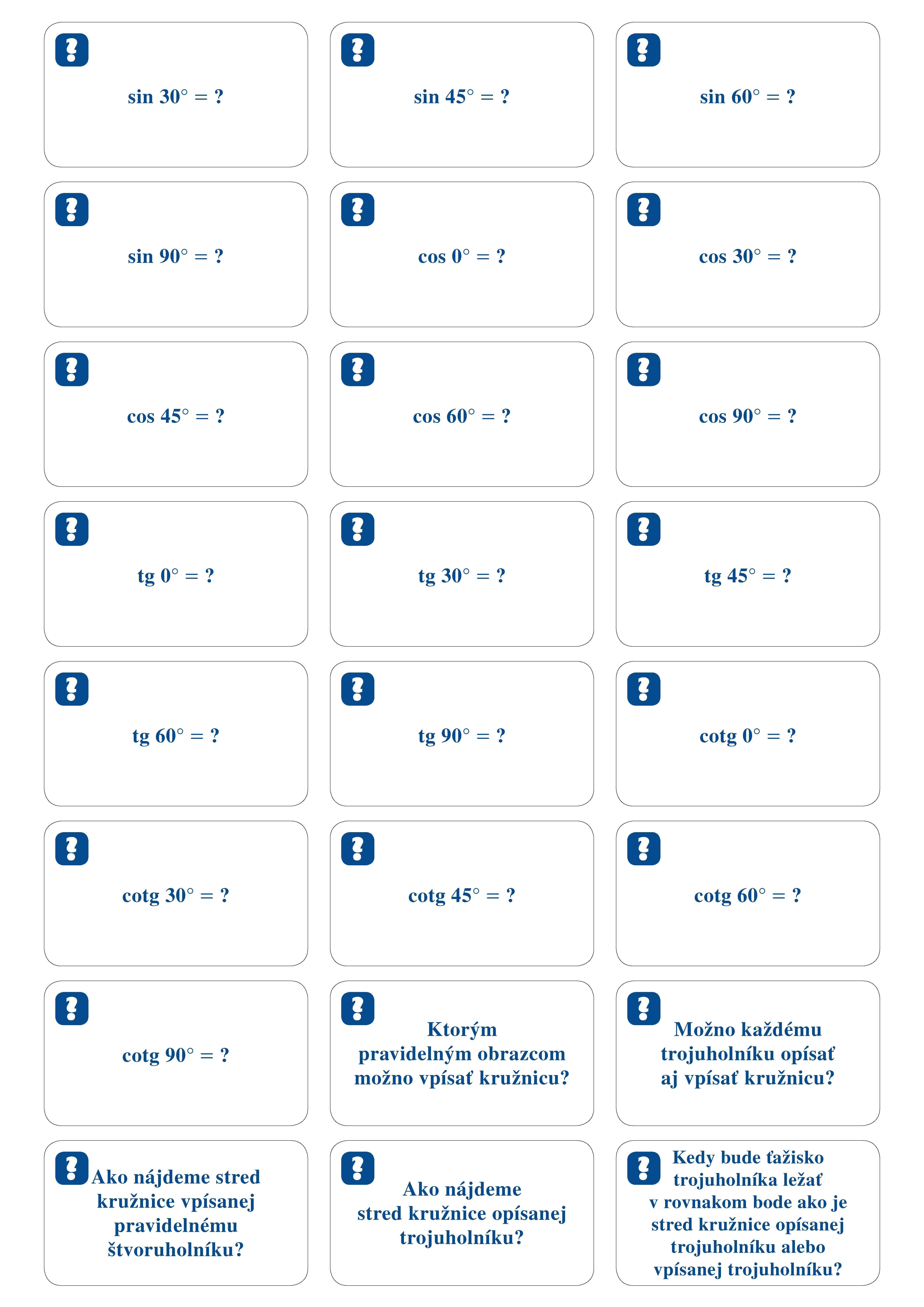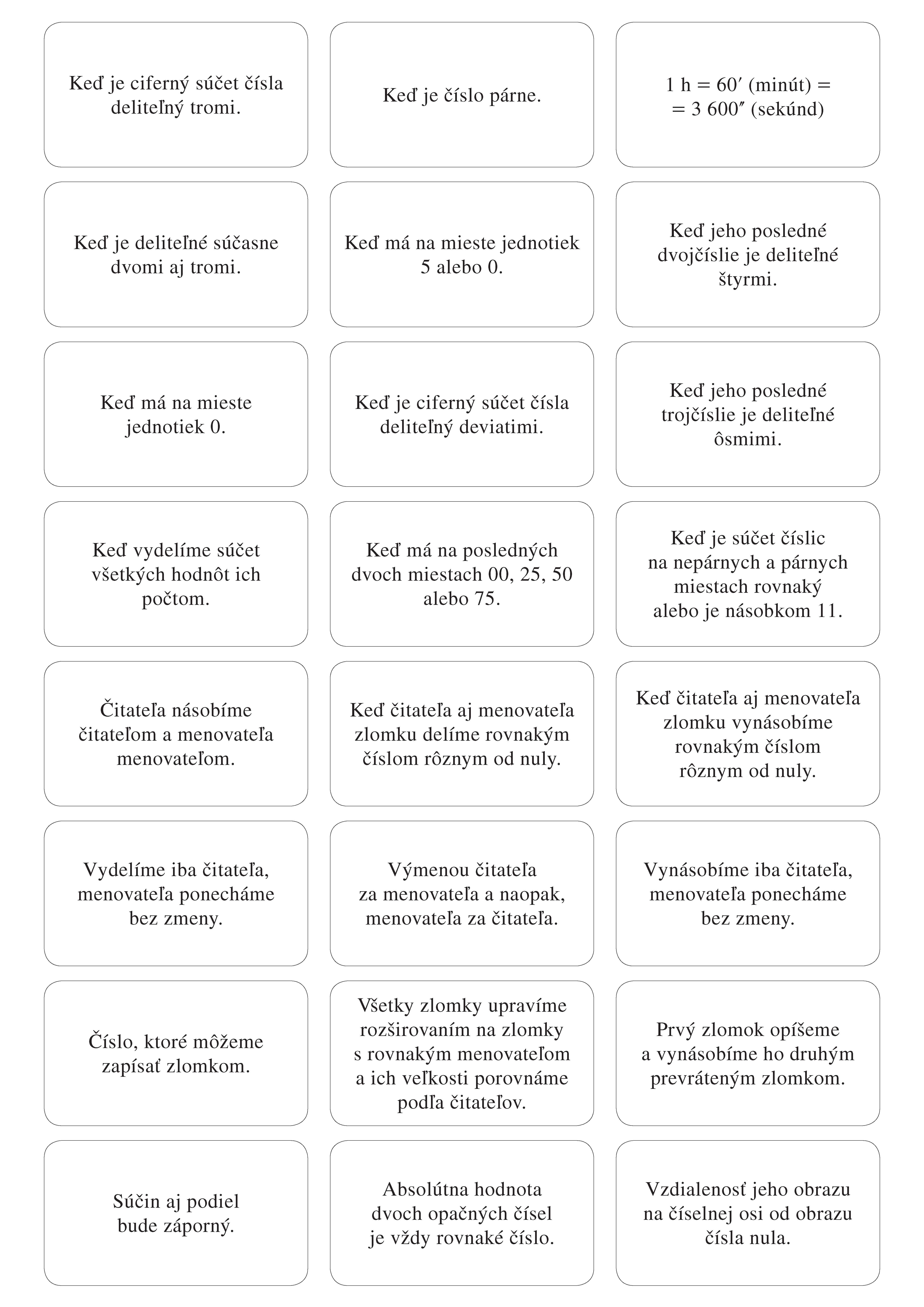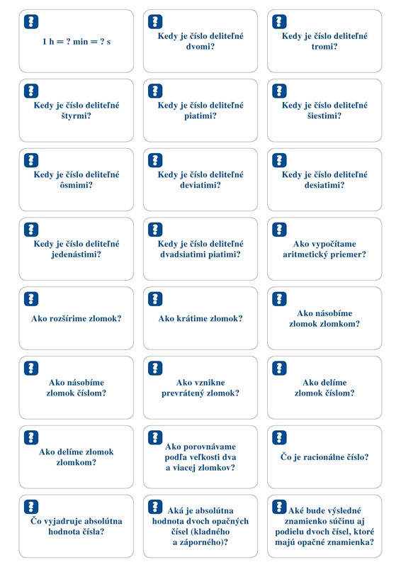 192 kartičiek so základným učivom z matematiky pre 2. stupeň ZŠ môžeš mať stále pri sebe. Na jednej strane kartičky je otázka, na druhej správna odpoveď. Zostav si vlastný súbor a precvičuj témy, ktoré v škole práve preberáte.