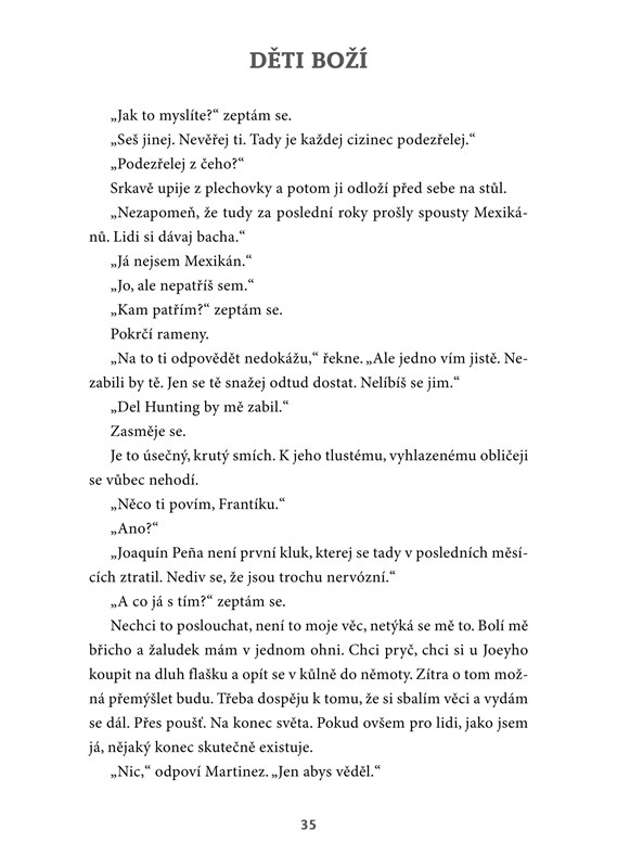 Hlavní hrdina románu Děti boží se ocitá na mexicko-americké hranici, která je tichým svědkem únosů malých chlapců. Nesnesitelné lepkavé horko, smrad mexického vězení, pachuť strachu a hrůza vás sevřou a pustí až na poslední stránce knihy.