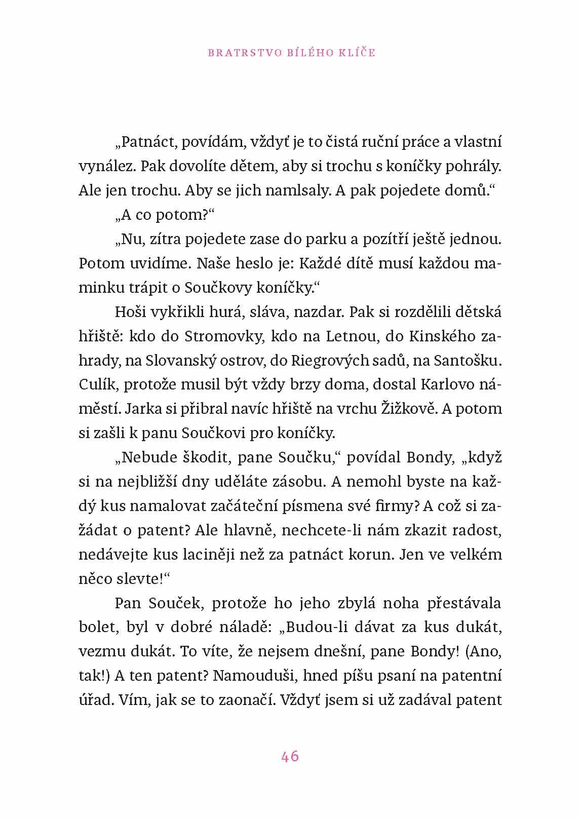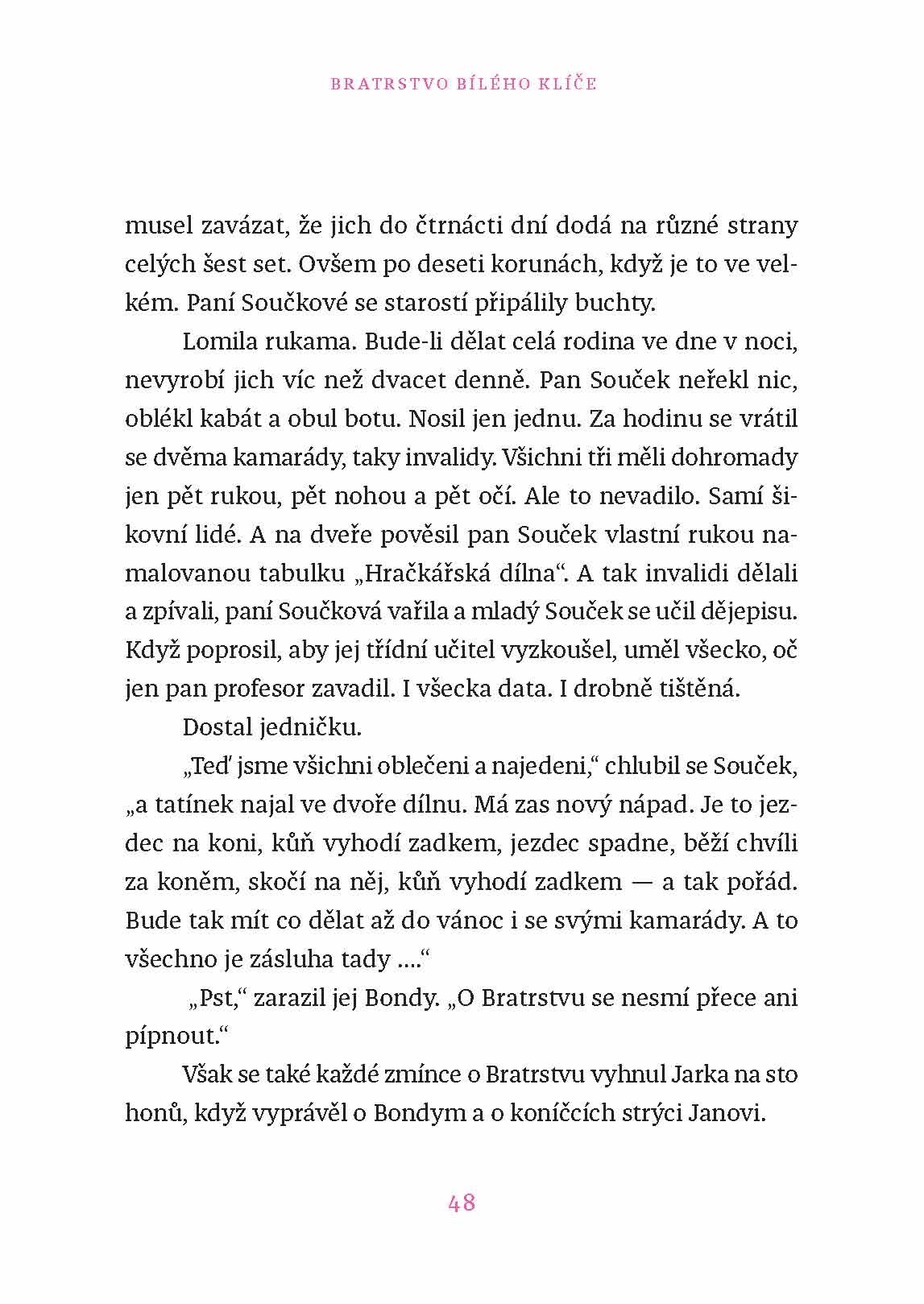 Bratrstvo bílého klíče je tajný spolek prožívající v opuštěné zahradě romantická dobrodružství, po jakých touží každý správný kluk, holky nevyjímaje. Jarkovi a jeho kamarádům se zahrada mění v bitevní pole, v tajnou chodbu a středověkou mučírnu, ale stává se i skutečným domovem medvěda, který utekl z cirkusu, a ringem boxera Čipery. Ale bratrstvo funguje i jako detektivní ústav, který vypátrá ztraceného psa a usvědčí zloděje. Opuštěná zahrada zkrátka představuje kouzelný svět, v němž se představy a sny členů Bratrstva stávají skutečností.