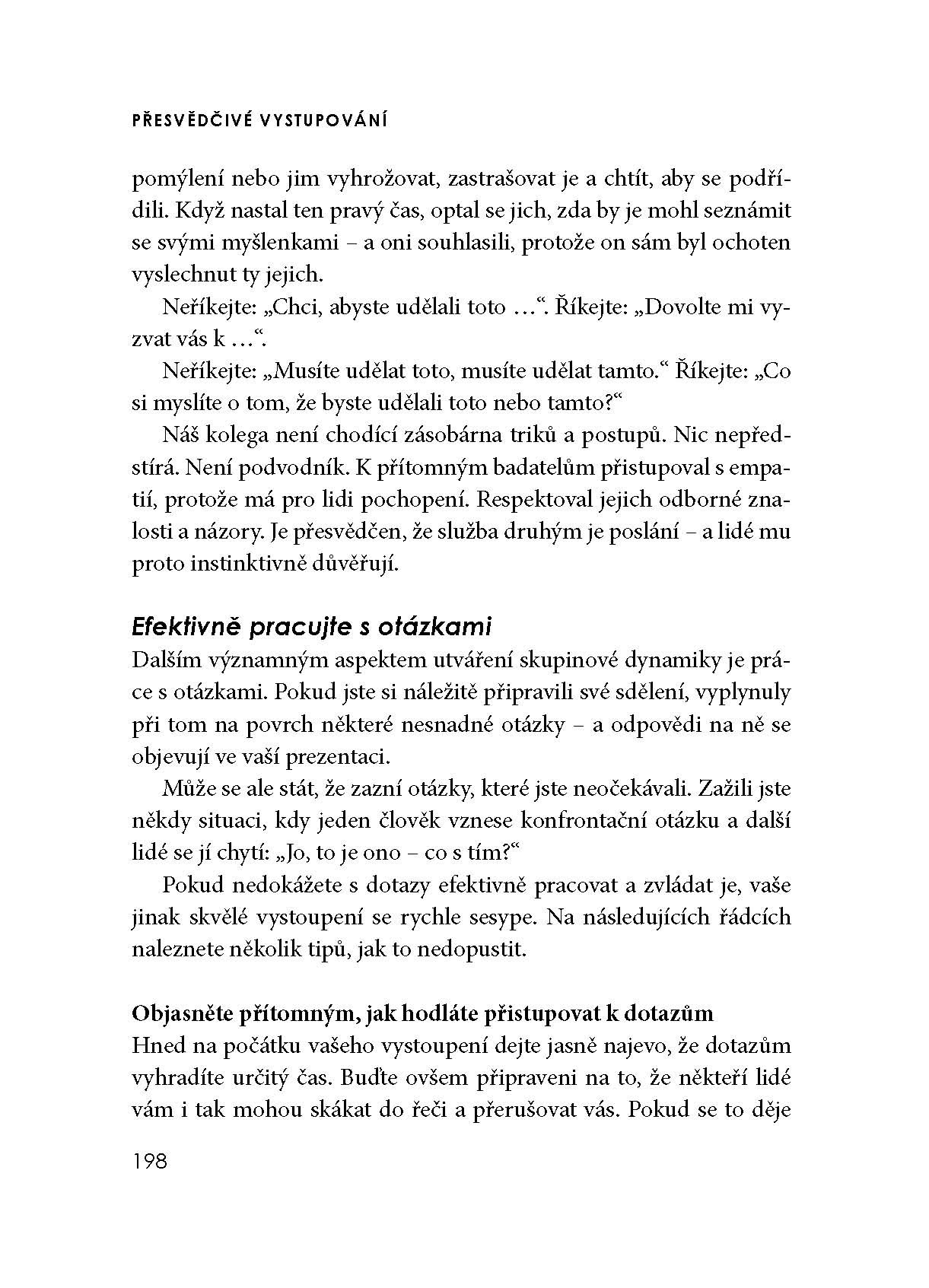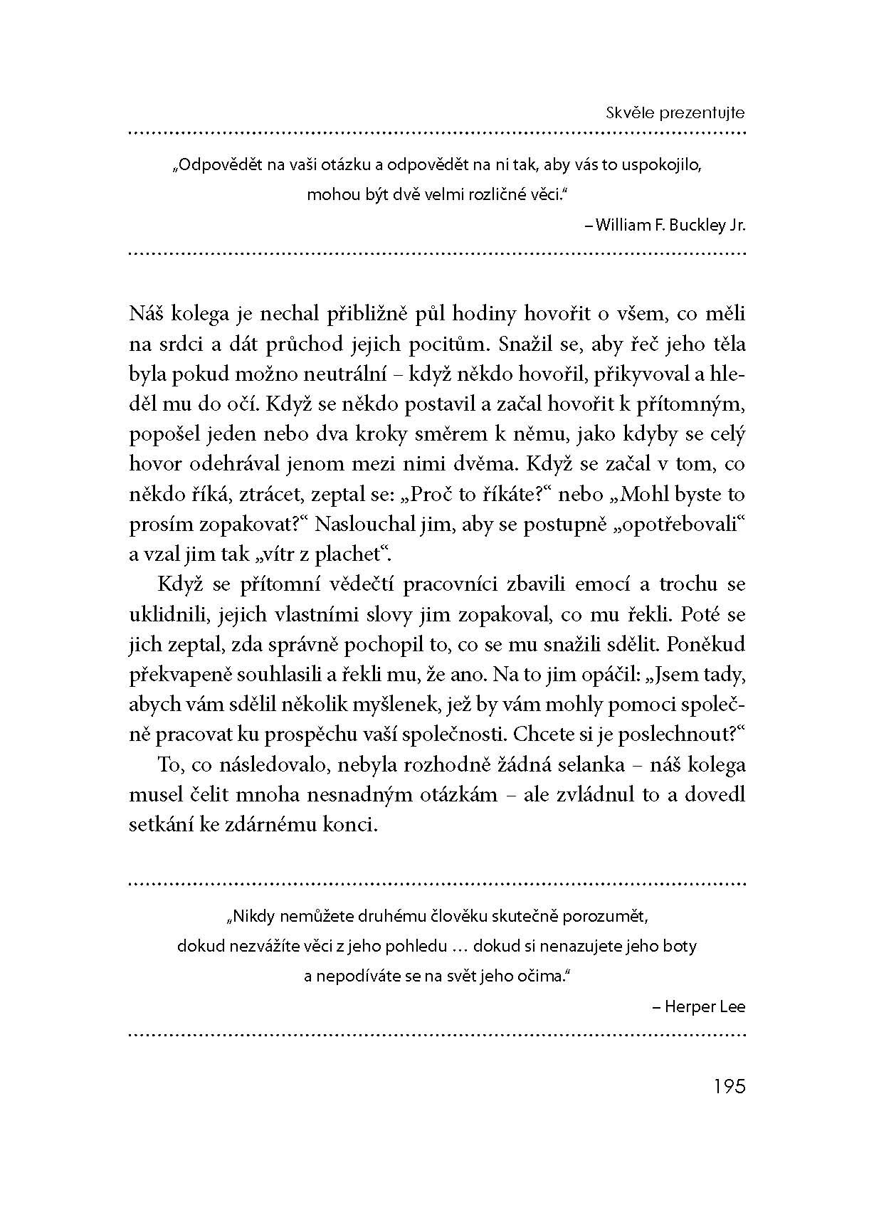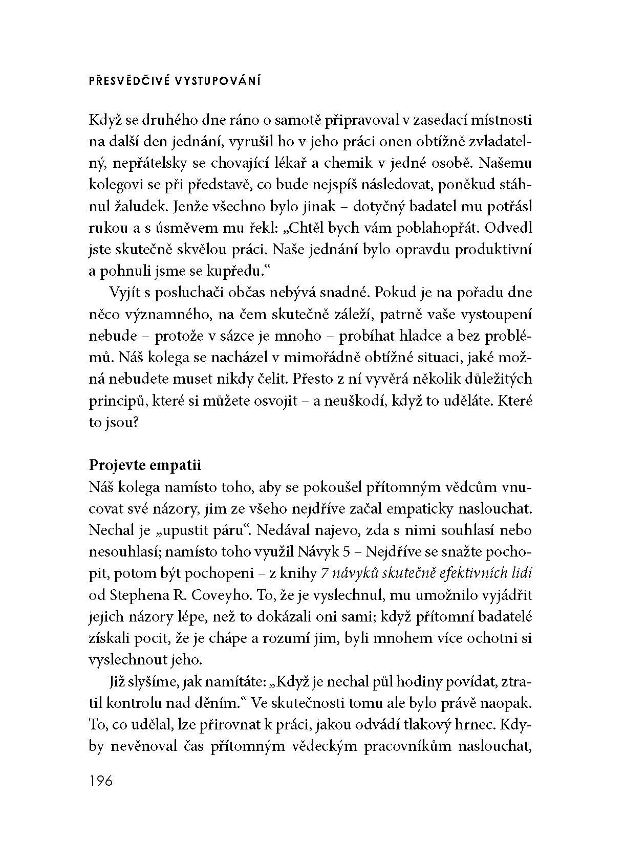 Nejnovější publikace z dílny autorů společnosti FranklinCovey je určena každému, kdo chce důsledně rozvinout jednu z klíčových schopností a dovedností nezbytných v současném světě byznysu – zaujmout a účinně sdělit vše, co chceme, aby se ostatní dozvěděli a přimět posluchače, aby jednali tak, jak potřebujeme. Autoři přinášejí praktický model umožňující přednášejícímu získat a udržet pozornosti posluchačů a především prostřednictvím prezentace efektivně dosáhnout svého cíle. Kniha nabízí množství neocenitelných, zcela konkrétních a snadno využitelných rad a doporučení, podložených jak nejnovějšími výzkumy, tak mnohaletou zkušeností autorů s jejich praktickým uplatněním.