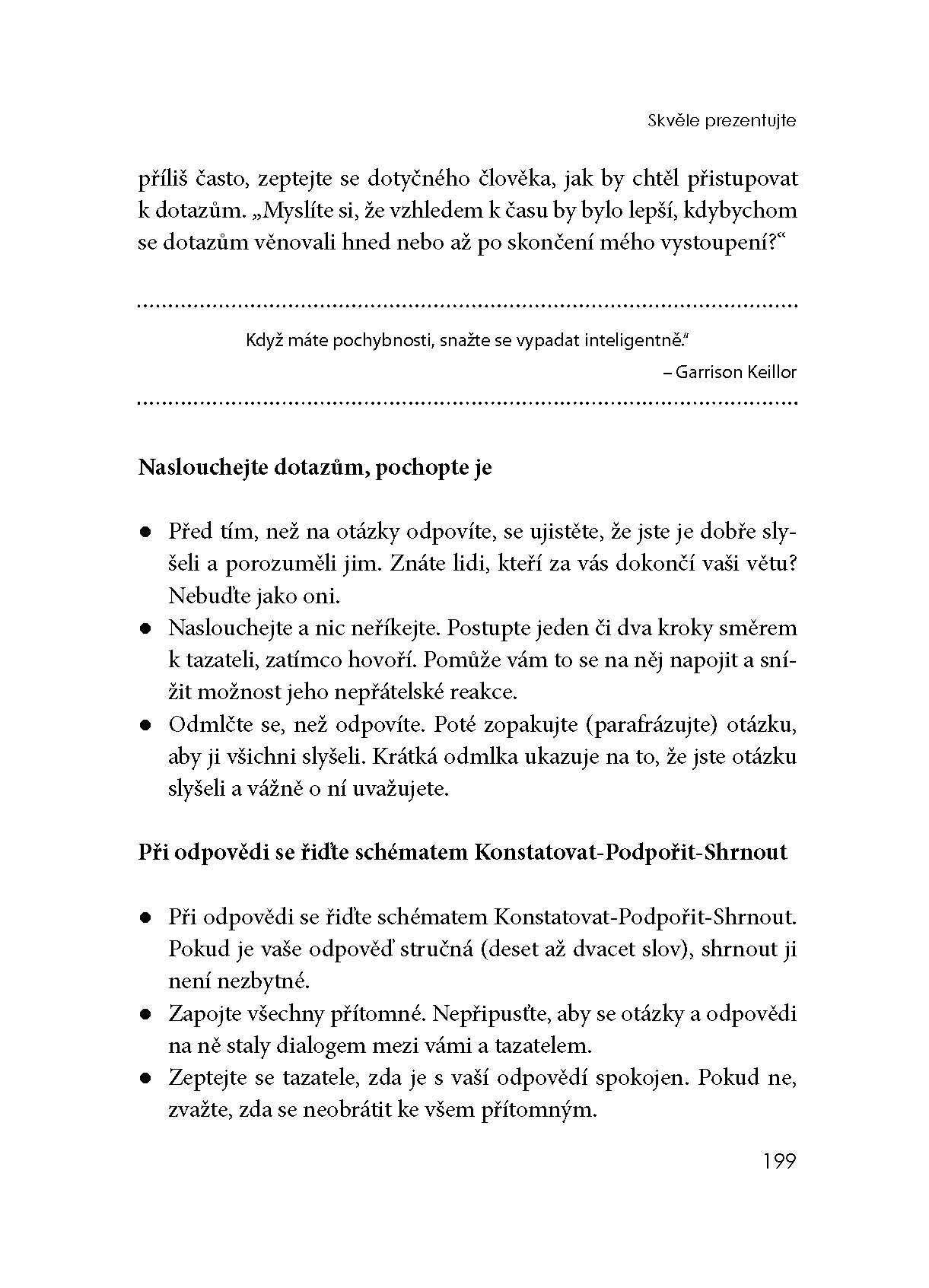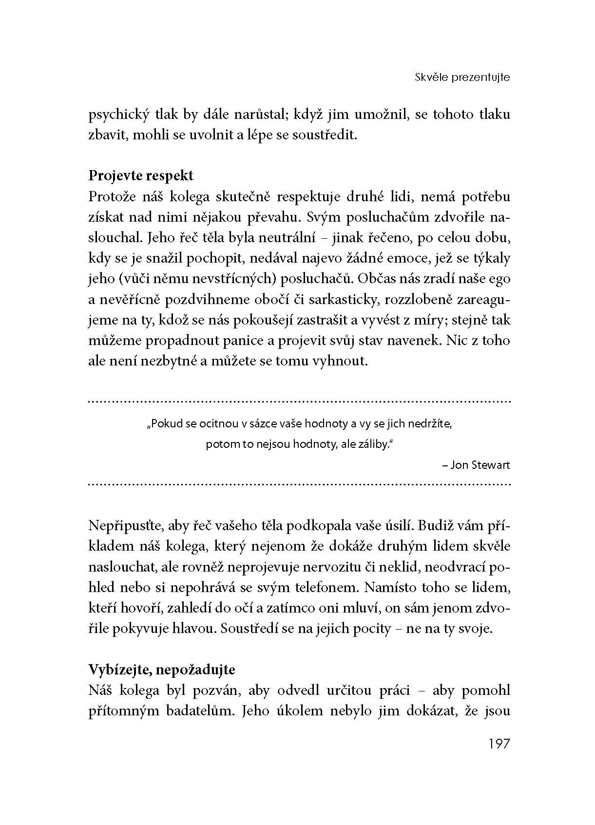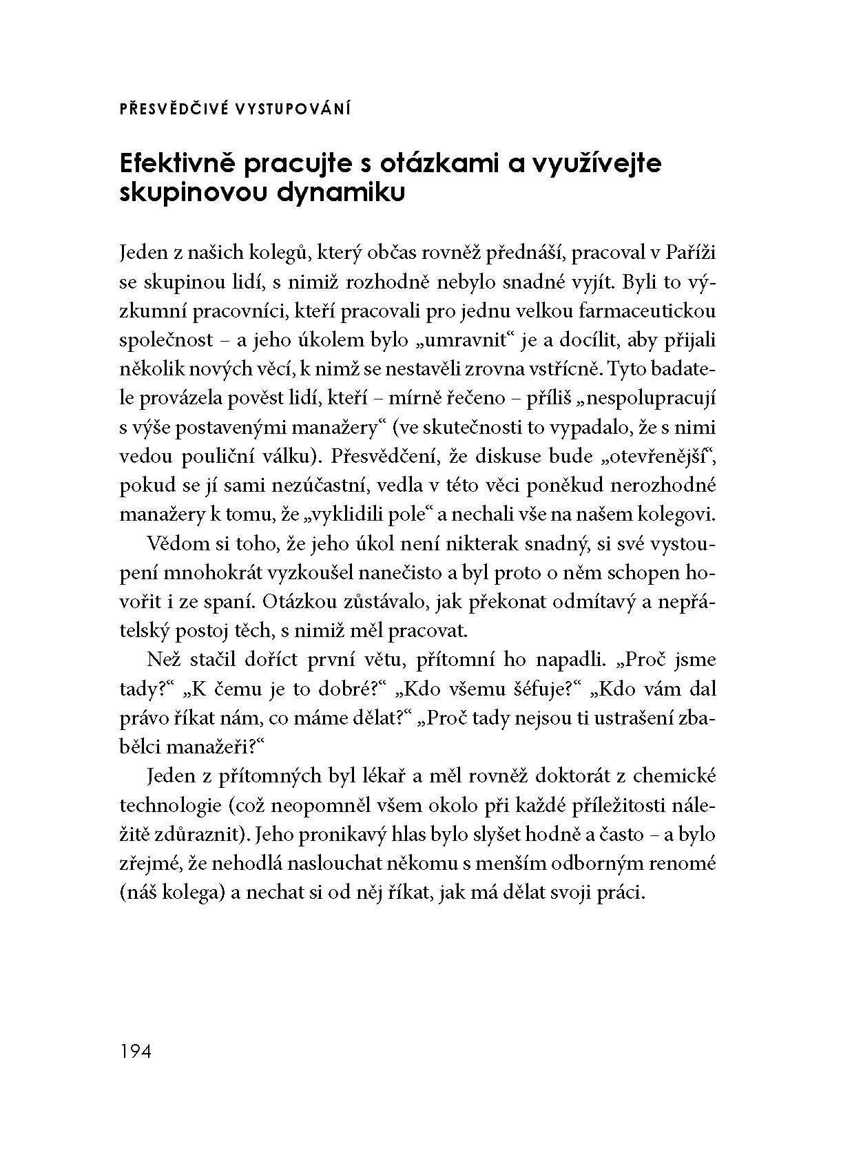 Nejnovější publikace z dílny autorů společnosti FranklinCovey je určena každému, kdo chce důsledně rozvinout jednu z klíčových schopností a dovedností nezbytných v současném světě byznysu – zaujmout a účinně sdělit vše, co chceme, aby se ostatní dozvěděli a přimět posluchače, aby jednali tak, jak potřebujeme. Autoři přinášejí praktický model umožňující přednášejícímu získat a udržet pozornosti posluchačů a především prostřednictvím prezentace efektivně dosáhnout svého cíle. Kniha nabízí množství neocenitelných, zcela konkrétních a snadno využitelných rad a doporučení, podložených jak nejnovějšími výzkumy, tak mnohaletou zkušeností autorů s jejich praktickým uplatněním.
