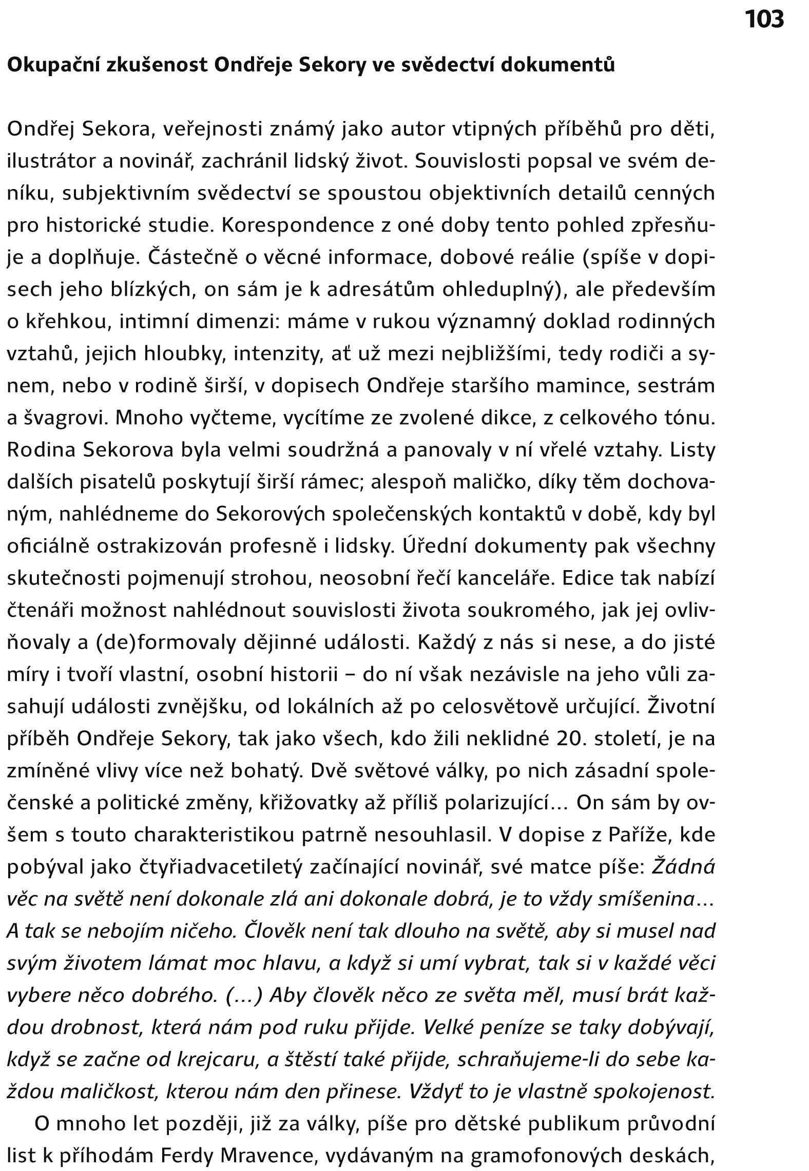 Právě oba deníky, které vycházejí knižně poprvé, jsou klíčem k Sekorově poválečnému levicovému postoji, k jeho snaze distancovat se od své prvorepublikové minulosti i k jeho rostoucímu odporu k jakémukoli násilí. Civilnost a všednost Sekorových záznamů je někdy téměř šokující, někdy úsměvná (Jeden kolega, když se kritizovaly větrné latríny, se zanícením se rozpovídal: „Páni, až bude po válce, tak si vezmu asi pět cigaret, půjdu doma na záchod, a budu tam sedět celou hodinu!“), a mezi řádky tak i po mnoha letech vysvítá Sekorův chlapský a nepateticky odvážný postoj.