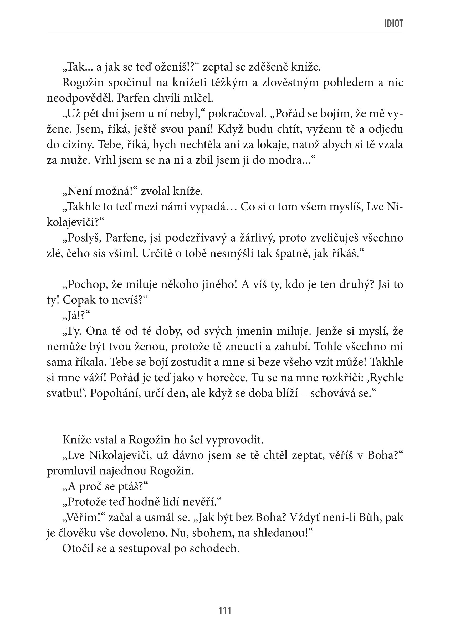 Román Idiot se řadí k nejznámějším dílům ruské literatury a zaujímá zvláštní postavení mezi romány Fjodora Dostojevského. Je to autorův jediný román, ve kterém je hlavním hrdinou člověk kladný, až ideální. Hrdina, který věří, že vnitřní krása, ušlechtilost a láska k bližnímu může zachránit svět. Avšak střet knížete Myškina s realitou vede k tragickému konci. Společnost v něm totiž vidí blázna, idiota, který se se svou lidskostí liší od ostatních a nenachází u nich pochopení. Kníže prožije tolik vypjatých událostí, že se zhroutí a znovu začne trpět duševní chorobou.