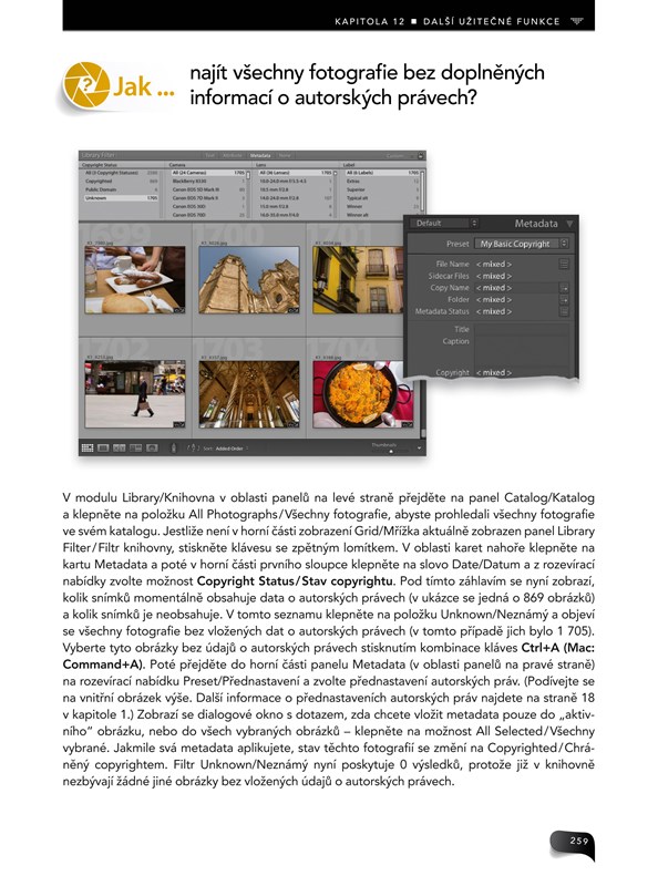 Lightroom se díky svým nepřeberným možnostem a stále se rozšiřující paletě nástrojů postupně stal povinnou výbavou většiny fotografů. Někdy je ale možností a nástrojů až příliš a může se stát, že to, co zrovna hledáte, je někde dobře ukryto. A že se zaseknete se při hledání jednoho tlačítka, se stává opravdu často, obzvlášť když chcete být s úpravami co nejdříve hotovi. A přesně pro tyto situace byla kniha vytvořena: abyste rychle a bez problémů našli vše, co zrovna potřebujete, i s návodem, jak dané nastavení či nástroj použít.