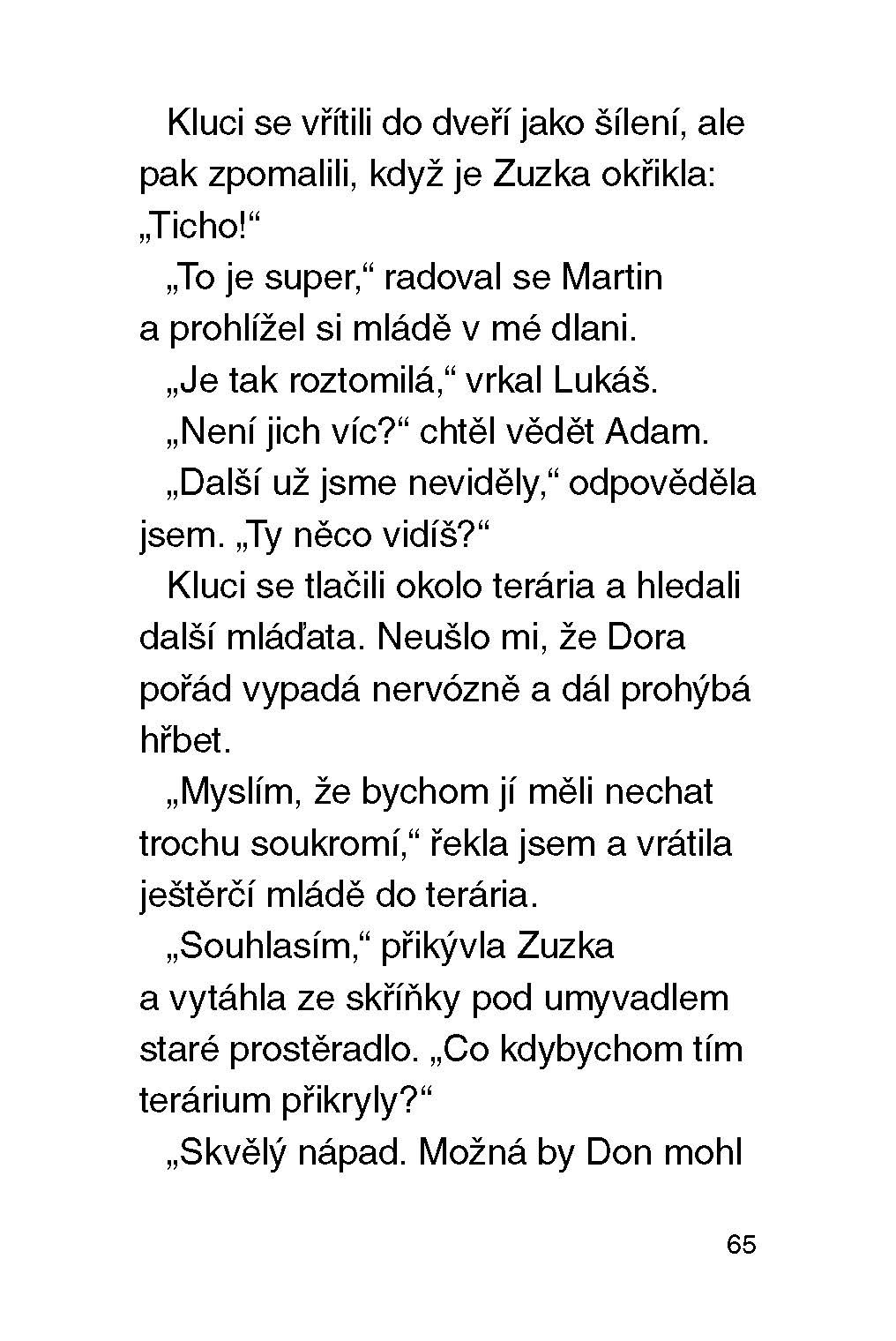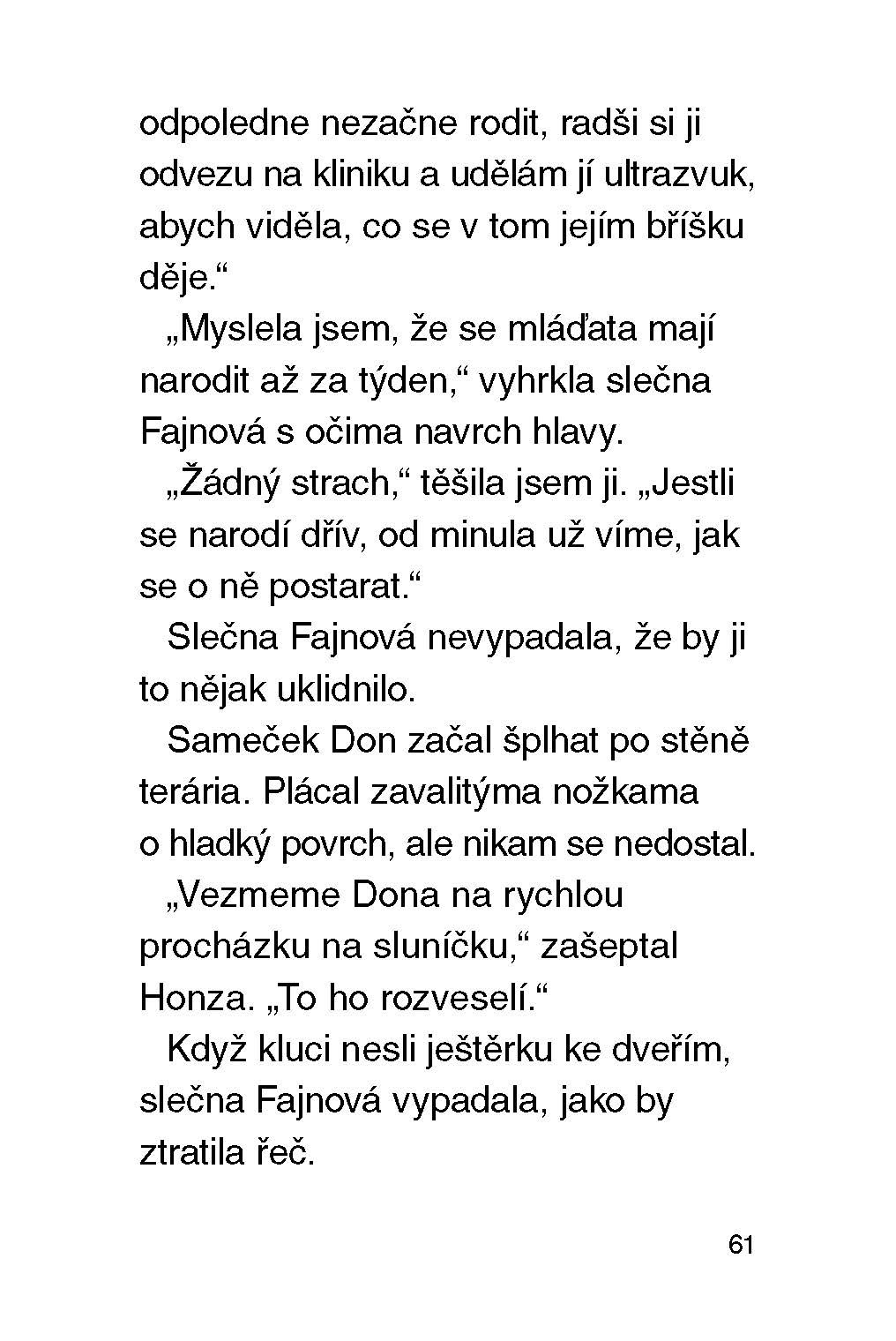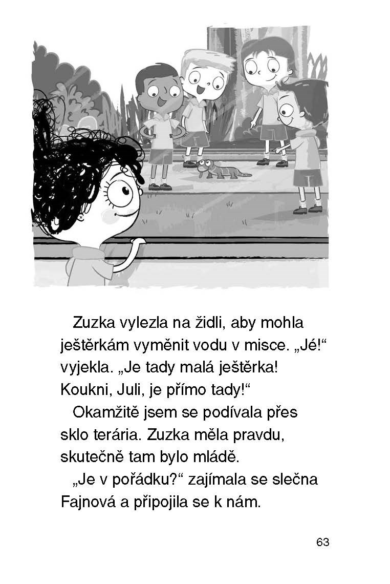 Škola, do které já a Zuzka chodíme, je prostě skvělá. Smíme mít totiž ve třídě zvířecí koutek. Staráme se v něm o morčata, ještěrky, rybičky a různé brouky. Tento týden budeme mít náhradní učitelku – slečnu Fajnovou. Ta toho o zvířátkách, bohužel, moc neví. Já a Zuzka naštěstí ano, takže doufám, že všechno půjde hladce.
