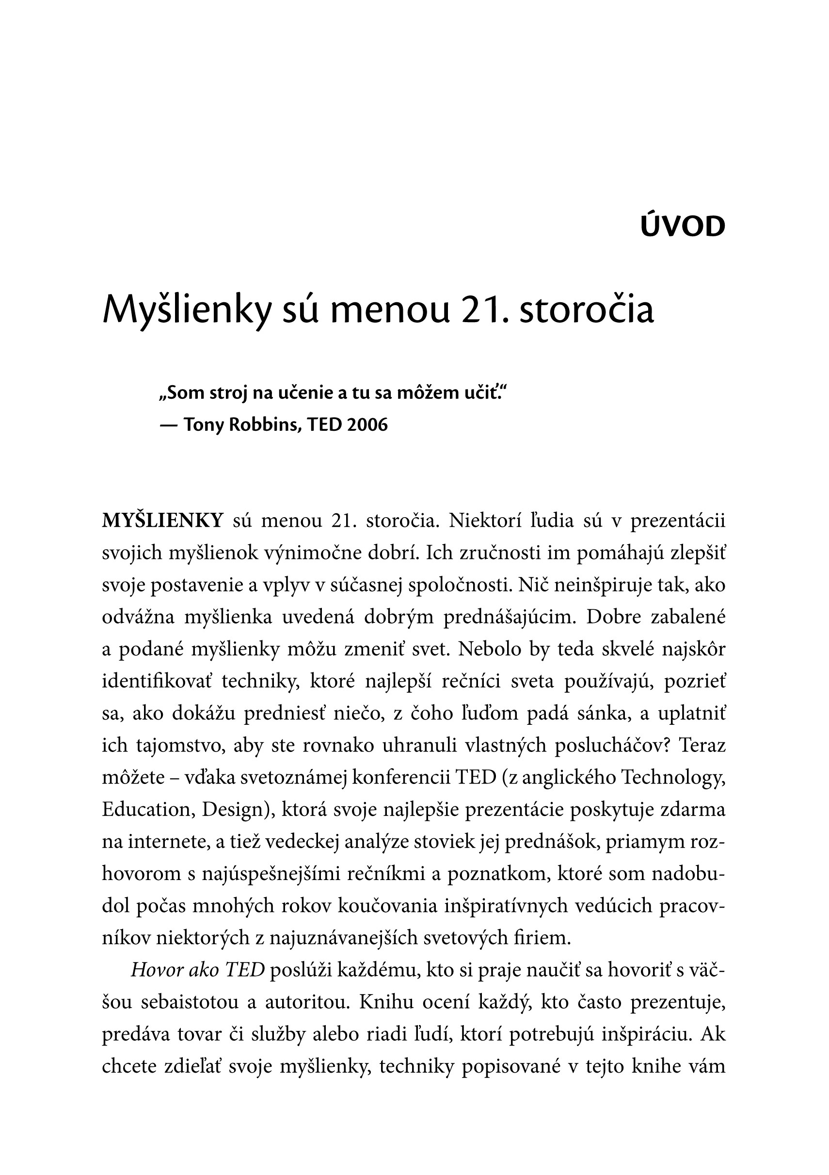 Nestačí mať skvelé myšlienky a nápady. Aby sme uspeli, musíme vedieť svoje nápady predať. To je zručnosť, ktorá otvára bránu k splneniu našich snov. Dobre zabalené a podané myšlienky môžu zmeniť svet. Niektorí ľudia sú v prezentácii svojich myšlienok výnimočne dobrí. A my ostatní sa to od nich môžeme naučiť. Táto kniha odhaľuje techniky najlepších TED rečníkov z celého sveta.