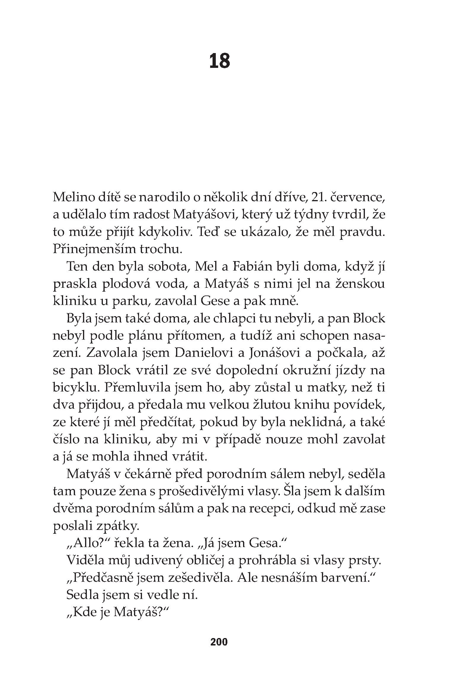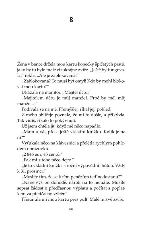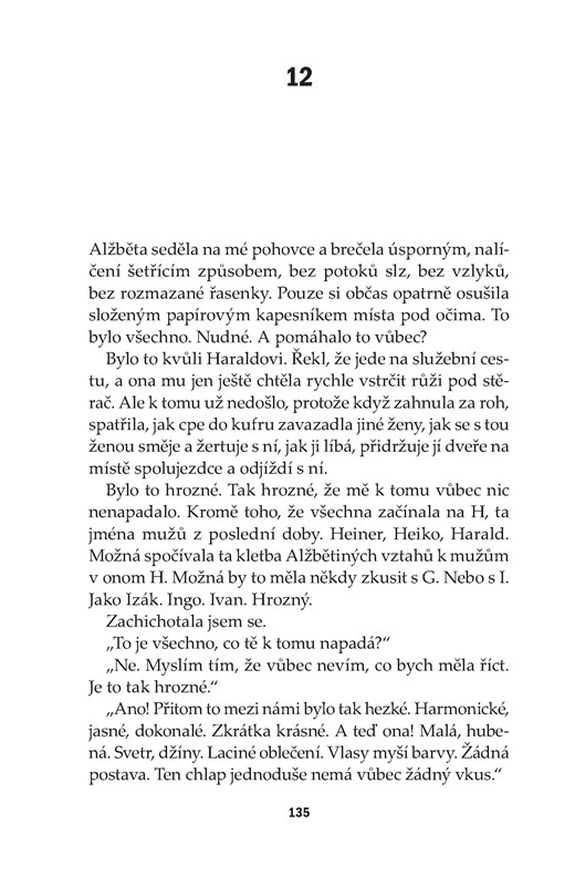 Stalo se mi to, co mi Alžběta prorokovala jako nejhorší konec mého dobrodružství: už jsem neměla vůbec žádného muže. Zato jsem měla v obývacím pokoji svou matku, která vyžadovala péči, a byt bez výtahu a domácího telefonu ve čtvrtém patře, ve kterém bylo najednou velmi málo místa, když tu kromě mě a matky byli ještě mí synové. A já byla šťastná. Protože moje máma ještě byla naživu a já mohla zase vidět své syny. Štěstí je také otázkou pozice, z níž se vychází.