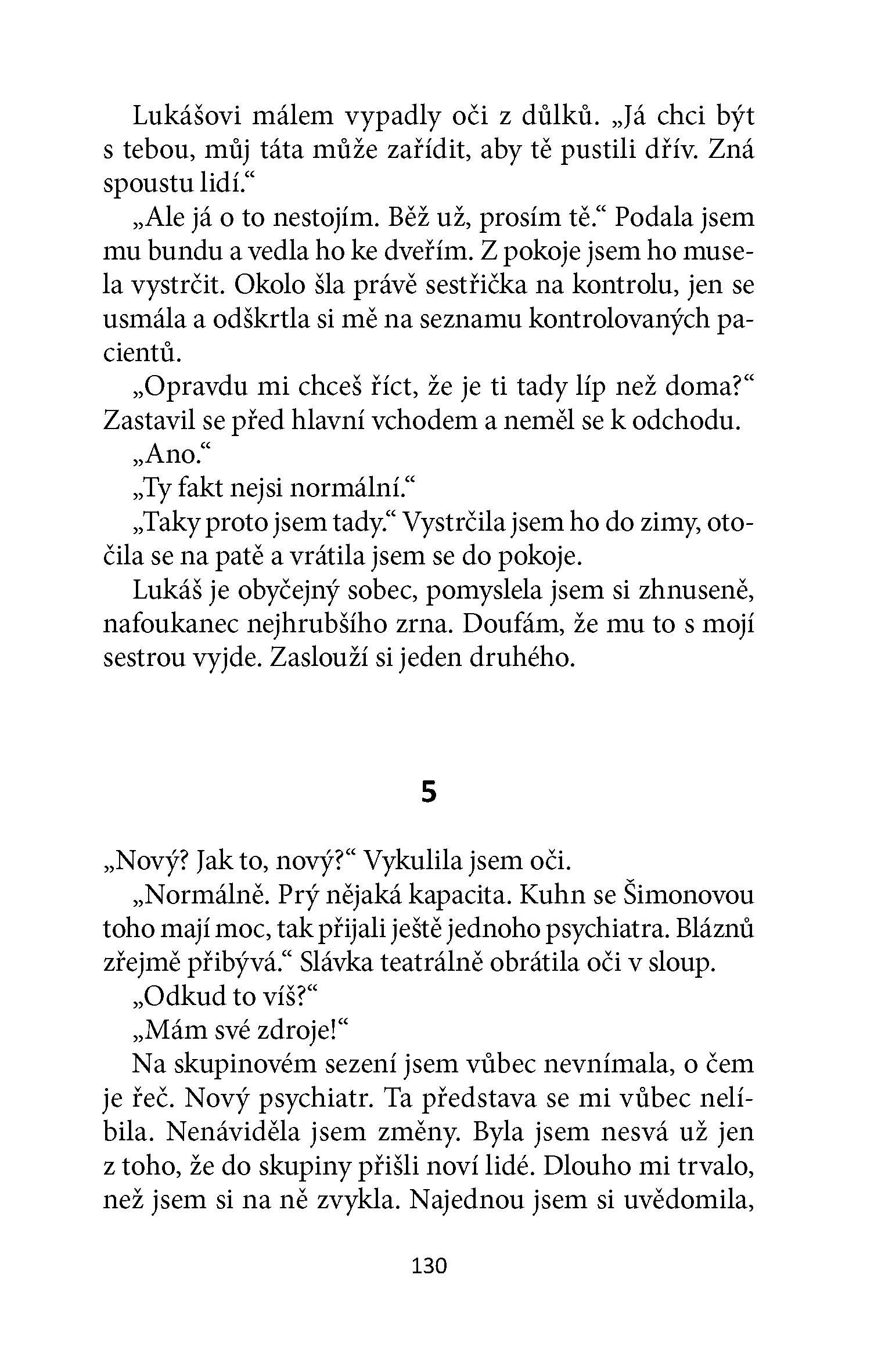 Hlavní hrdinka románu Lucie Saskové, autorky bestselleru Zlatokopka, chce jediné: být normální. Mít normální vztah, někoho milovat, být šťastná. Věci se ale nevyvíjejí tak, jak si představovala. Po smrti svého přítele se ocitá v psychiatrické léčebně a její svět se obrací vzhůru nohama. Najednou je pro ni těžké normálně fungovat, vyznat se ve vlastních vzpomínkách, stát si za svými činy. Je to, co si pamatuje, pravda, nebo bylo všechno jinak? A bude mít ještě šanci začít znovu a vybudovat si vysněný život s mužem, který jí jako jediný rozumí? Vše se zdá být nejisté a ohrožené; je totiž nebezpečná. Pro sebe i pro své okolí.