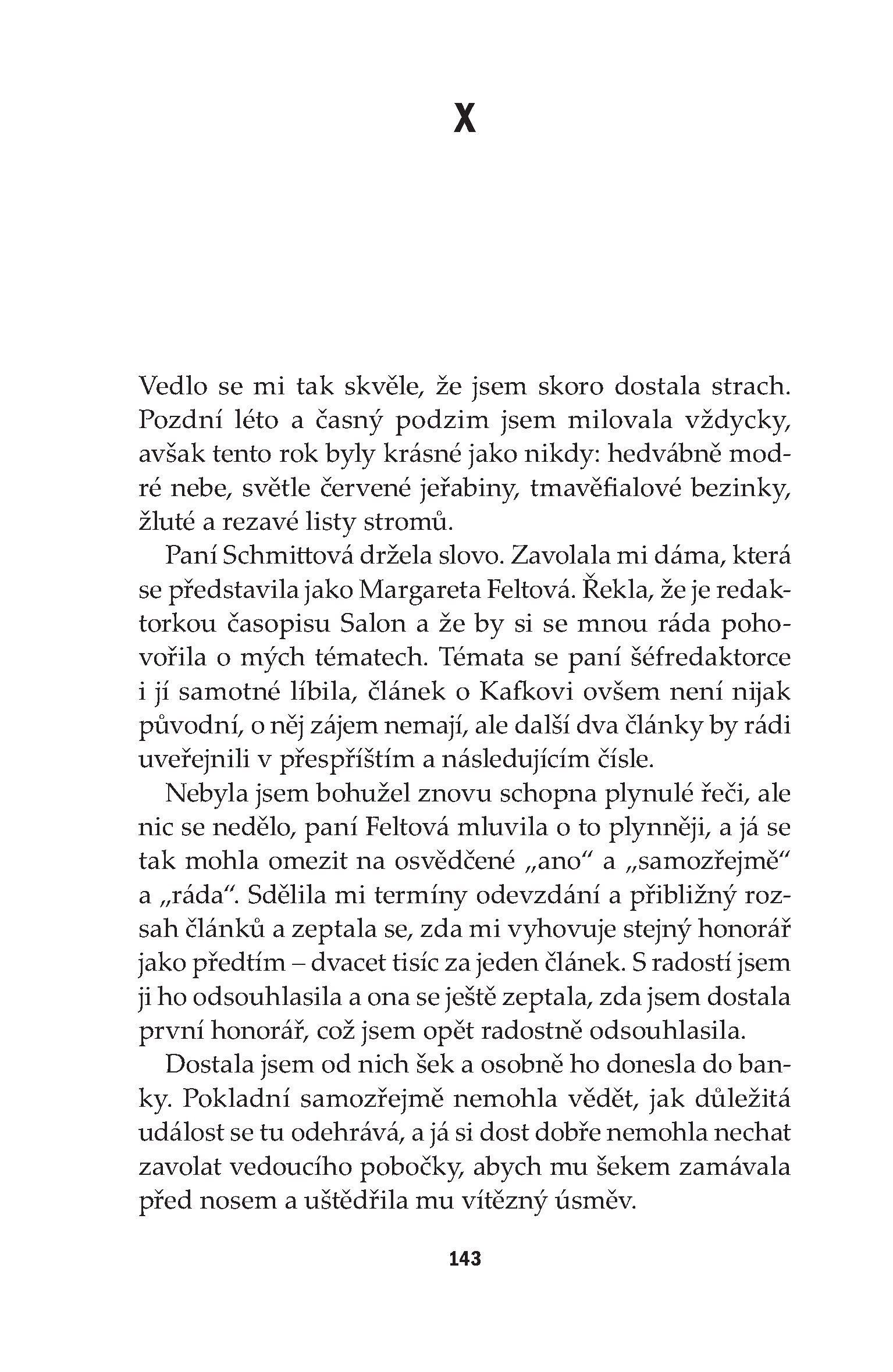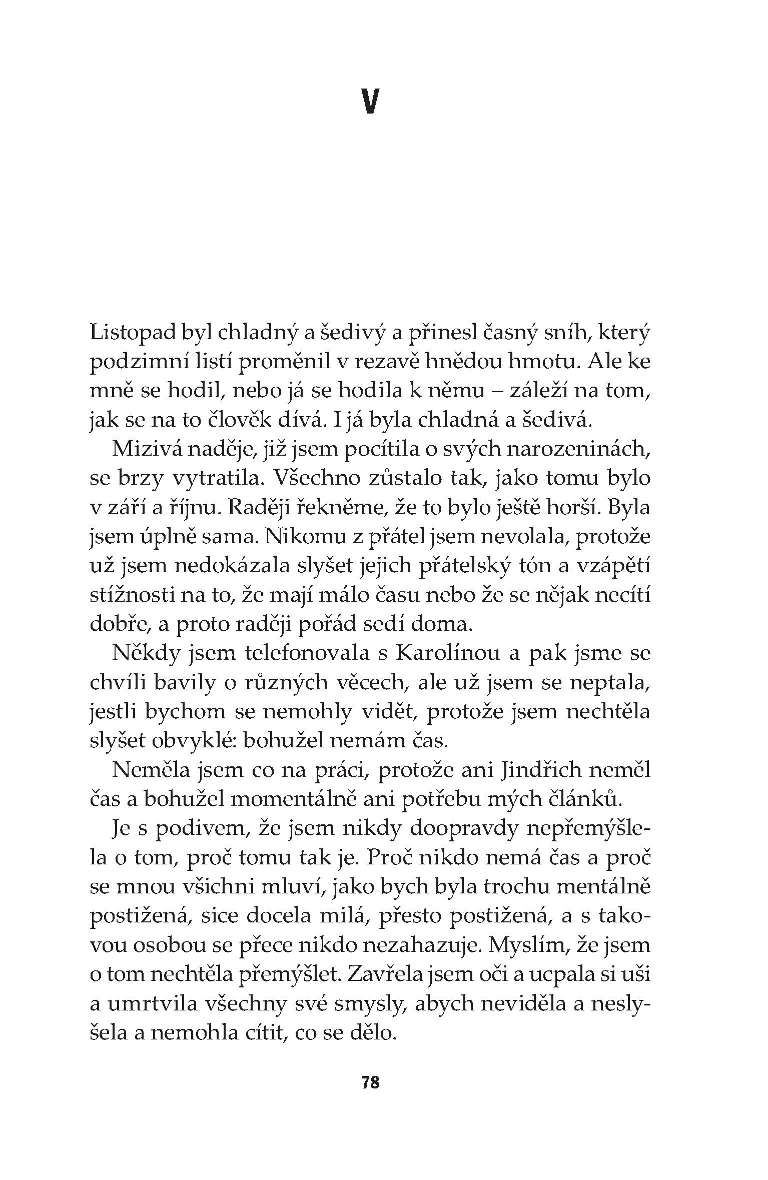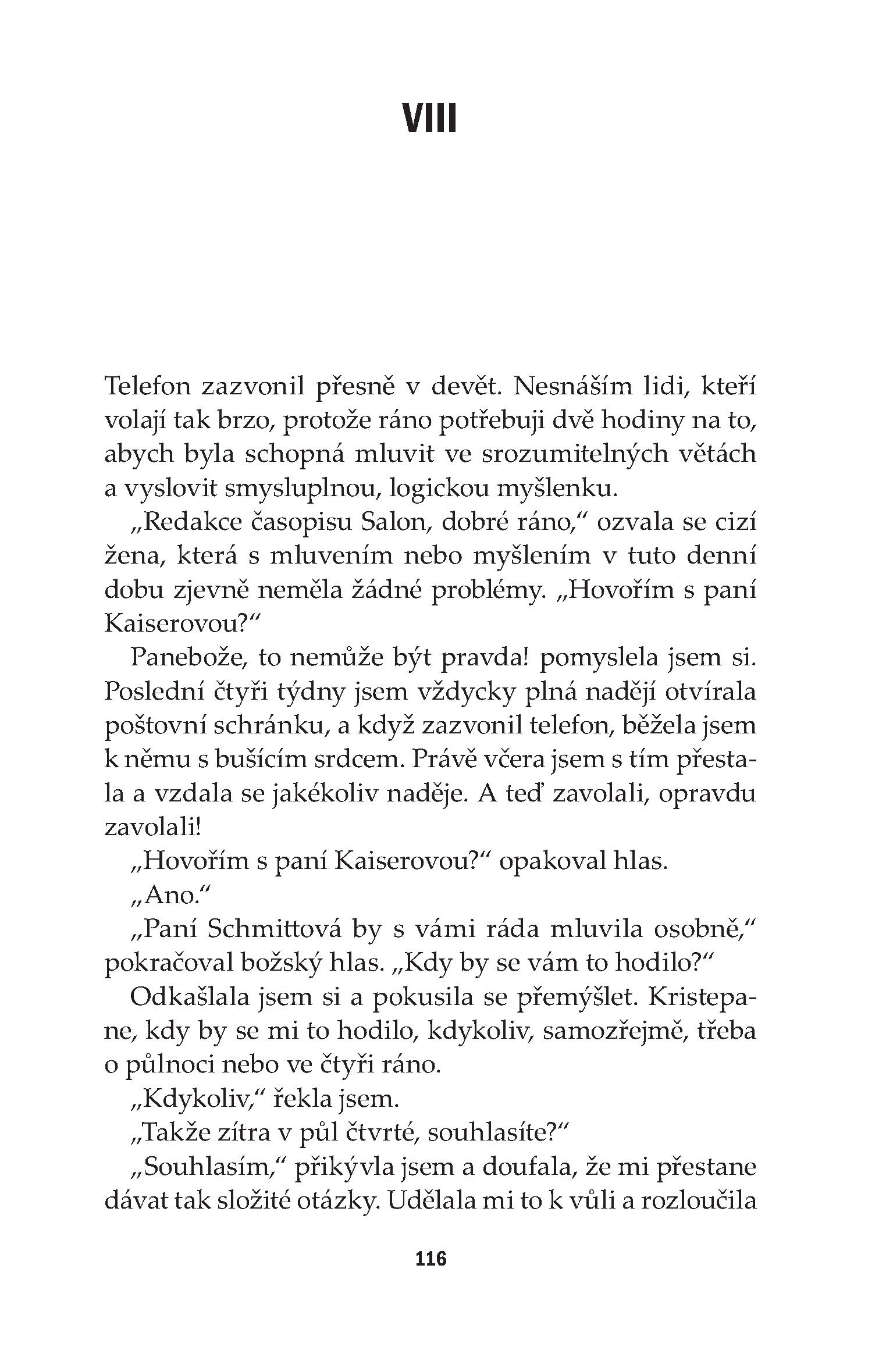 Rudolf mi také řekl, že mi jistě bude milejší, když bude spát ve svém pokoji. Nepřemýšlela jsem ještě o tom, co by mi bylo milejší, avšak s jistotou jsem věděla, že to je určitě milejší jemu. Může klidně spát – slyšela jsem jeho tiché chrápání, když jsem šla do koupelny – bez ženy po boku, která by mohla být nepříjemně hysterická nebo ironická anebo by ho mohla uprostřed noci vzbudit a ptát se na detaily.