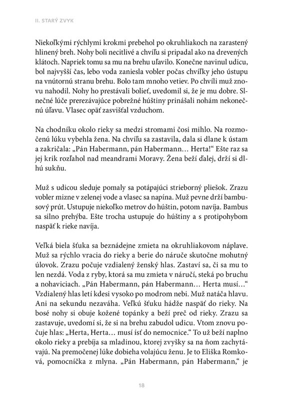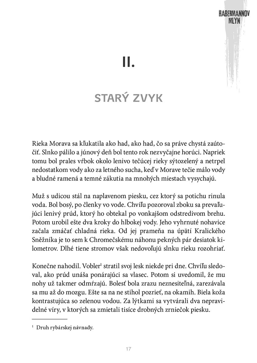 „V místnosti bylo teplo, vlahý letní vzduch pronikal otevřeným oknem do pokoje. Habermann seděl u stolu a poslouchal zprávy z fronty, byl zcela ponořen do svých myšlenek, byl králem svého malého království, na krátký čas, právě teď. Vítr mu čechral kaštanové vlasy v nepravidelných závanech, ve kterých cítil vůni pomletého obilí a také chlad nedaleké řeky. Podvědomě se usmál a rozevřel dlaň na stole. Mozolnatá rozrytá kůže se stovkami jemných vrásek.“
