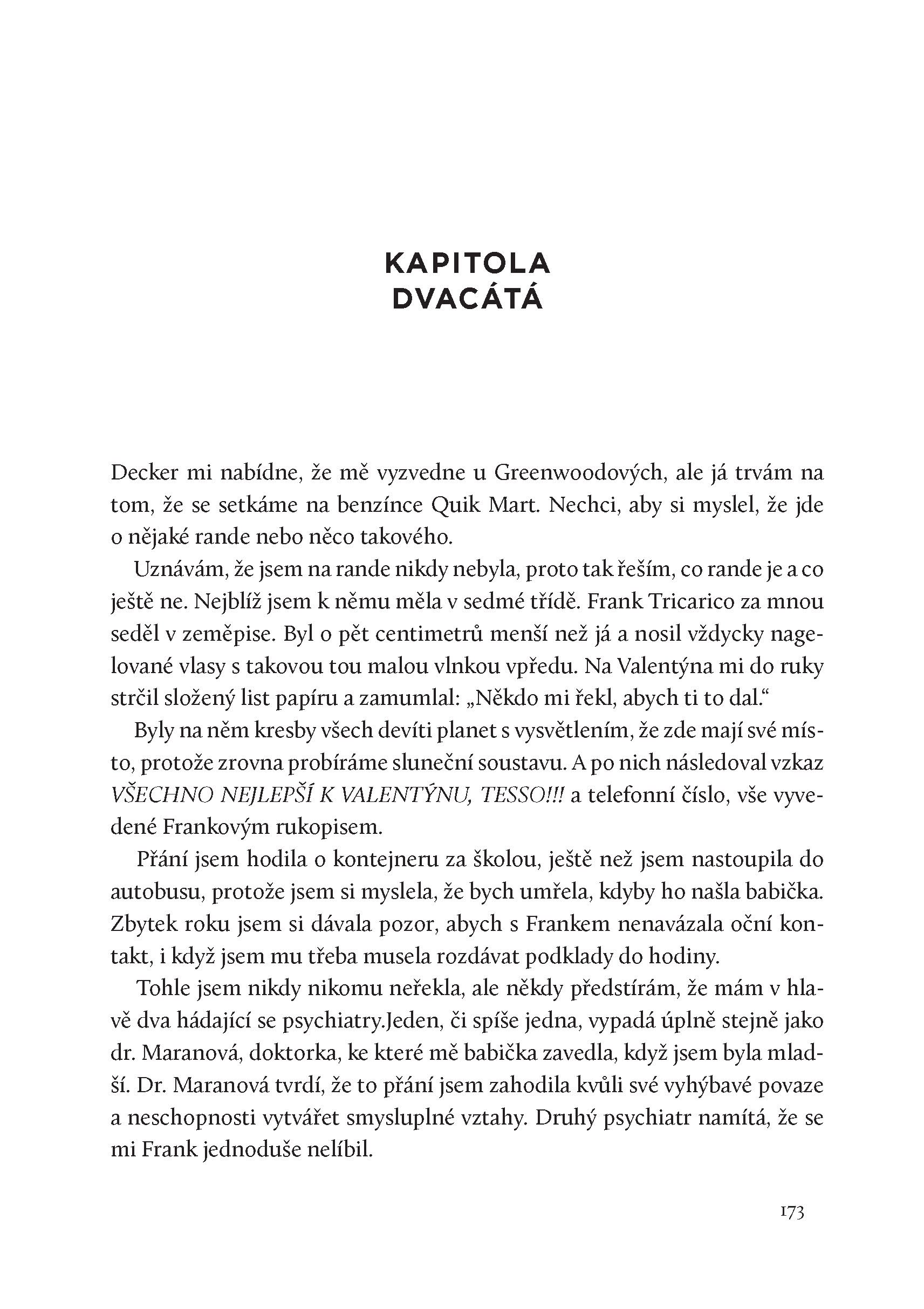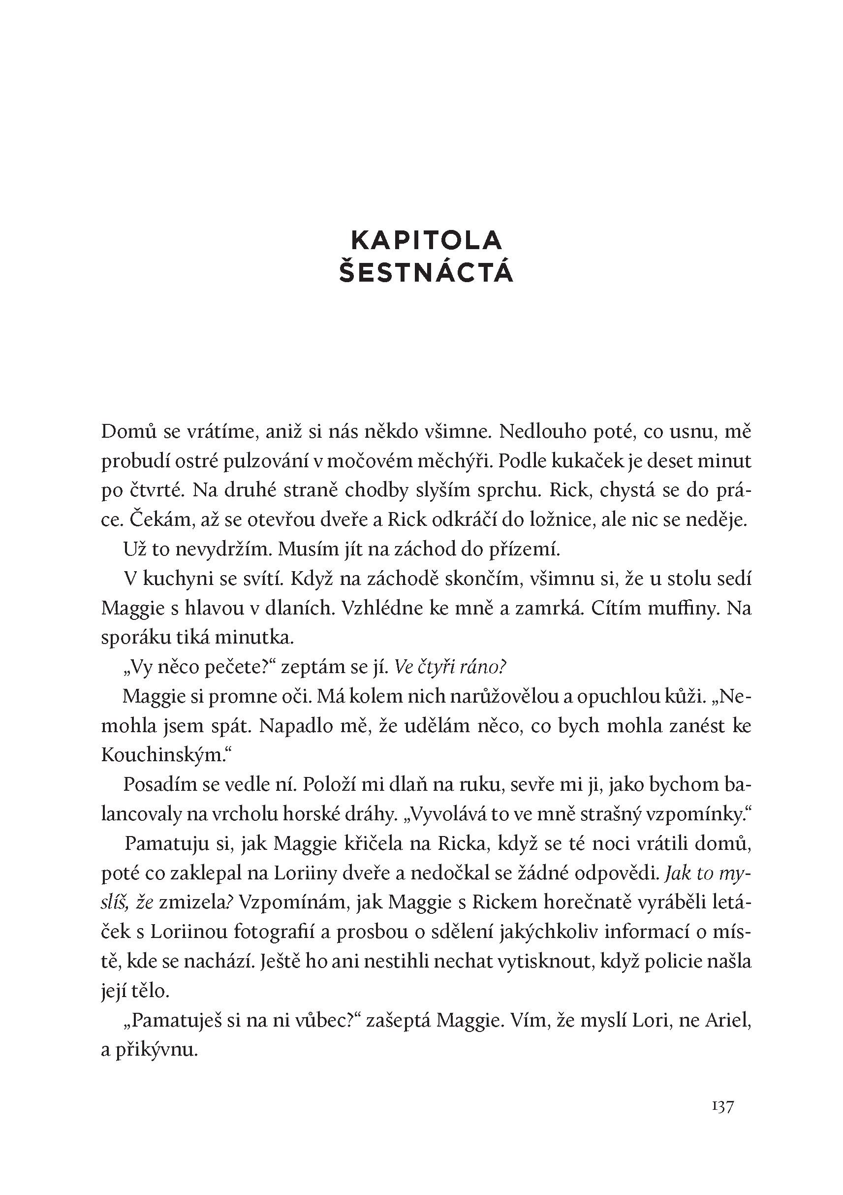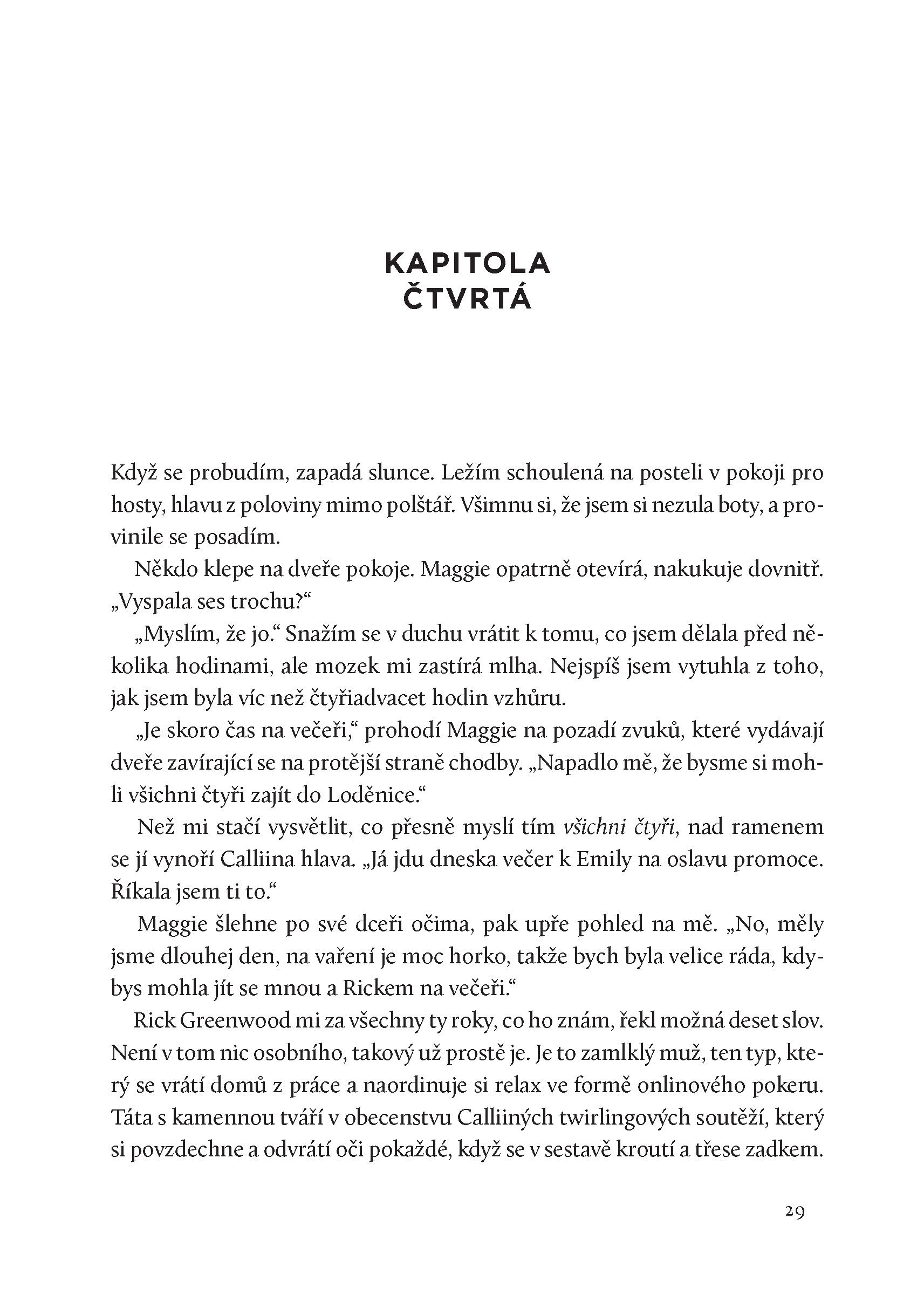 Tessa a Callie se spolu nikdy nebavily o tom, co tenkrát v noci viděly. Po skončení soudního procesu se už nikdy neviděly. Nevolaly si ani nepsaly. Tessa sice odešla daleko, ale s sebou si odnesla nezodpovězené otázky. Některé věci se nikdy nevysvětlily. Teď se vrací do Fayette – za Wyattem Stokesem čekajícím na trest smrti, za Lori Cawleyovou, Calliinou sestřenicí, která byla zavražděna, a za jedním člověkem, který možná ví, co se tenkrát doopravdy stalo.