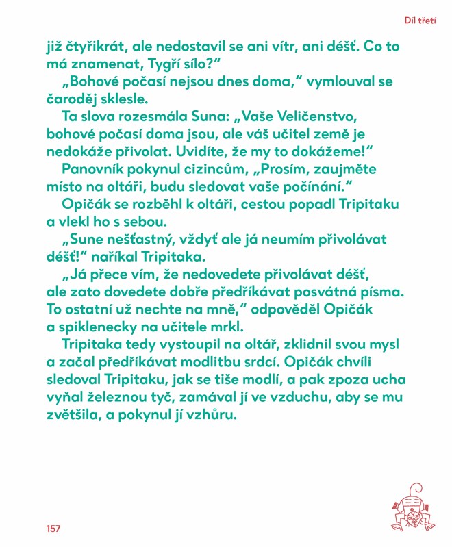 Ak by ste ma pod hrozbou hrubého násilia prinútili menovať len jednu knihu, ktorá ma minulý rok potešila po obsahovej a vizuálnej stránke najviac, spomenula by som bez rozmýšľania práve toto dielo. A slovo dielo je zaslúžene na mieste. Toto jedinečné vydanie Opičieho kráľa, ktoré vyšlo znovu (prvé vydanie uzrelo svetlo sveta v roku 1961) symbolicky v roku 2016 – roku Opice, vzniklo v spolupráci s galériou Galerie Zdeněk Sklenář v adaptácii Jana Jiráňa. Spomínaná galéria je známa nielen svoju výstavnou činnosťou, ale aj bibliofíliami. Odvážne prevedenie má na svedomí Studio Najbrt, ktoré stavilo na písmo Zirkel v troch veľkostiach. Tie sa naprieč knihou striedajú (podobne ako sa zväčšuje a zmenšuje opičiakova zlatá palica). Väčší rozmer publikácie (240 × 290 mm) dáva priestor vyniknúť nádherným ilustráciám Zdeňka Sklenářa, no jej väzba, výber papiera robia knihu „ľudskou“, praktickou – výborne sa s ňou manipuluje, nie je ťažká ani do detských rúk. Jednoducho máte chuť ju čítať, dotýkať sa jej, a nie len vyložiť za sklo. Knihe opodstatnene patrí čestné miesto v prestížnom katalógu Nejlepší knihy dětem za obdobie 2015/2016, ktorý predstavuje výber toho najlepšieho zo súčasnej českej literatúry pre deti a mládež. Výber zostavuje Zväz českých kníhkupcov a nakladateľov a Česká sekcia Medzinárodnej organizácie pre detskú knihu (IBBY). Opičiak Sun, známy ako Opičí kráľ, patrí v Číne medzi mimoriadne obľúbených, kultových hrdinov. Život tejto postave vdýchol v 16. storočí Wu Čcheng-en prostredníctvom slávneho románu Putovanie na západ. Tento nebojácny, roztomilý superhrdina so správaním uličníka a dušou hrdinu si získal moje srdce najprv vďaka seriálu z roku 1986 s rovnomenným názvom. Knižné ilustrácie Zdeňka Sklenářa získali obdiv aj v Číne, a to nielen vďaka výstave v Pekingu (v roku 2009), ale aj Svetovej výstave EXPO 2010 v Šanghaji, kde ich s nadšením prijali milióny divákov. Svoj obdiv im vyjadril i najslávnejší predstaviteľ Opičieho kráľa z už vyššie spomínaného seriálu – herec Liou Siao Ling Tchung, ktorého doslov nájdete aj v knihe.Opičiak Sun, chuligán s nezvyčajným pôvabom, majster premien – dokáže sa premeniť na 72 spôsobov, zažíva počas svojich potuliek svetom nezvyčajné dobrodružstvá a stretáva postavy z čínskej mytológie. Napriek všetkým svojim super schopnostiam je niekde hlboko vo svojom vnútri veľmi podobný a blízky obyčajným ľuďom – má svoje svetlejšie chvíľky aj zlé dni. A aj to je jeden z dôvodov, prečo patrí medzi najobľúbenejších hrdinov nielen vo svojej rodnej Číne.