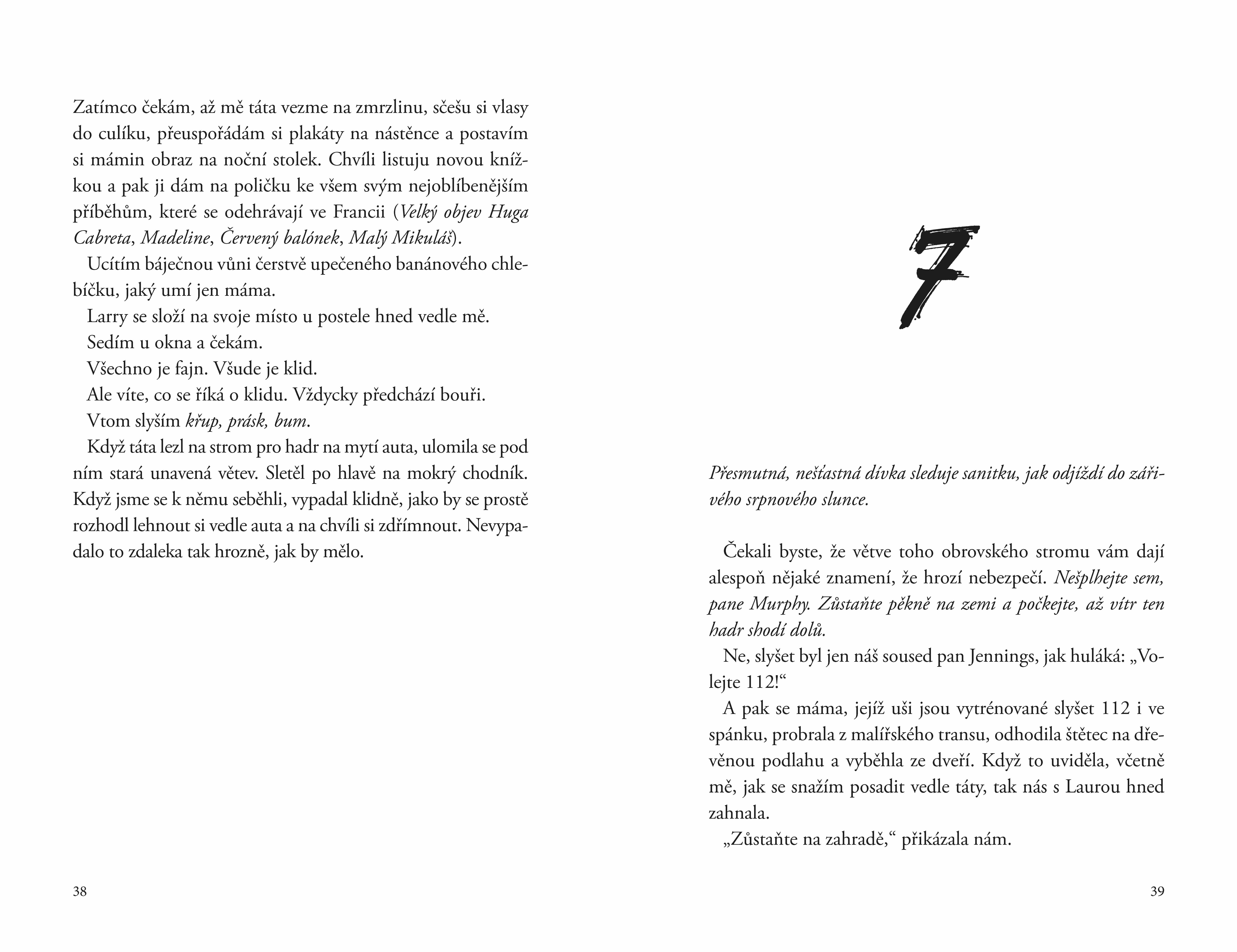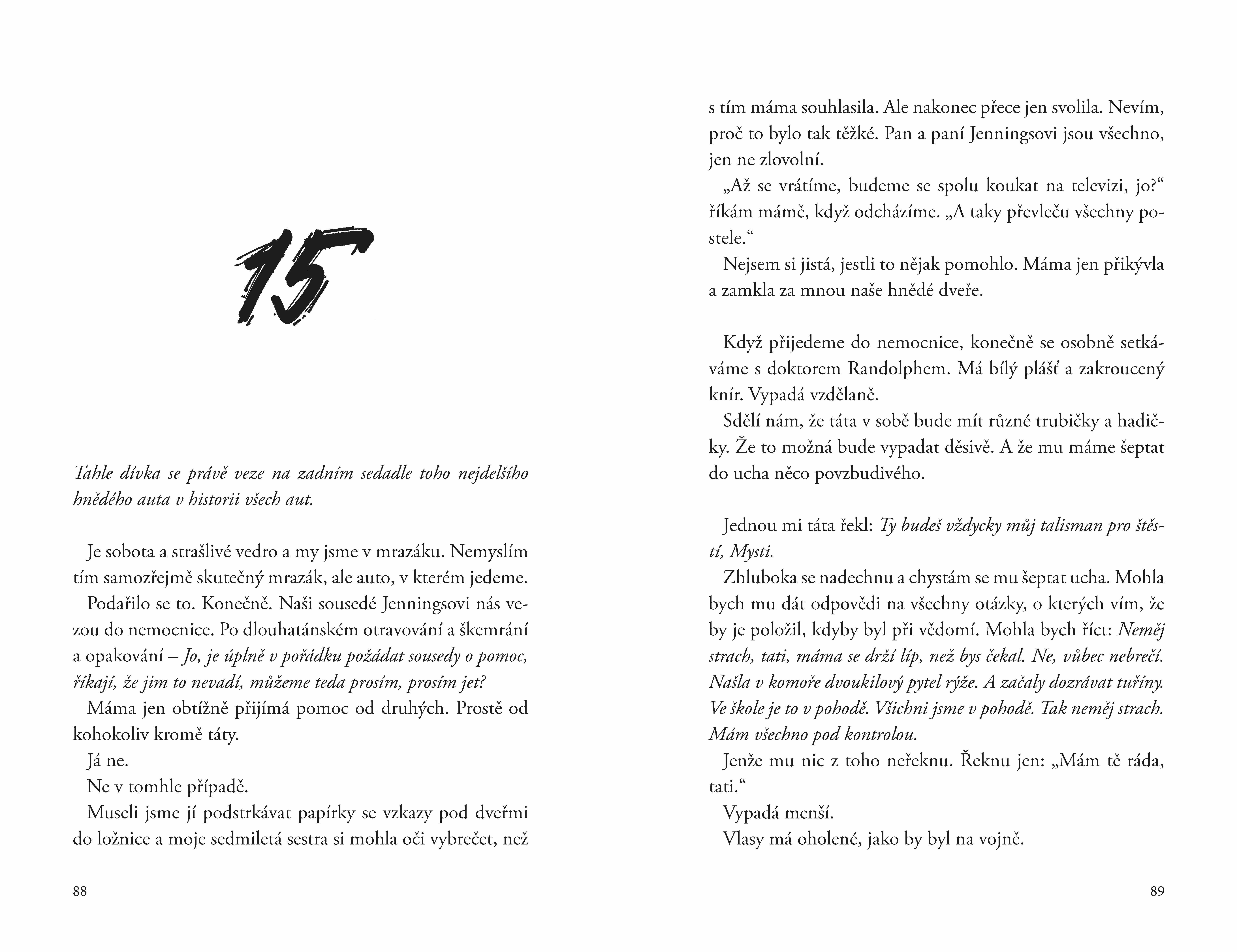 Dvanáctiletá Mysti by nejraději byla postavou z knížky, protože kdyby žila ve vymyšleném světě, třeba by věděla, jak se vyrovnat s tím, že ji opustil nejlepší kamarád, a dovedla by se o všecko postarat, protože táta je v nemocnici. Ale život není kniha, a tak si musí Mysti poradit sama. Pomůže jí v tom horkovzdušný balon, nový kamarád nebo zářivě oranžový kabát?
