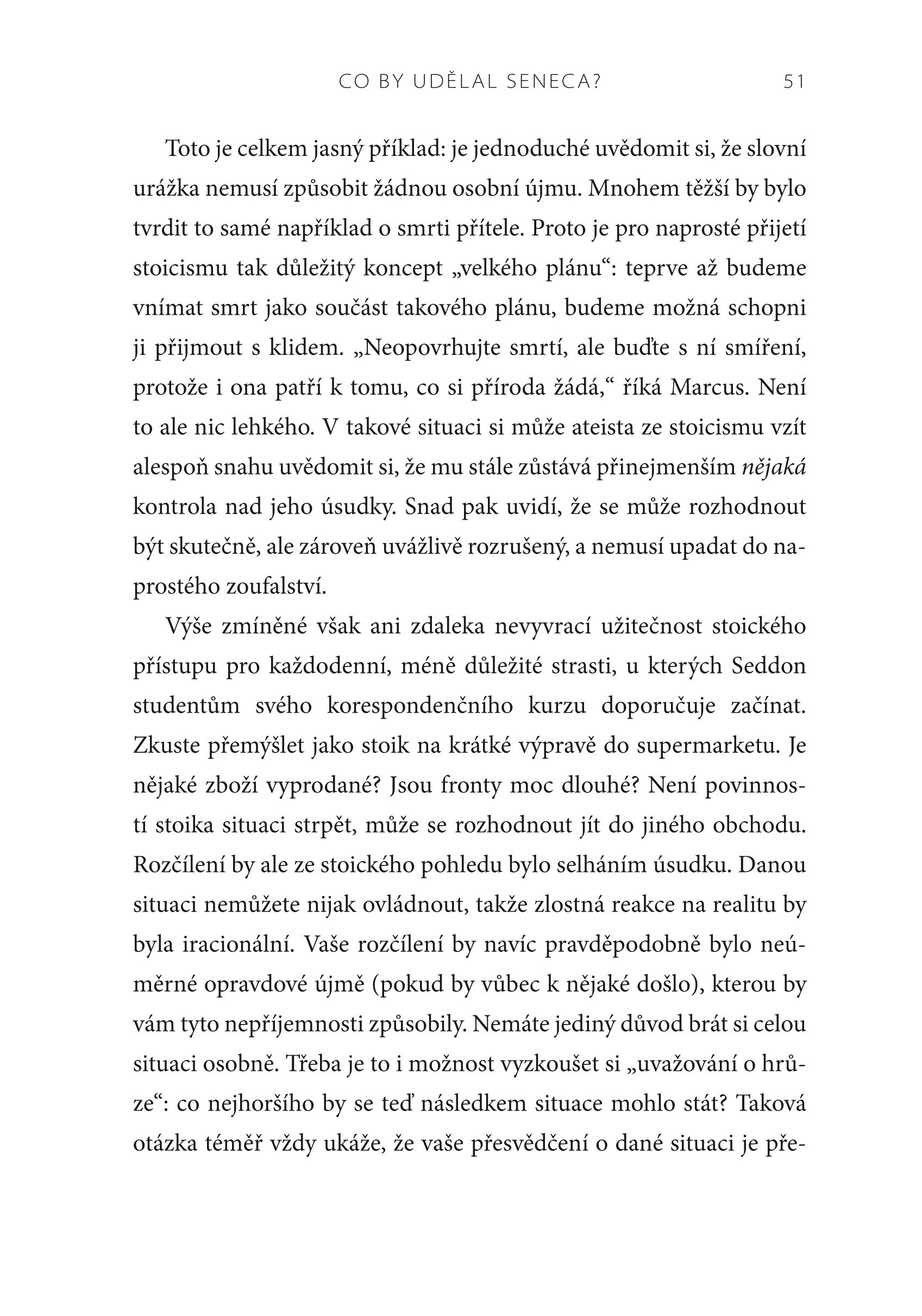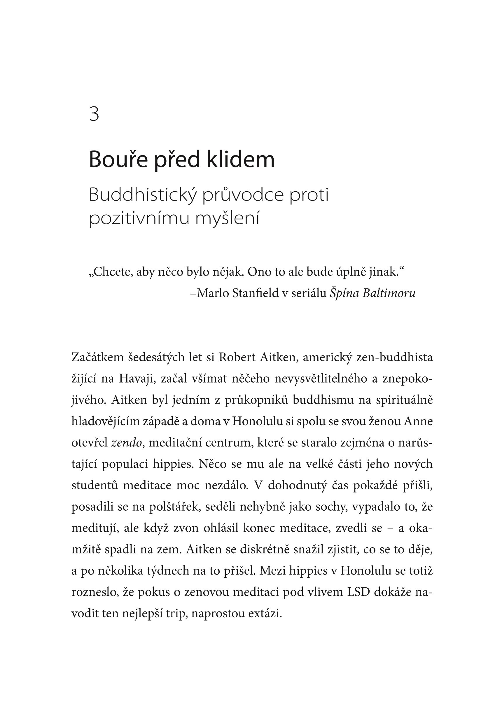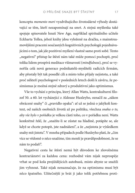Oliveru Burkemanovi došlo, po letech strávených rozhovory s psychology, filozofy i buddhisty, že se všichni shodují v jednom: POŘÁD SE HONÍME ZA ŠTĚSTÍM, A PRÁVĚ KVŮLI TOMU SE CÍTÍME TAK MIZERNĚ. Abychom byli opravdu šťastní, možná musíme být ochotní prožívat více negativních emocí – nebo se přinejmenším naučit přestat před nimi tak utíkat. Jednoduše přijmout vlastní selhání, nejistotu a smrtelnost, dovolit si nemít vše pod kontrolou, cítit se smutně a špatně, zkrátka vše, čemu jsme se doposud snažili cíleně vyhnout.