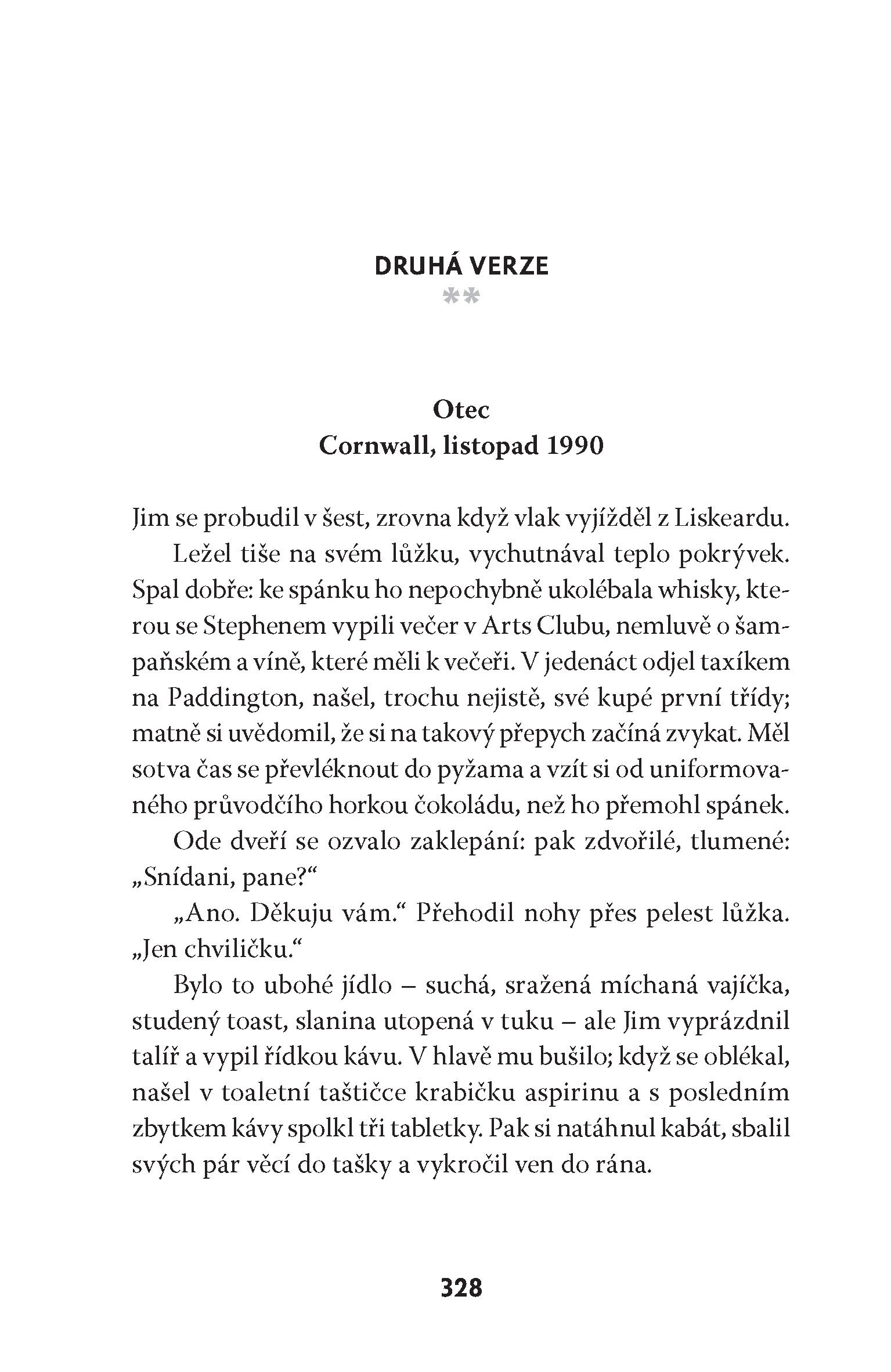 Žena na obraze měla vlasy tmavě hnědé, s kaštanovým leskem. Odvracela se, dívala se na muže, který seděl za ní na pohovce v obývacím pokoji; díval se na ni a zároveň i na diváka s výrazem, který měl být podle Jima nečitelný. V tu chvíli měl největší starost o toho muže – který byl a nebyl on sám, stejně jako tou ženou byla Helena i Eva Katzová a všechny ženy, které kdy potkal –, muže, který vypadal příliš nešťastně. Měla to být třetí část triptychu. Ostatní dvě už byly zabalené a stály opřené o zeď ateliéru a byly téměř stejné, jen s menšími obměnami. Na prvním z nich seděla žena a muž stál, na druhém seděli oba. Jim změnil také drobné detaily v místnosti, místo, na kterém za pohovkou stály hodiny, pohlednice a foto grafi e na krbové římse, barvu kočky odpočívající na křesle (jen jedna z nich byla černobílá na počest Marcela). „Něco jako hledej pět rozdílů,“ poznamenala Helena, když jí poprvé vysvětlil svůj nápad. Samozřejmě žertovala, ale on dobře cítil i ten osten. Jeho ambice s triptychem byly mnohem větší. Obraz měl znázorňovat všechny cesty, které zůstaly nevyužité, mnohé životy, které nebyly žity, životy, které nikdo ne žil. Nazval ho: A co kdyby to bylo jinak?
