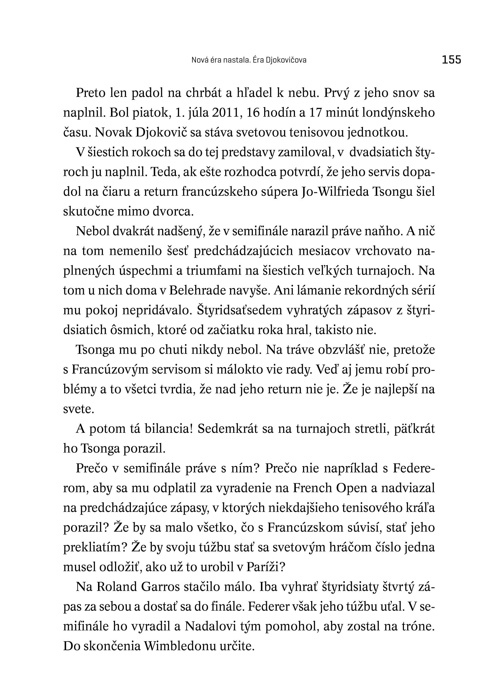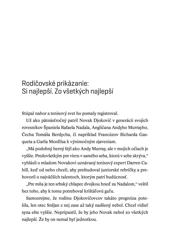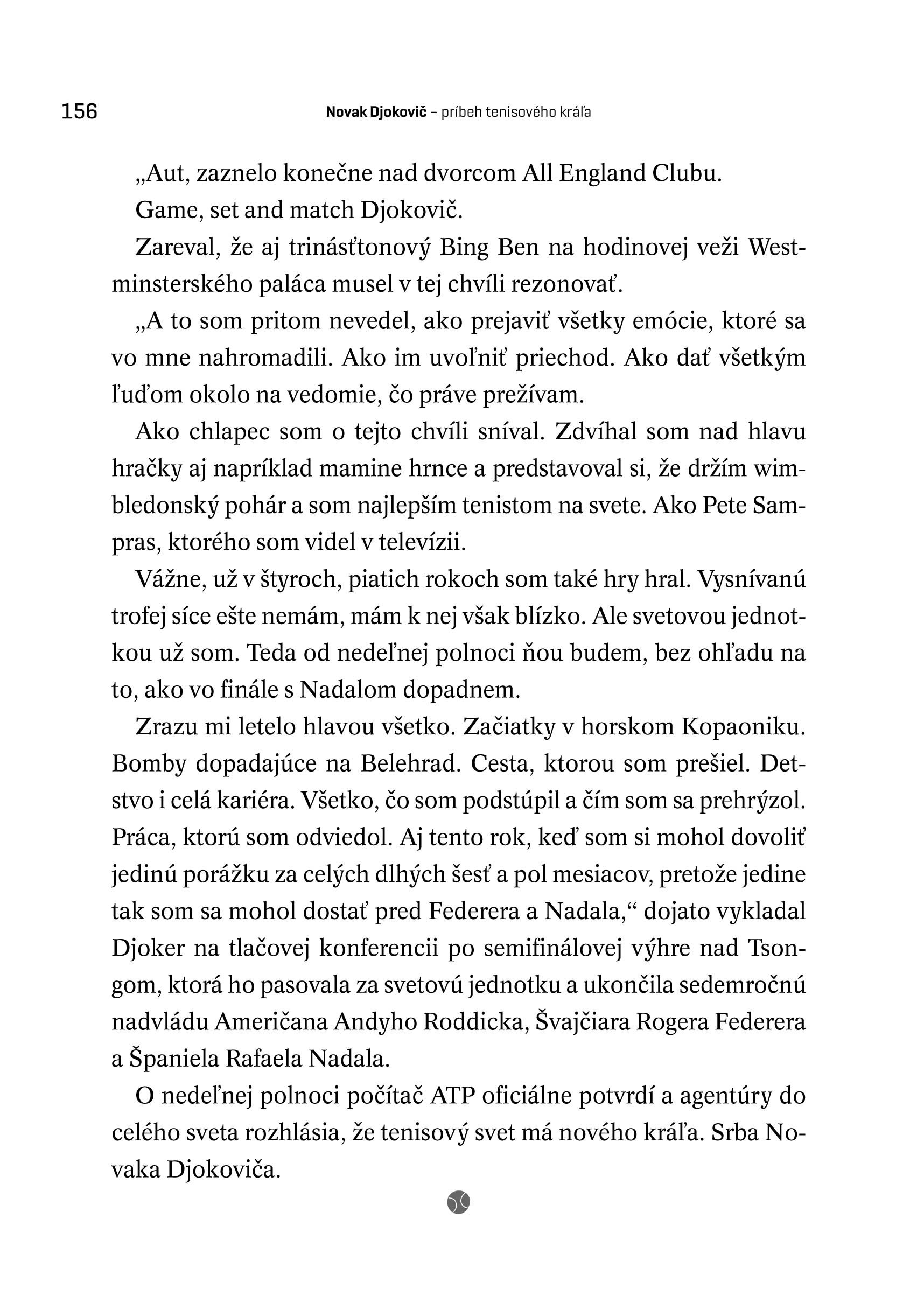 Športový novinár Zdeněk Pavlis sleduje životnú cestu Novaka Djokoviča z Belehradu až na tenisový trón. Všíma si to, čo musel v záujme toho obetovať, obdivuje jeho talent a energiu, ktorú dáva do tenisu. Na tejto biografii sa tiež podieľal osobný tréner tenistu Marián Vajda, pričom vznikla s vedomím samotného Novaka Djokoviča.