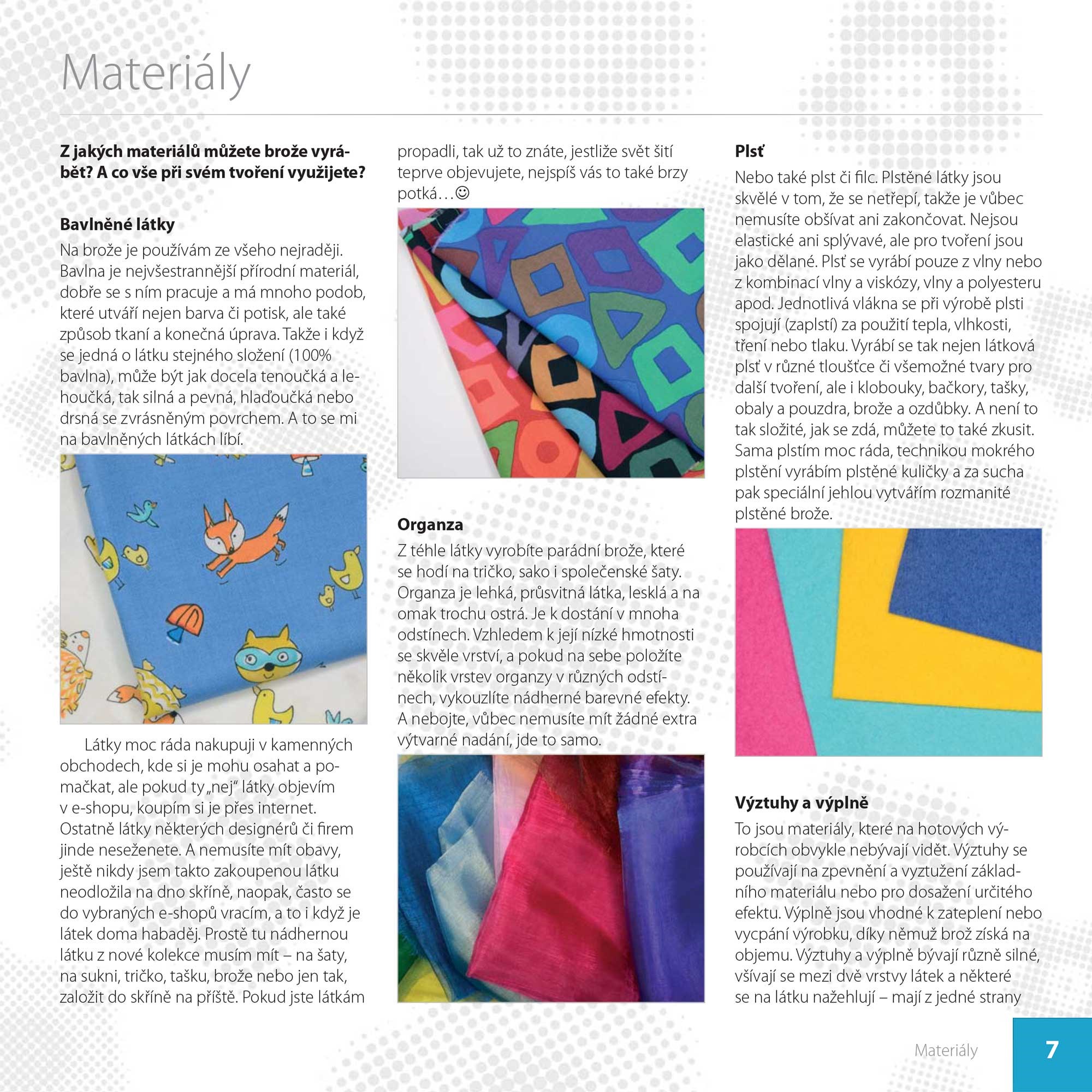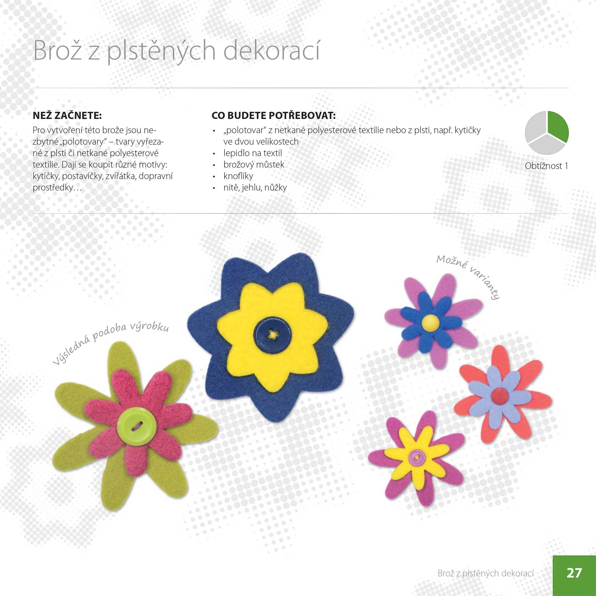 Praktický průvodce tvorbou 25 originálních broží včetně dvou sad se sponkou, čelenkou, prstýnkem a ozdobou na krk. S pomocí této knihy vytvoříte nevšední a originální brože jak pro sebe, tak pro své blízké a všechny kamarádky. I docela malé módní doplňky totiž dokonale oživí váš šatník, ozvláštní kabát, sako, svetr, tašku i batoh a rozveselí každý chmurný den. Návody jsou doplněny detailními fotografiemi, podrobnými popisy a nechybí ani praktické rady a tipy. Samozřejmostí jsou doprovodné texty týkající se materiálů, pomůcek a základů šití, díky kterým se do výroby broží mohou pustit i úplní začátečníci.