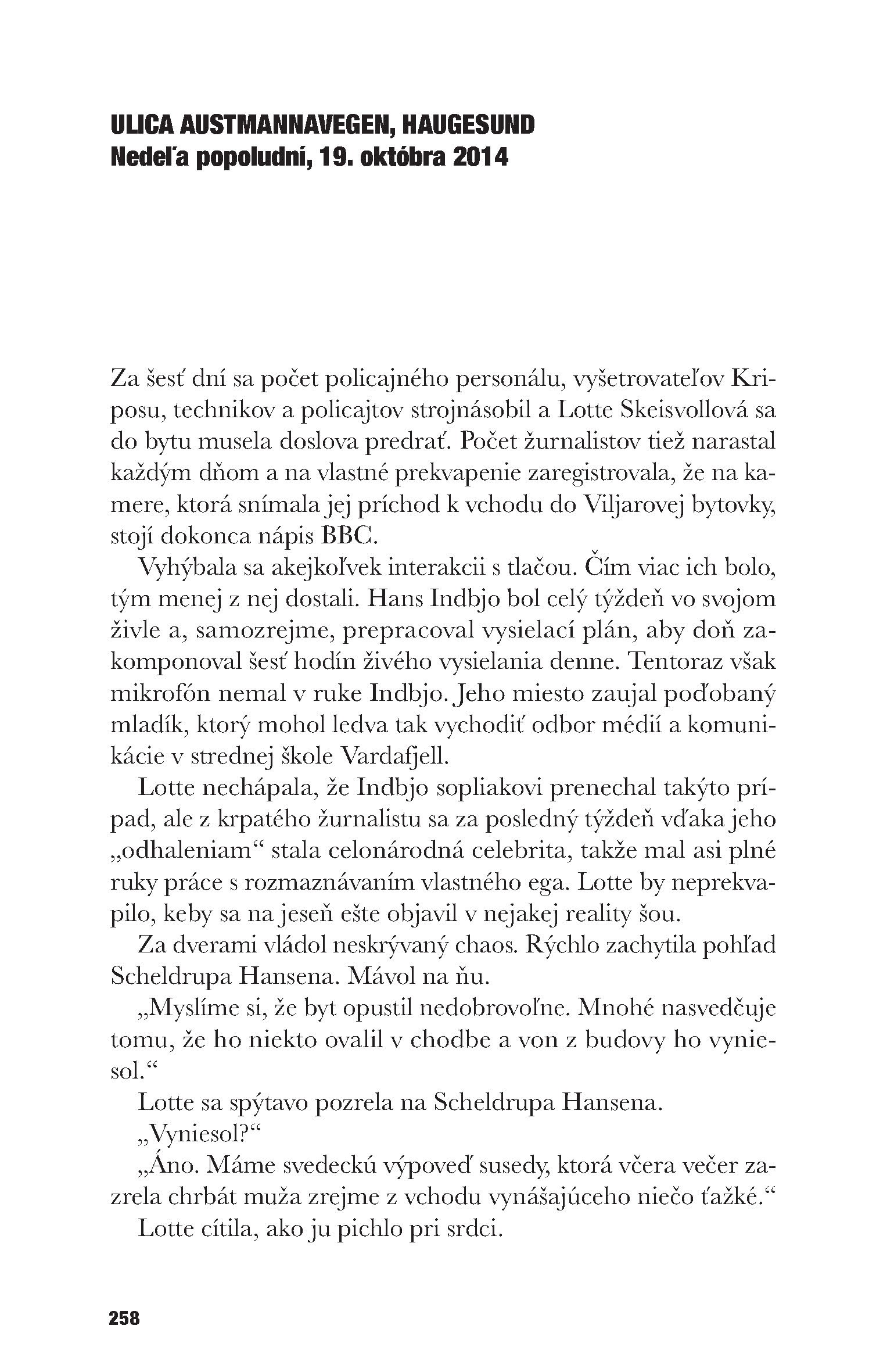 "Lotte ďalej pohľadom kĺzala po miestnosti. Zdanlivý chaos, ktorý jej prezdrádzal všetko a nič zároveň. Prevrátená stolička. Žehliaca doska a žehlička v kuchyni. Zjavne použité na vyžehlenie bielych šiat, čo mala Ranveig na sebe. Noviny, časopisy a knihy. A čo krvavé škvrny na podlahe? Záležalo na tom, že boli práve tam? Záležalo na tom, či to bola krv jeho alebo jej? Nezáležalo náhodou na tom, ako sa Ranveig hojdala, keď umierala? Je vôbec podstatné zaznamenávať si všetky tie dáta z tohto aj ostatných miest činu? Dokázali by vôbec nájsť čokoľvek, čo by si vrah neprial, aby našli?"