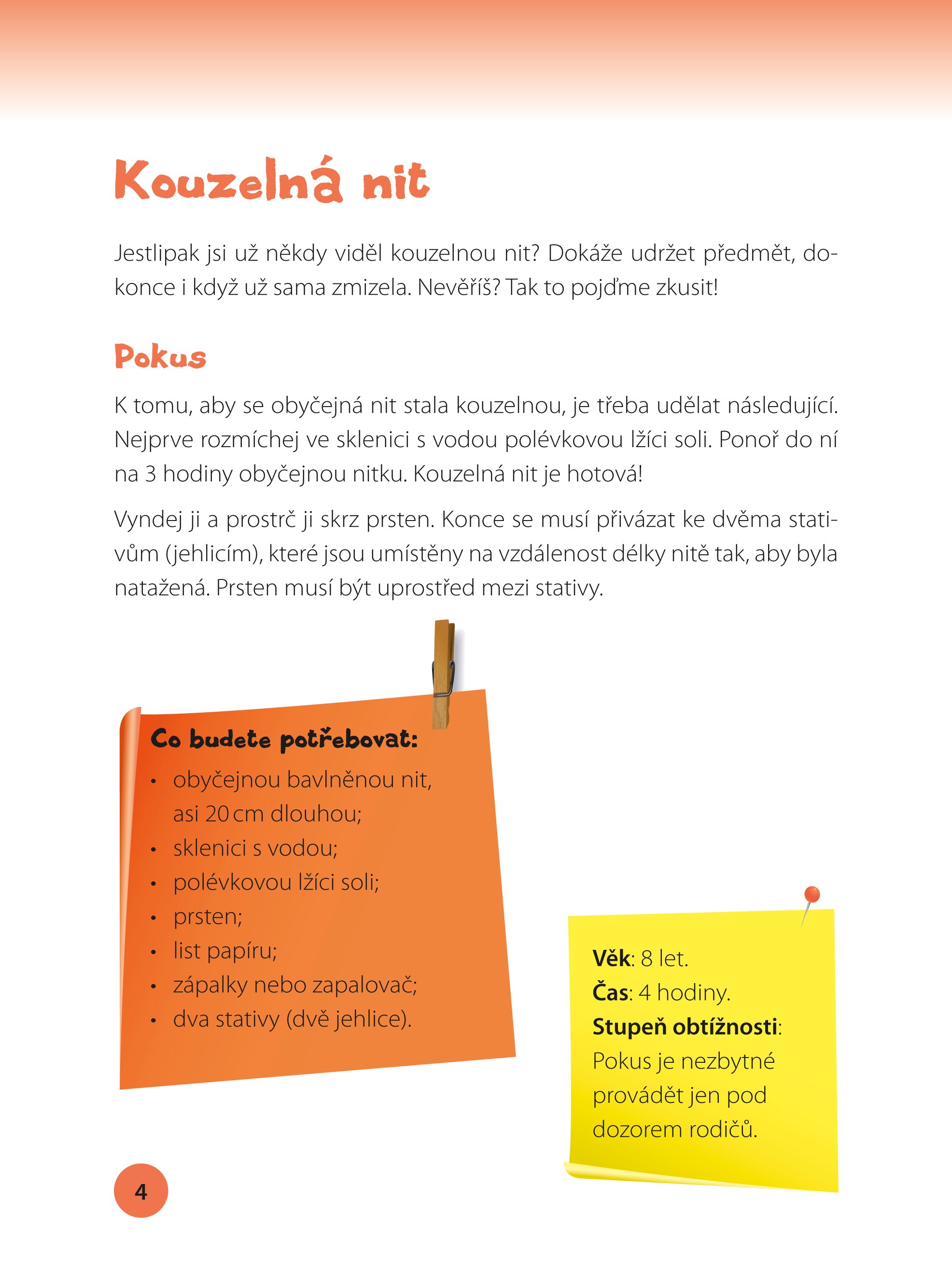 Zábavná je již samotná příprava experimentu, poučné je pak pozorování a zkoumání zákonitostí z oblasti fyziky, chemie i biologie. V závěru každého experimentu se děti dozví zjednodušené vysvětlení pozorovaného jevu, které je však může nasměrovat k dalšímu a podrobnějšímu zkoumání.