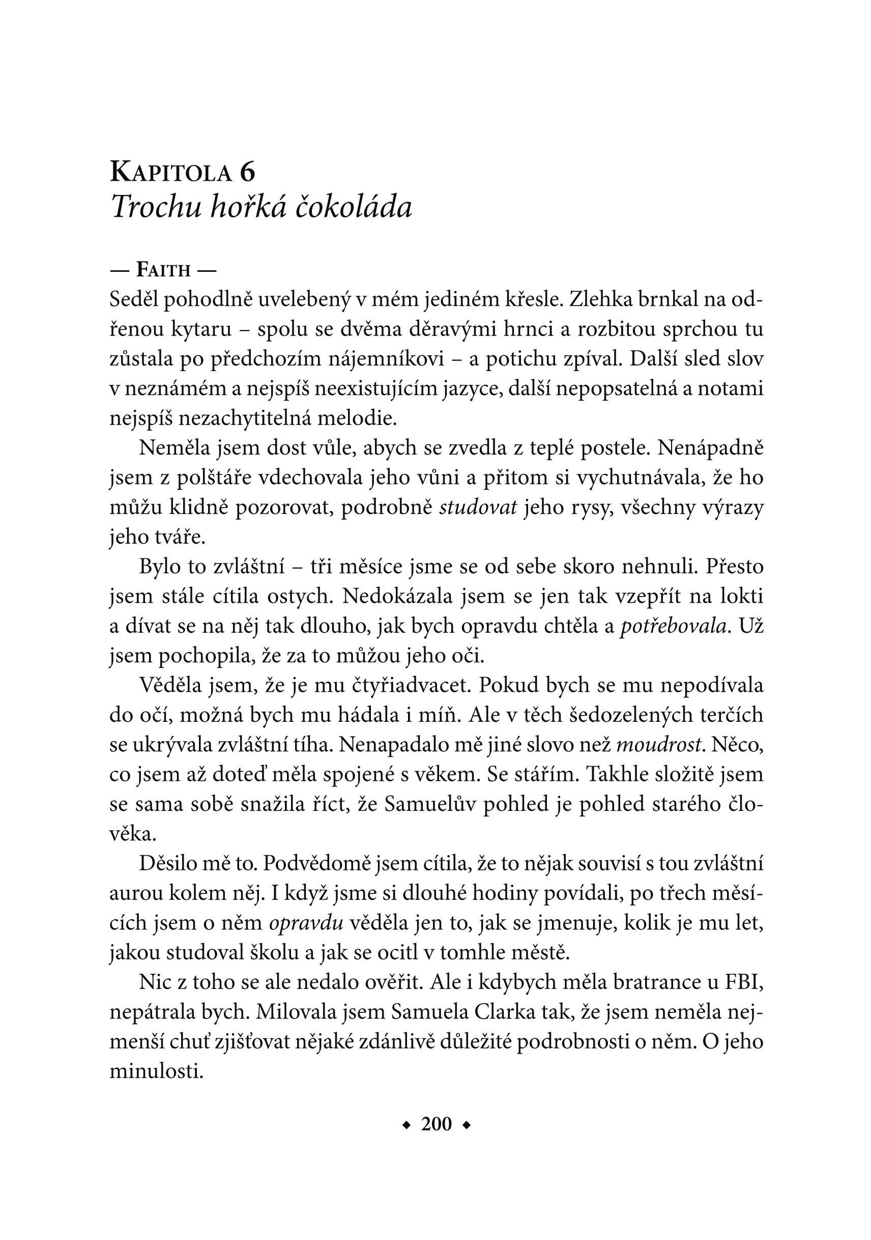 Faith se nechá vtáhnout do Samuelova světa. Dovolí, aby ten její, nudný a šedivý, od základu proměnil. Ale co když je Samuelova výjimečnost jiného druhu, než si Faith myslela? Bude její víra v zázraky stačit k tomu, aby ji Samuel miloval i v jejím lidském, obyčejném světě?