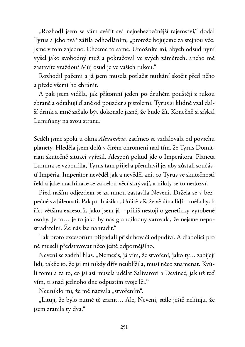 Nemesis a Sidonie jsou spolu od malička a jsou na sebe napojené jako sestry. Když se Sidoniin otec přidá na stranu rebelů a je Imperátorem žíznícím po moci prohlášen za kacíře, přichází odplata. Sidonie je povolána na galaktický dvůr jako rukojmí. Její přítomnost má zajistit senátorovu poslušnost a držet ho tak v šachu. Je jisté, že Sidonii hrozí smrt a proto existuje jen jediná možnost: Nemesis se musí stát Sidonií a odjet na dvůr místo ní.