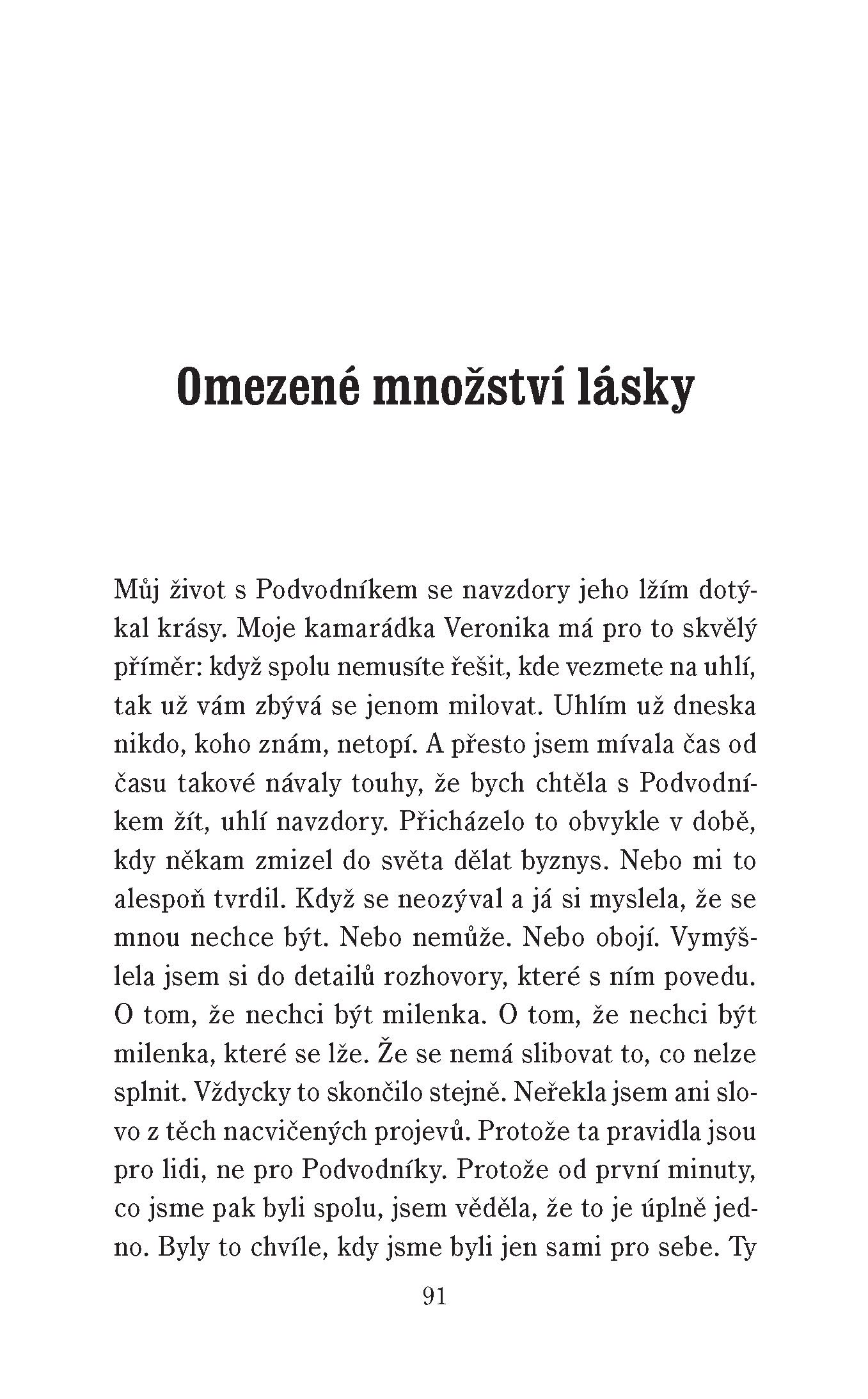 Prý se vám v životě věci nepřihodí dvakrát stejně! Tak to je tedy pěkná hloupost. Juliana je toho důkazem. Dvakrát se zamilovala do stejného muže, jemuž říká Podvodník, hlavně proto, že je to podvodník, a ten jí dvakrát zlomil srdce. Ovšem když máte kolem sebe dobré kamarádky, s nimiž to táhnete v dobrém i zlém už od dětství, dá se i nadvakrát zlomené srdce přežít. Juliana má naštěstí po ruce nejlepší přítelkyni Danielu, která i ty největší průšvihy komentuje s humorem a nadhledem, a před sebou nové výzvy, nová setkání a novou naději, že ji v životě čeká ještě spousta věcí. A také dojde k poznání, že v lásce můžete chvilku prohrávat, ale nikdy to nesmíte vzdát. A kdybyste už opravdu nevěděly kudy kam – kupte si nové boty. Protože to je ten nejlepší lék na všechny smutky.