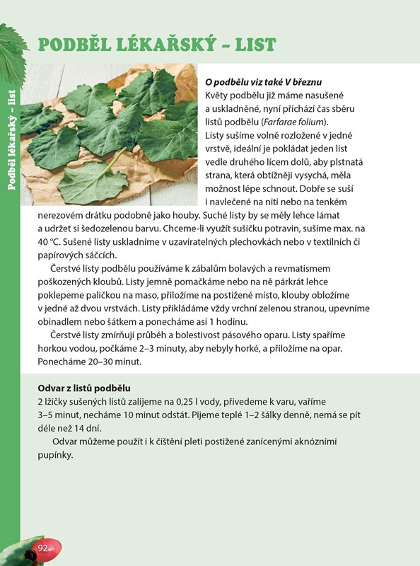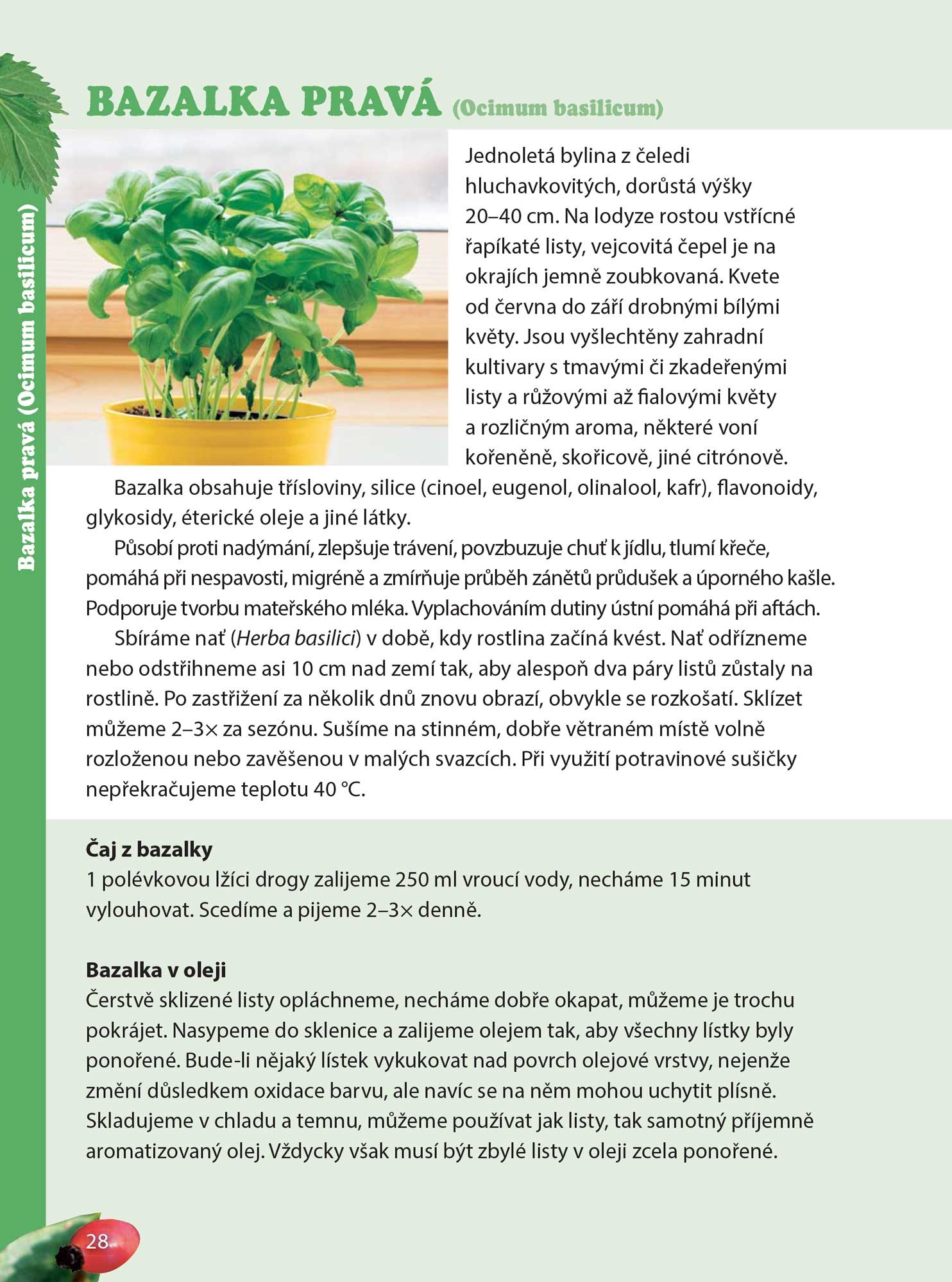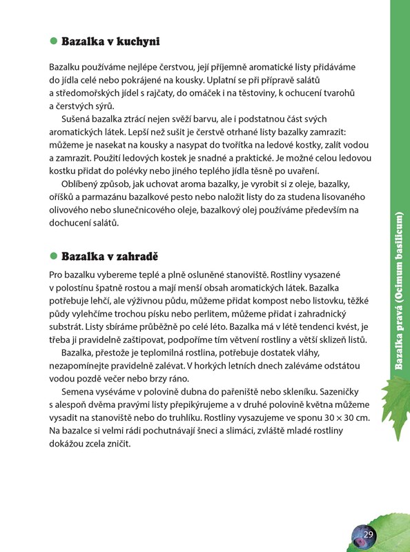 Jejich popisy, léčivé či chuťové vlastnosti, požadavky potřebné k růstu. Kdo chce mít své vlastní bylinky po ruce a má balkon, zahrádku, či alespoň vhodné místo v bytě, pak se zde dozví, jak a v čem je pěstovat. A to jak klasické „kuchyňské“ bylinky, tak i léčivky vhodné pro přípravu přírodních léčiv. Bylinkám volně rostoucím se autorka věnuje v části řazené podle jednotlivých měsíců, podle období, kdy jsou vhodné ke sběru.