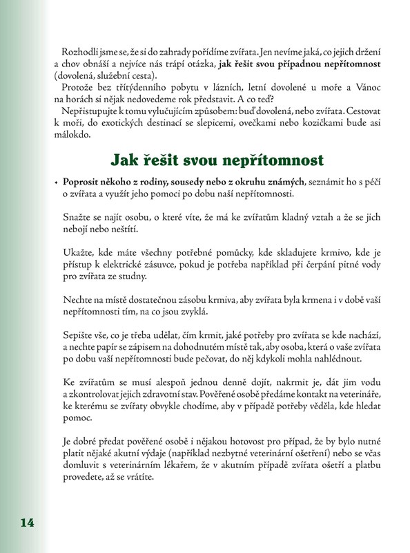 Příručka začínajícího chovatele domácího zvířectva (slepic, hus, kachen, králíků, koz a ovcí), ale také zahrádkáře, který se chce stát milým hostitelem některých volně žijících živočichů a poskytnout jim vlastní zahradu k úkrytu i k možnosti vyhledání potravy.